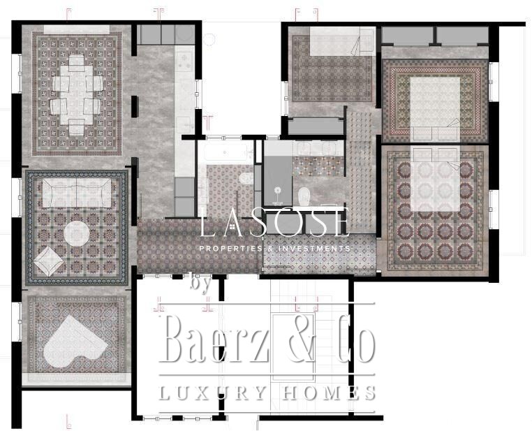 يؤدي المخطط الواسع إلى ثلاث غرف نوم، اثنتان منهما مزدوجتان مع إمكانية الوصول إلى شرفة تطل على فناء داخلي هادئ، ما يضفي شعورًا بالسكينة ويوفر إضاءة طبيعية. أما غرفة النوم الثالثة فتتمتع بإطلالات هادئة على فناء آخر محافظ عليه، مما يعزز من أجواء الراحة داخل المنزل. ويعكس المصعد الزجاجي العصري الاحترام لحداثة الوقت مع الحفاظ على الهيكل الكلاسيكي.