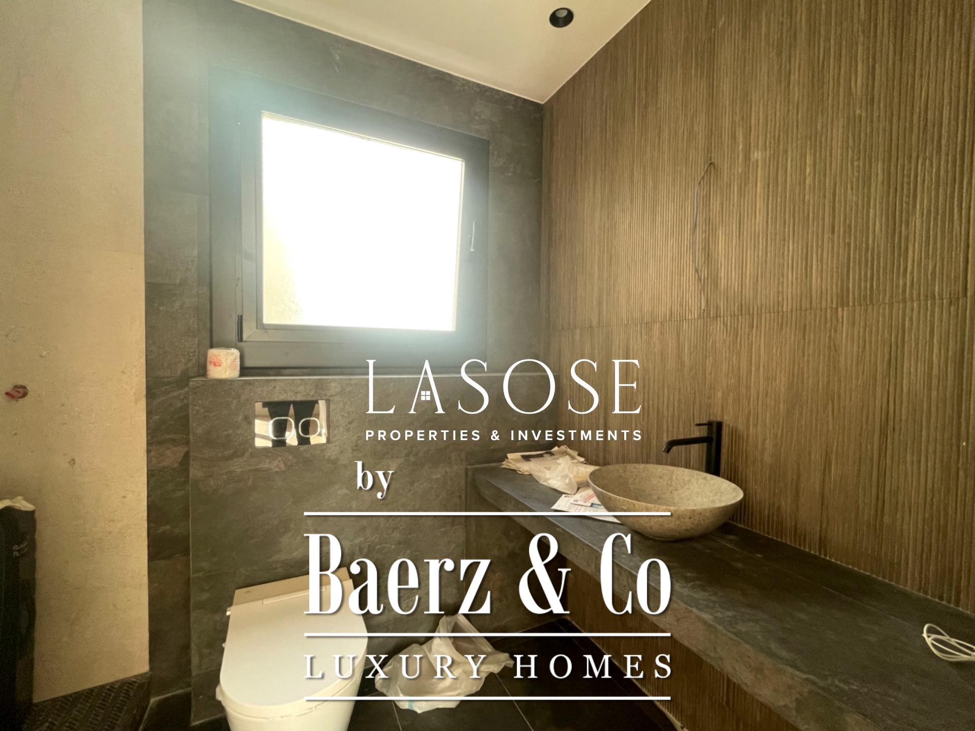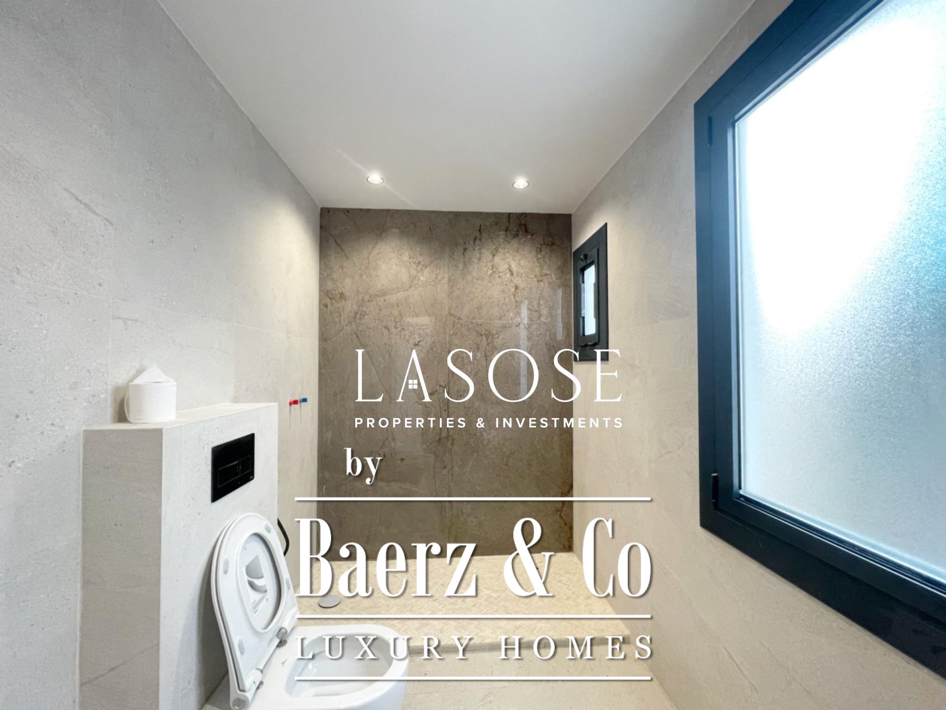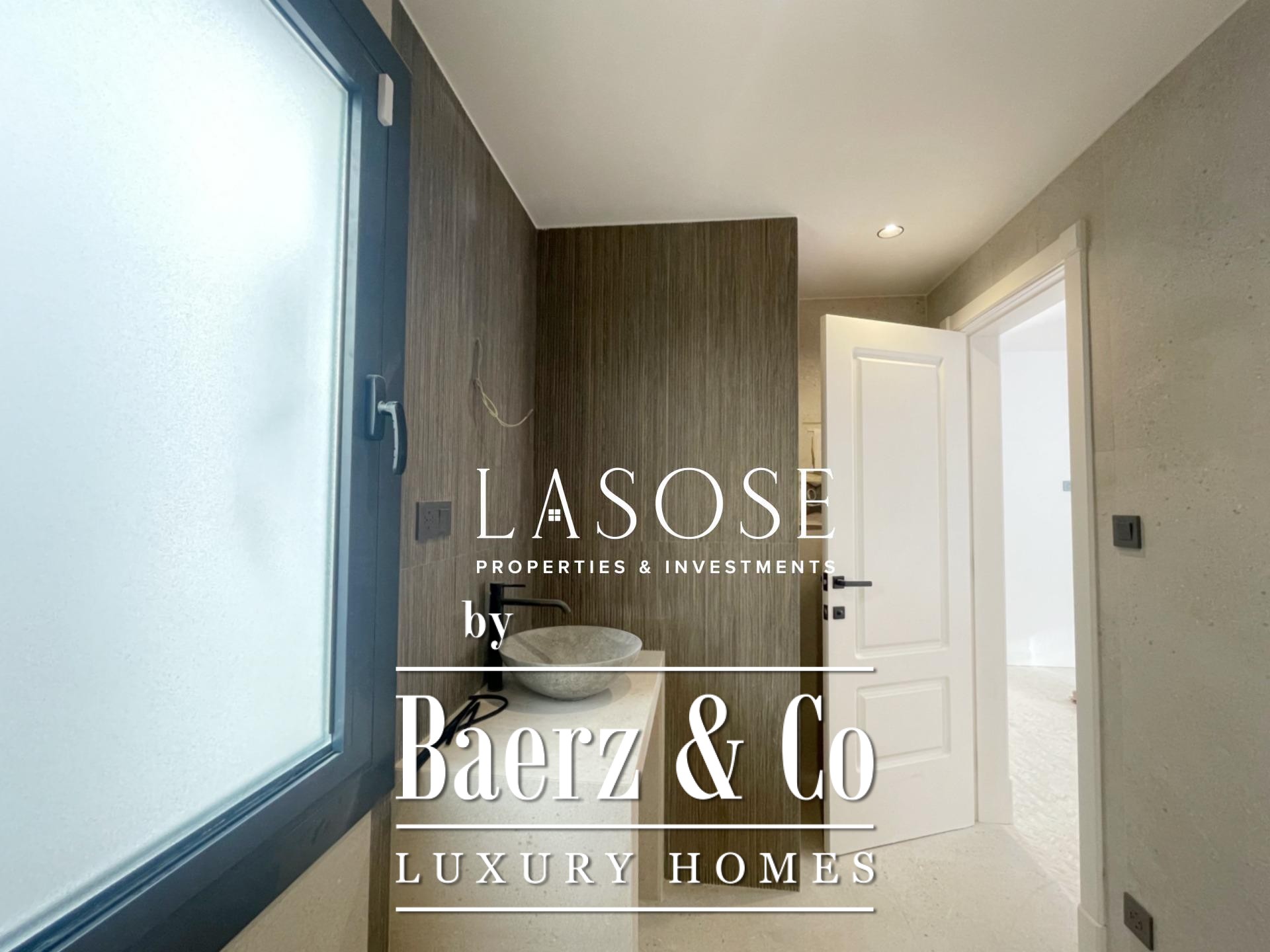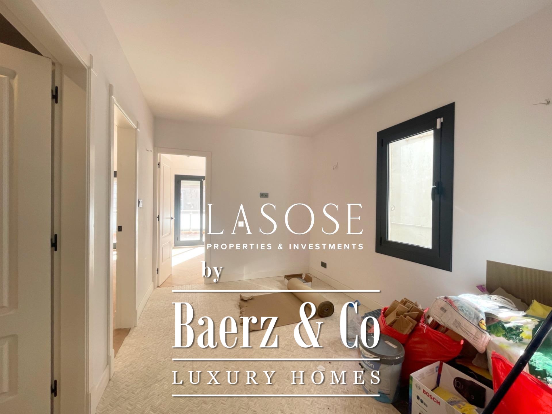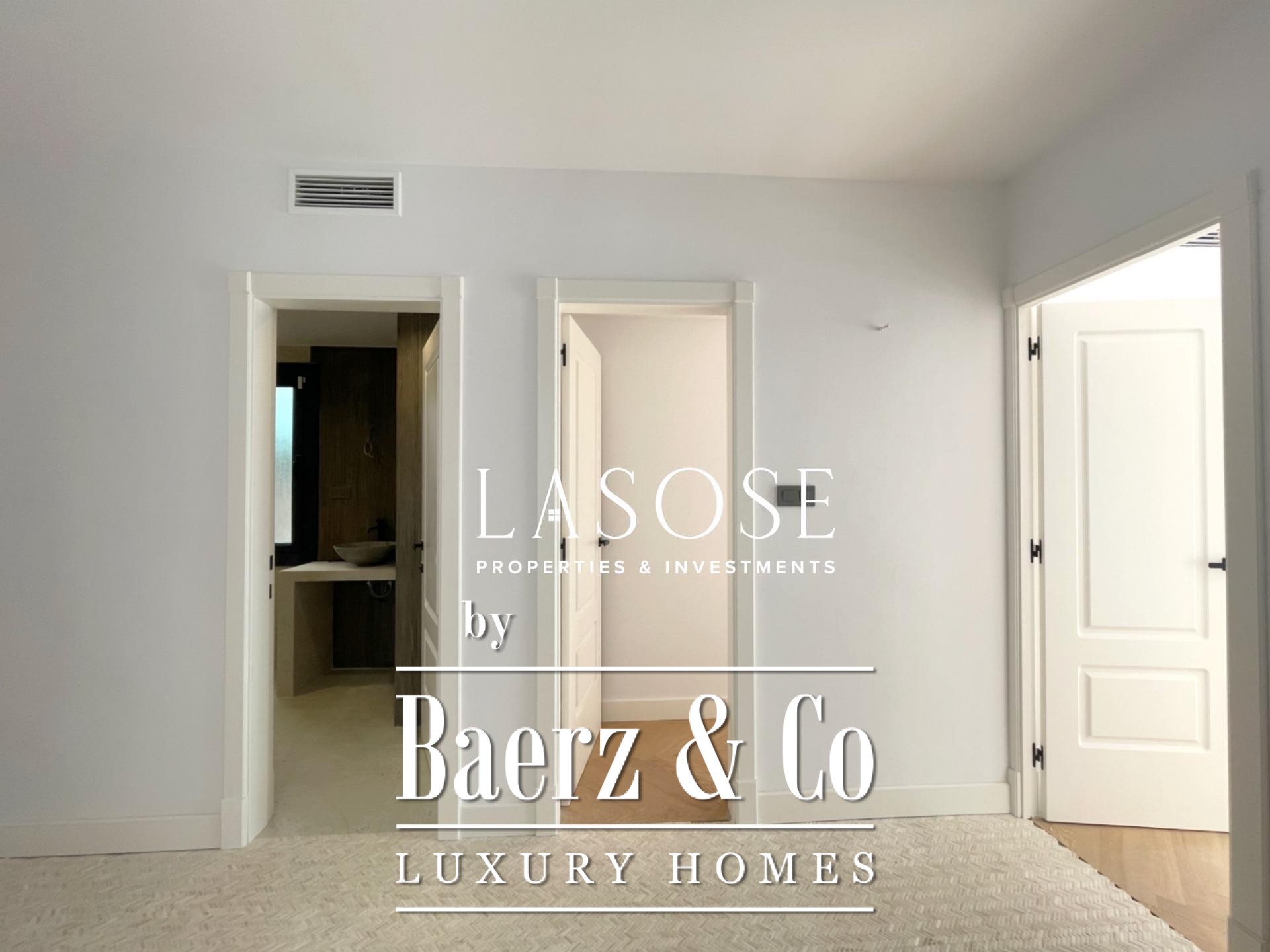 يؤدي المدخل إلى غرفتي نوم مزدوجتين، إحداهما جناح رئيسي فسيح مع حمام داخلي واسع. تحظى كلتا الغرفتين بإمكانية وصول مباشر إلى الشرفة المشمسة، مما يعزز الإضاءة الطبيعية والإحساس بالخصوصية. تضم منطقة النهار مطبخًا عصريًا مع مساحة طعام وغرفة طعام، وكل مساحة منها موجهة نحو الشرفة الكبيرة التي تشكل قلب المنزل.