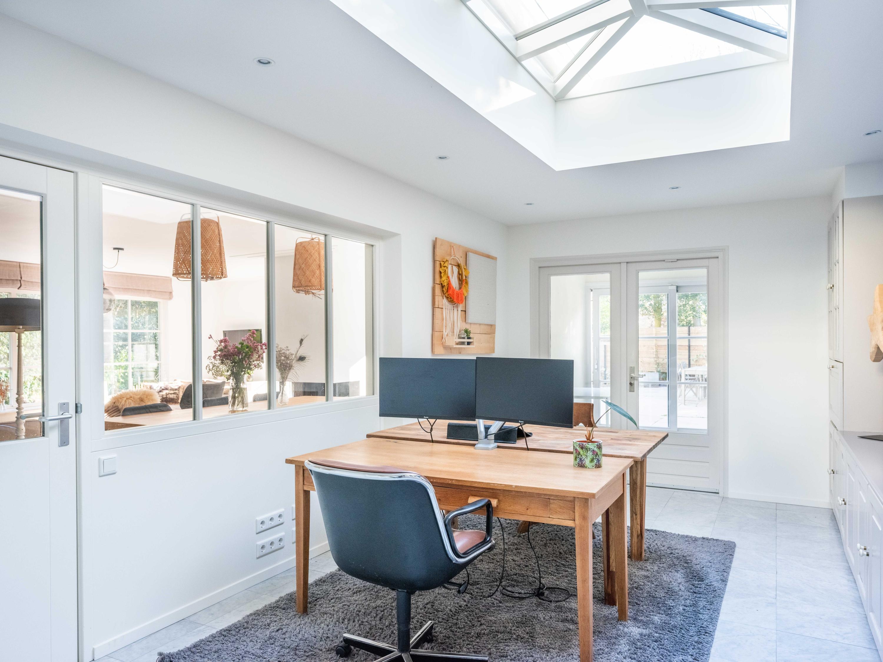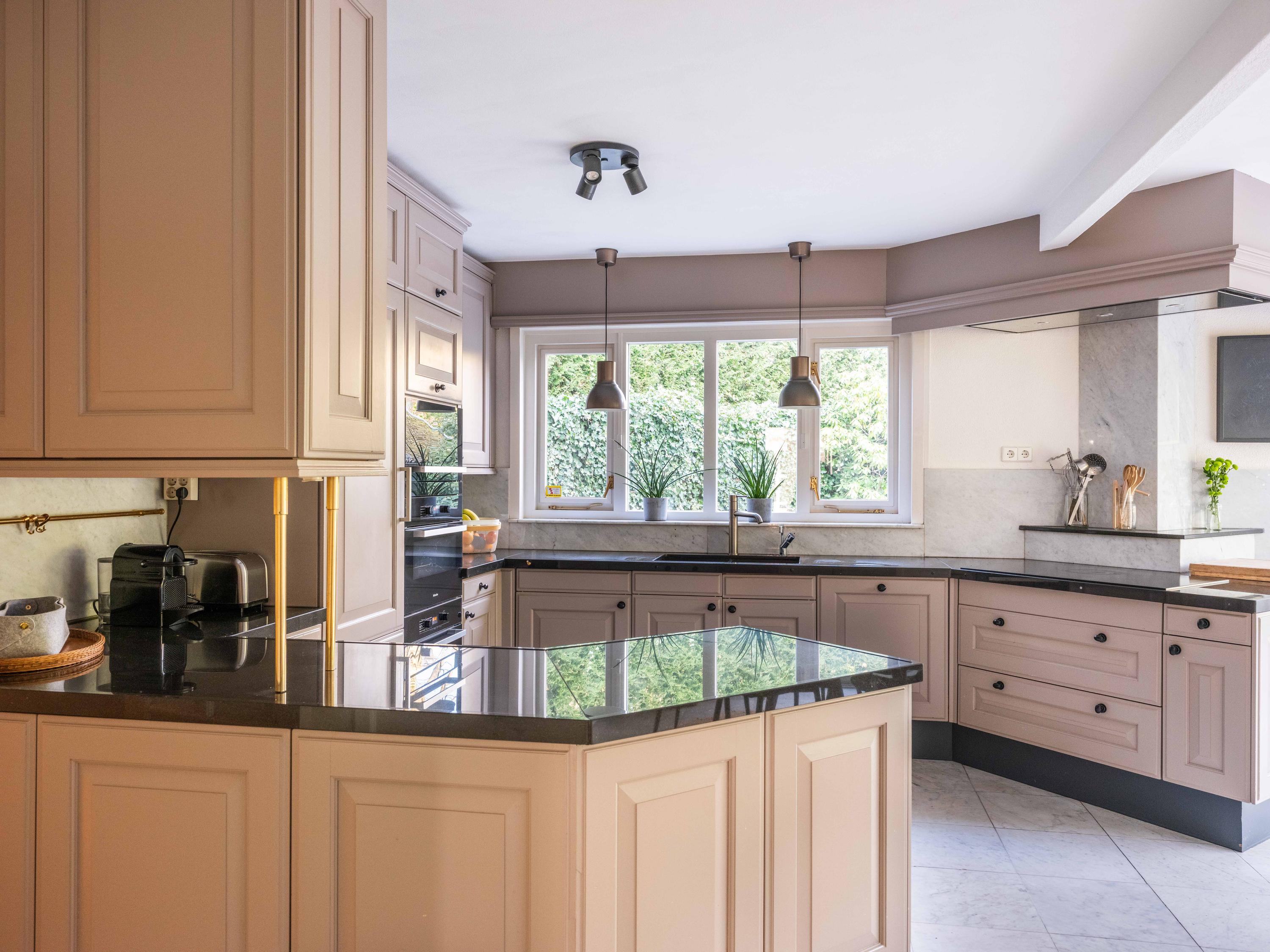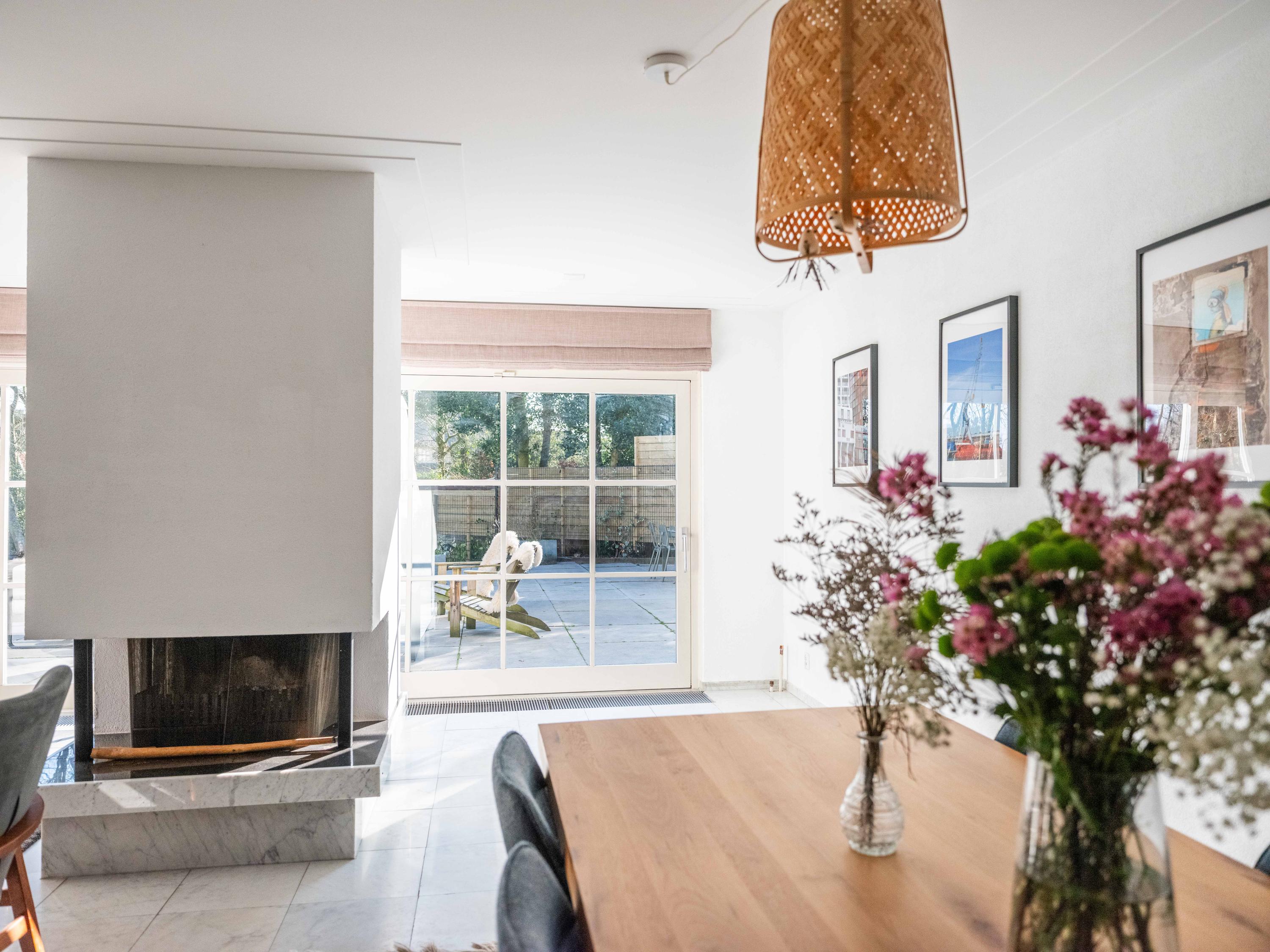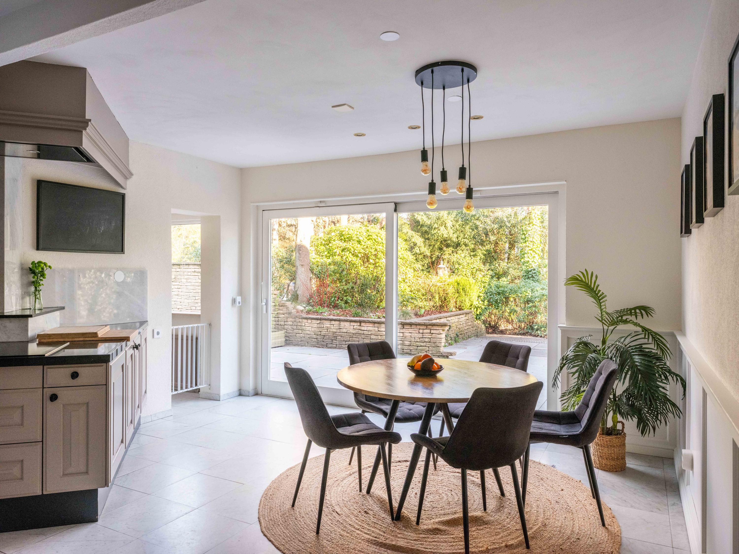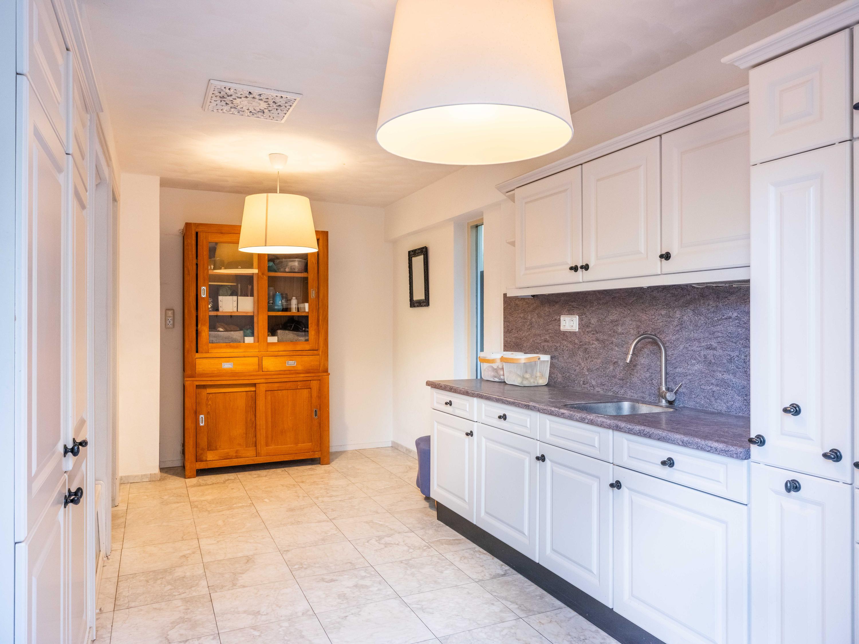 عند الدخول إلى الرواق، تعبر السلم وغرفة الملابس لتصل إلى مطبخ مصمم لأولئك الشغوفين بالطهي، مجهز بموقد حثي بخمس شعلات، صنبور مياه ساخنة (quooker)، جهاز طهي بالبخار وفرنين كومبي. تغمر أشعة الشمس غرفة المعيشة التي تضم مدفأة أبواباً منزلقة تطل على التراس المواجه للحديقة المسوّرة باحترافية. توفر الطابق نفسه مكتباً متعدد الاستخدامات وغرفة غسيل تتصل مباشرة بالخارج، ليتيح تدفقاً سلساً بين العمل والاسترخاء وخصوصية المنزل.