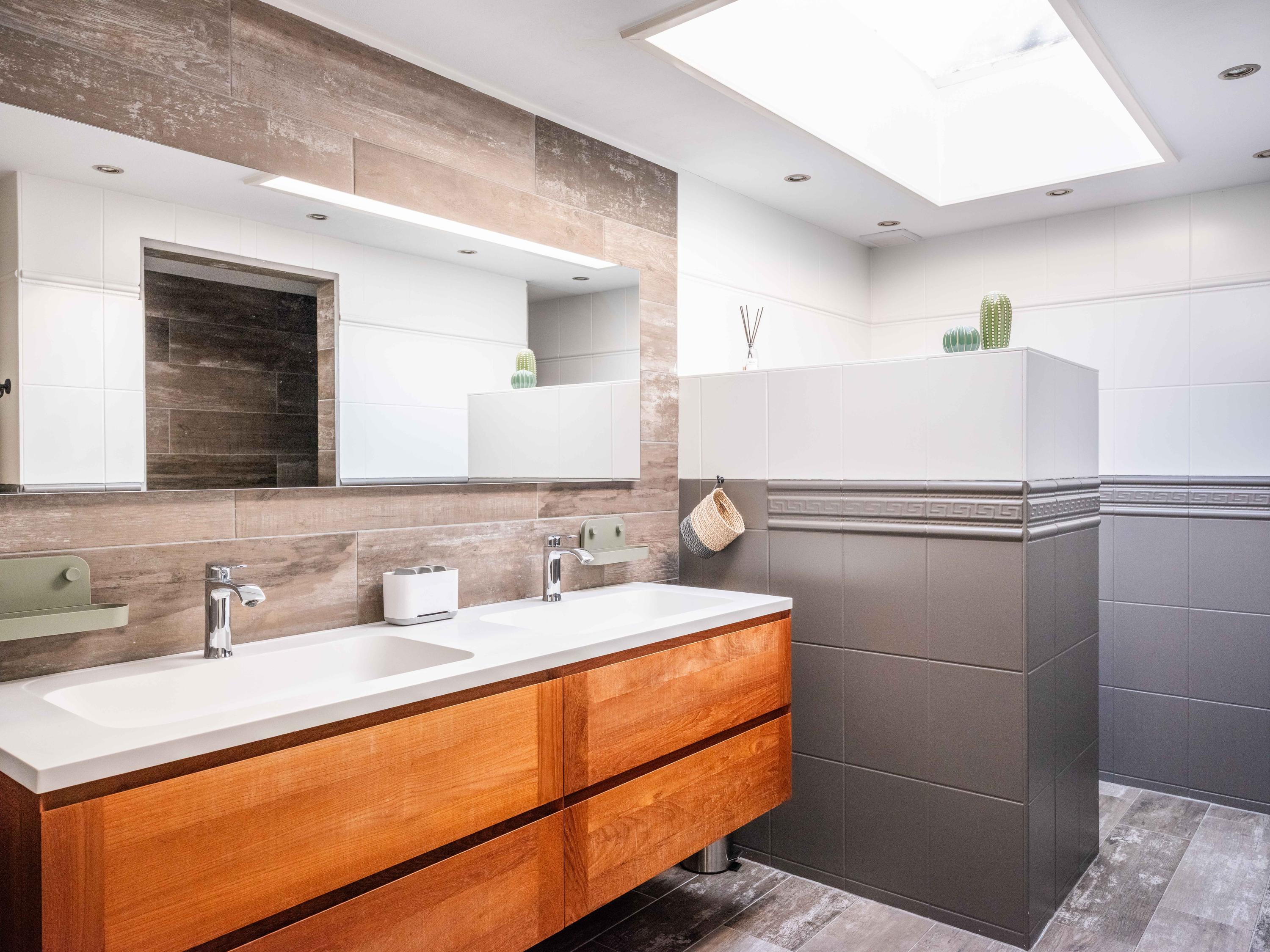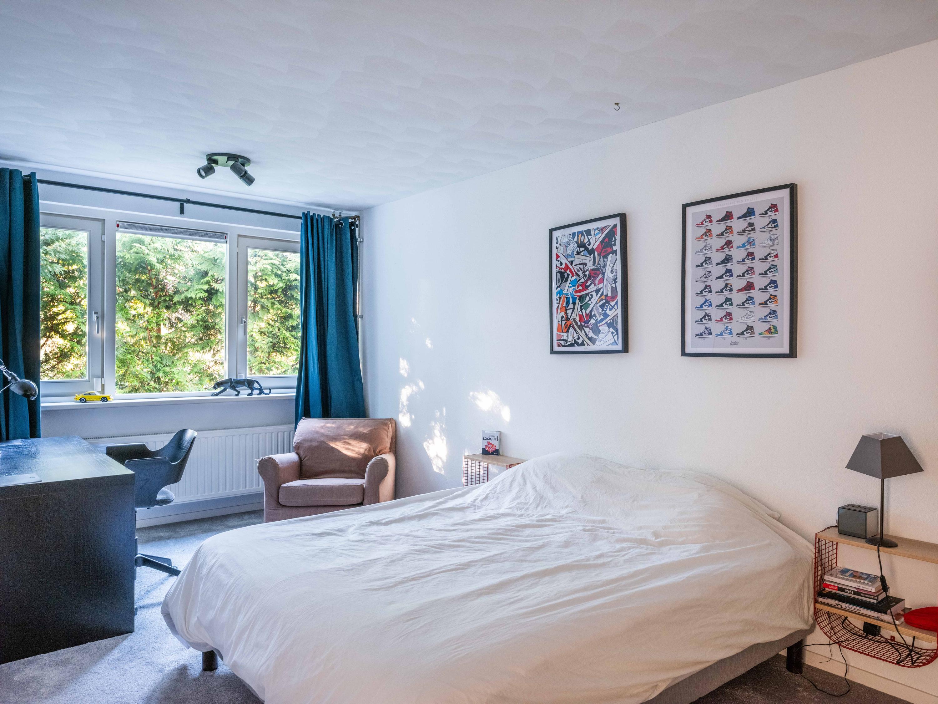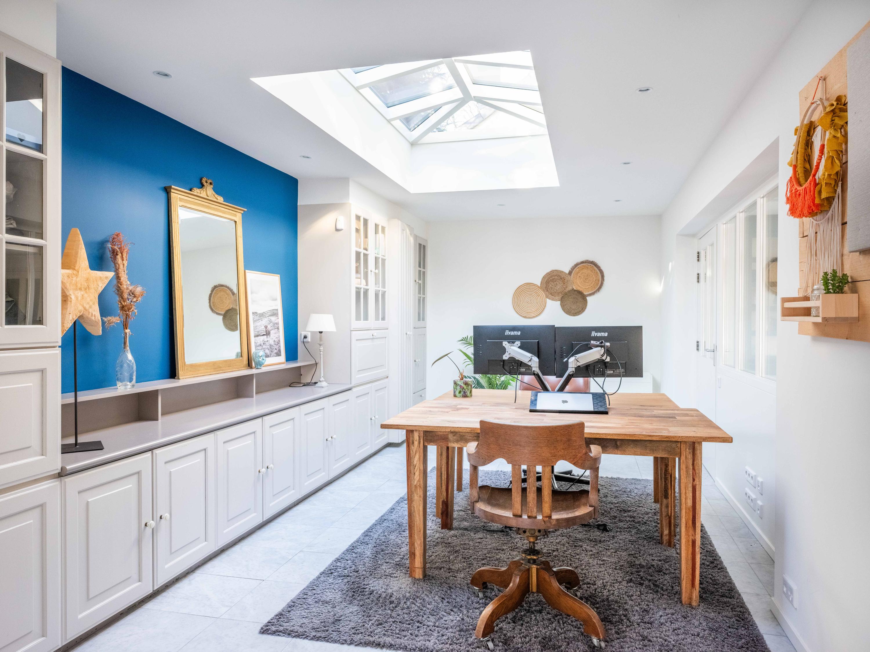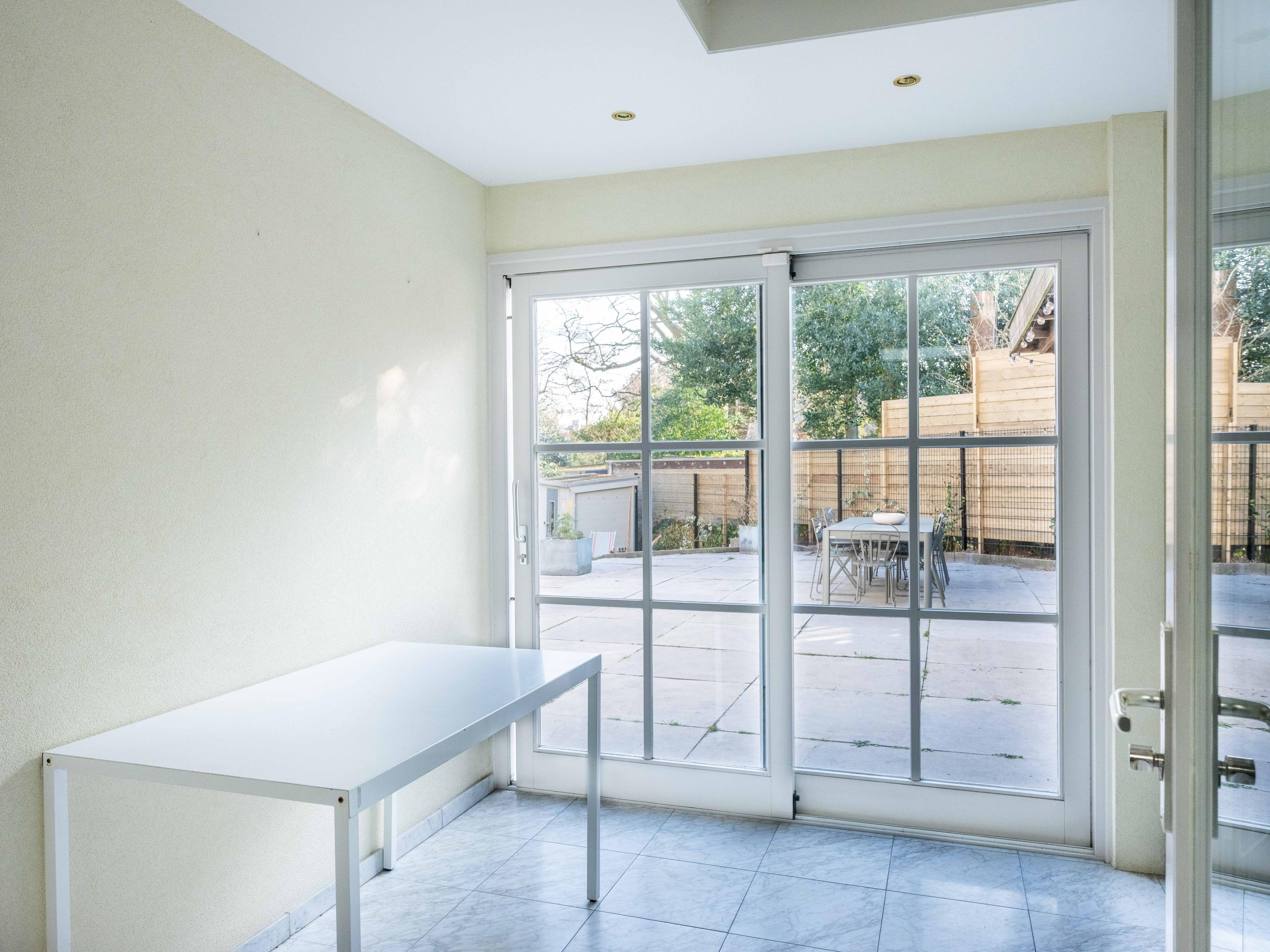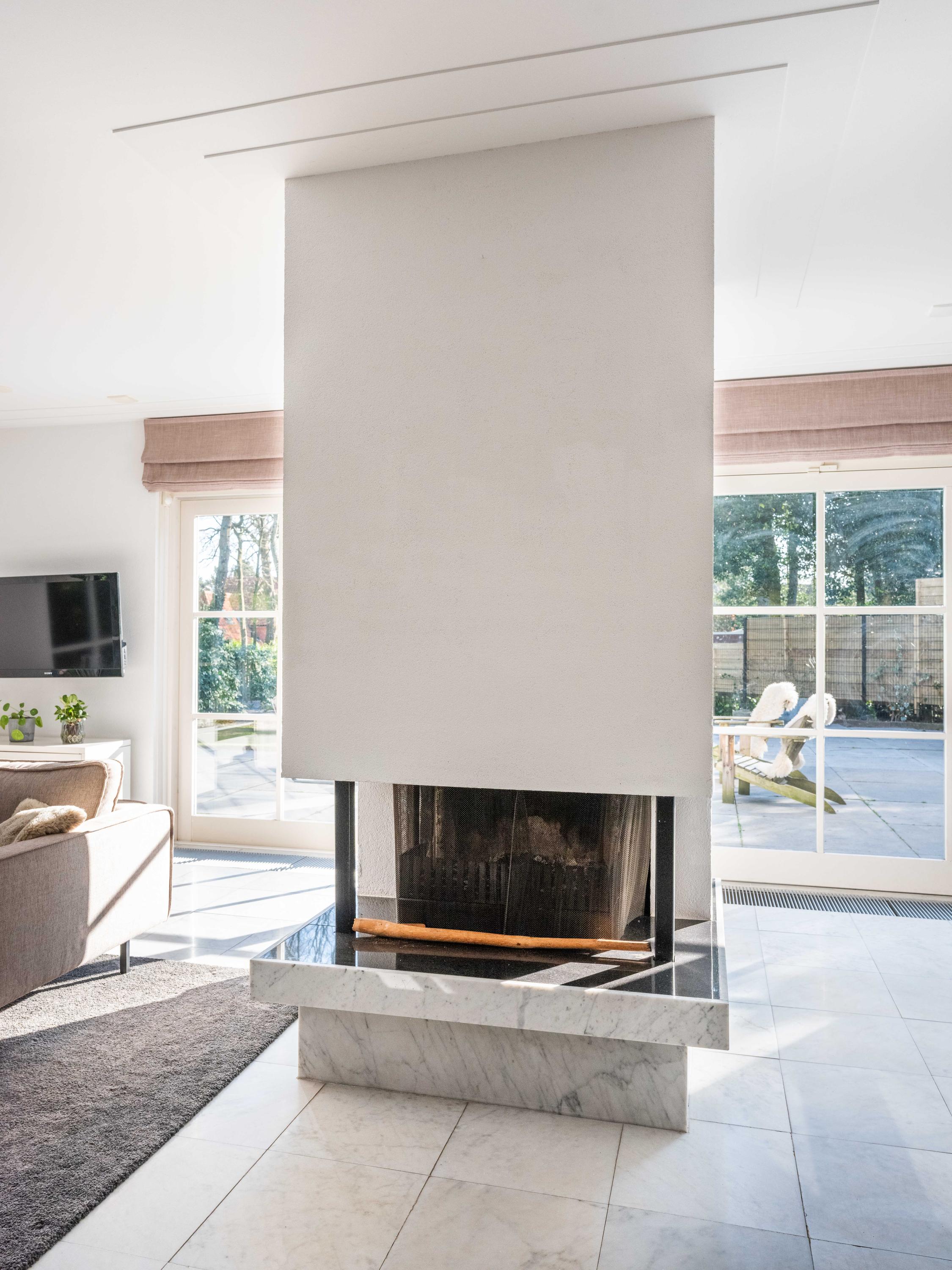 عند الدخول إلى الرواق، تعبر السلم وغرفة الملابس لتصل إلى مطبخ مصمم لأولئك الشغوفين بالطهي، مجهز بموقد حثي بخمس شعلات، صنبور مياه ساخنة (quooker)، جهاز طهي بالبخار وفرنين كومبي. تغمر أشعة الشمس غرفة المعيشة التي تضم مدفأة أبواباً منزلقة تطل على التراس المواجه للحديقة المسوّرة باحترافية. توفر الطابق نفسه مكتباً متعدد الاستخدامات وغرفة غسيل تتصل مباشرة بالخارج، ليتيح تدفقاً سلساً بين العمل والاسترخاء وخصوصية المنزل.