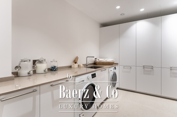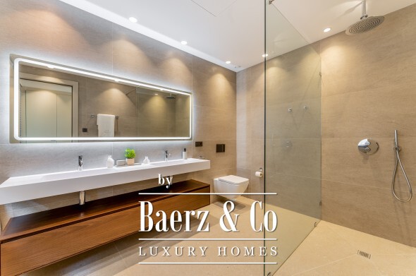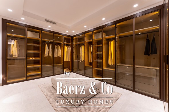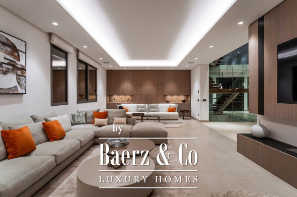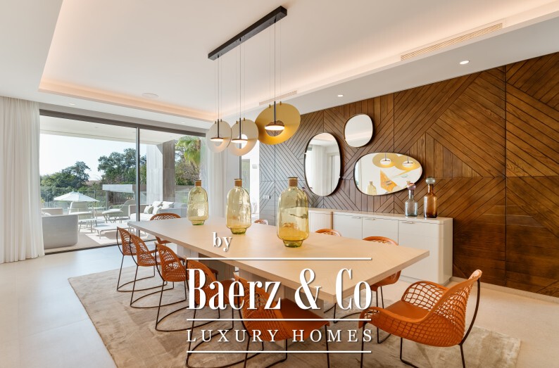 يقدم الطابق الرئيسي توازناً بين المساحة والطابع الرسمي: صالون معيشة، غرفة طعام لـ12 شخصاً، ومطبخ مجهز بالكامل مع جزيرة مركزية لخلق بيئة تجمع بين الحياة اليومية والاستقبال. ارتباط الفراغ الداخلي بالشرفة والحدائق يفتح عالماً خارجياً مميزاً بمطبخ صيفي، أماكن طعام في الهواء الطلق، شواية، وحوض سباحة خاص محاط بحدائق منسقة بعناية. تتبع الإضاءة مسارها عبر النوافذ الممتدة من الأرضية إلى السقف.