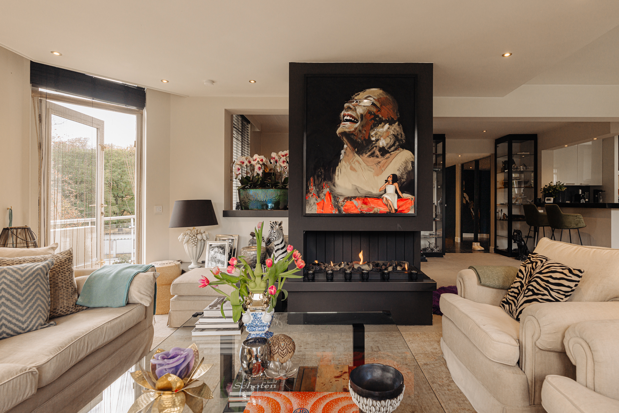 Ruime woonkamer (drie samengetrokken kamers) met gashaard, grote raampartijen en daardoor prachtig uitzicht. Twee balkons omringd door groen.