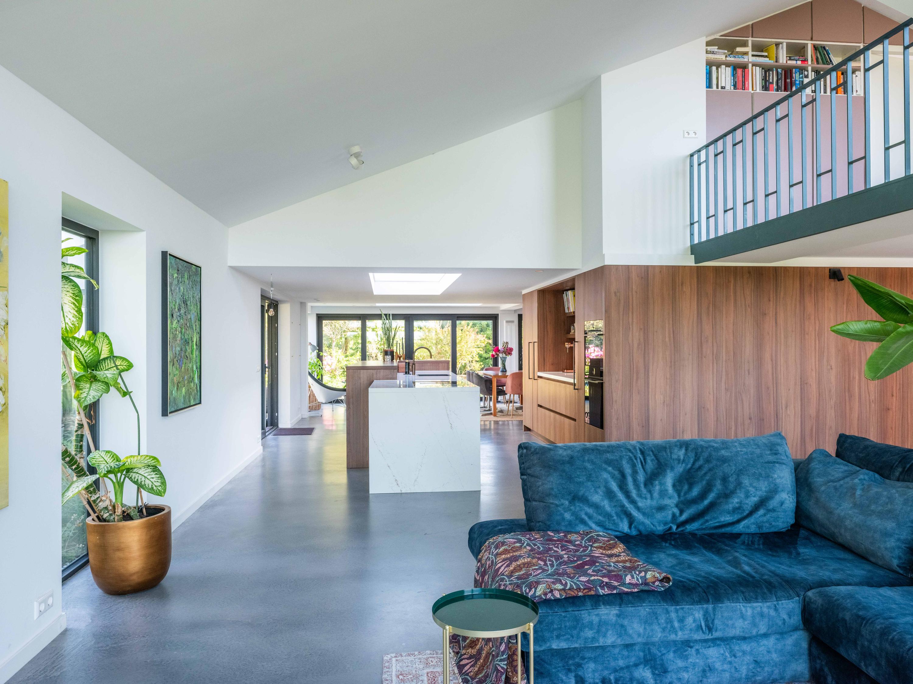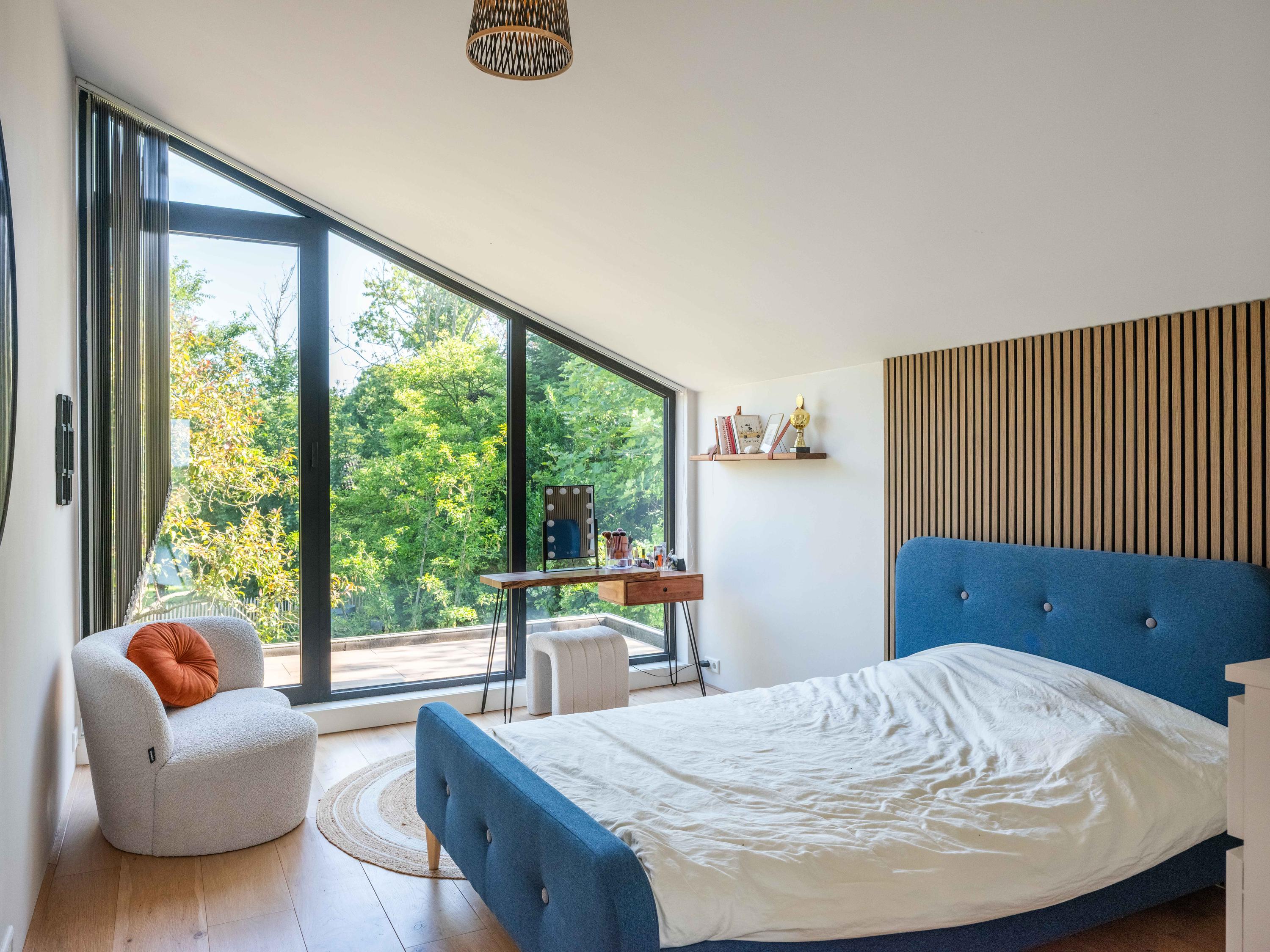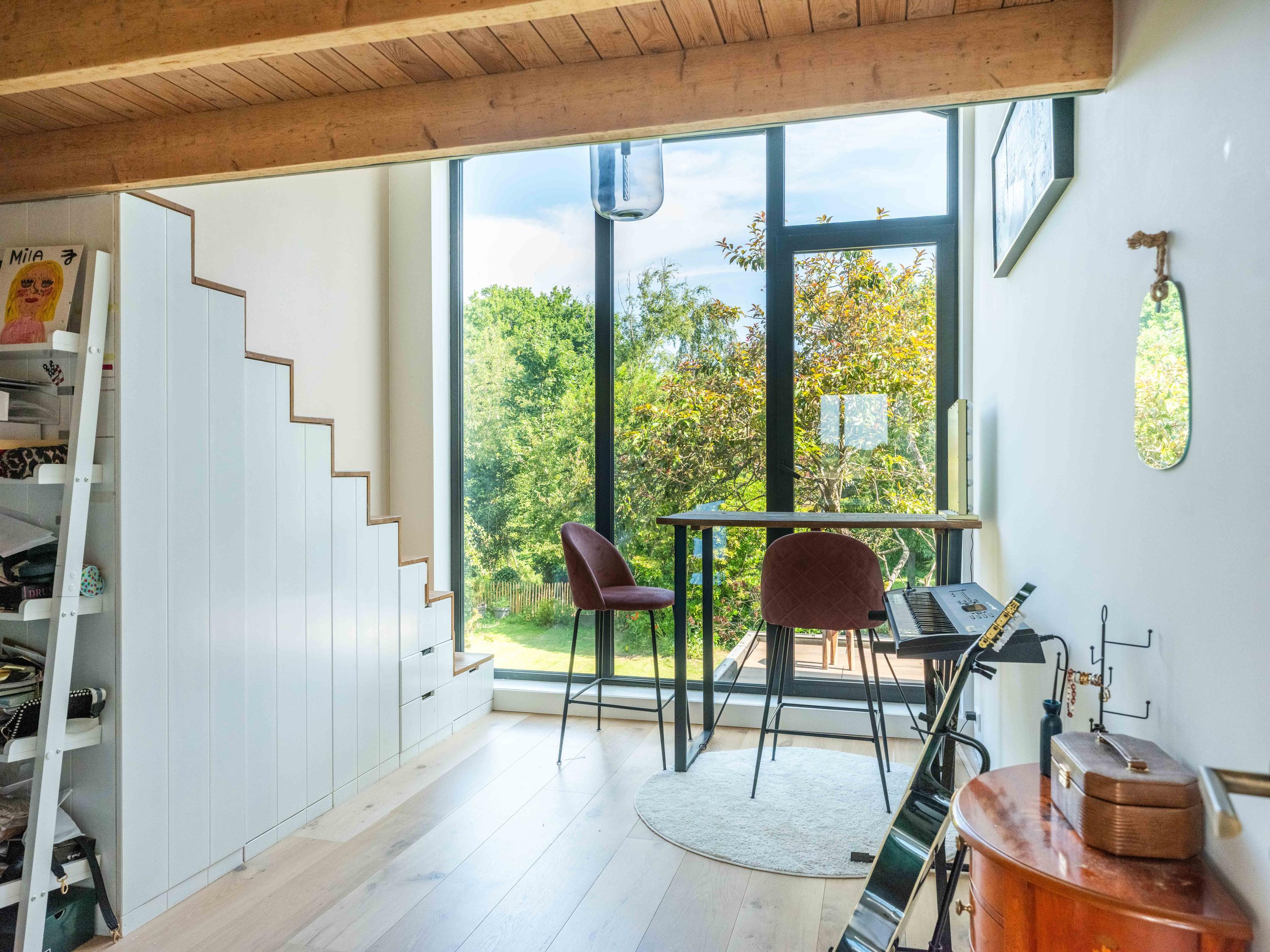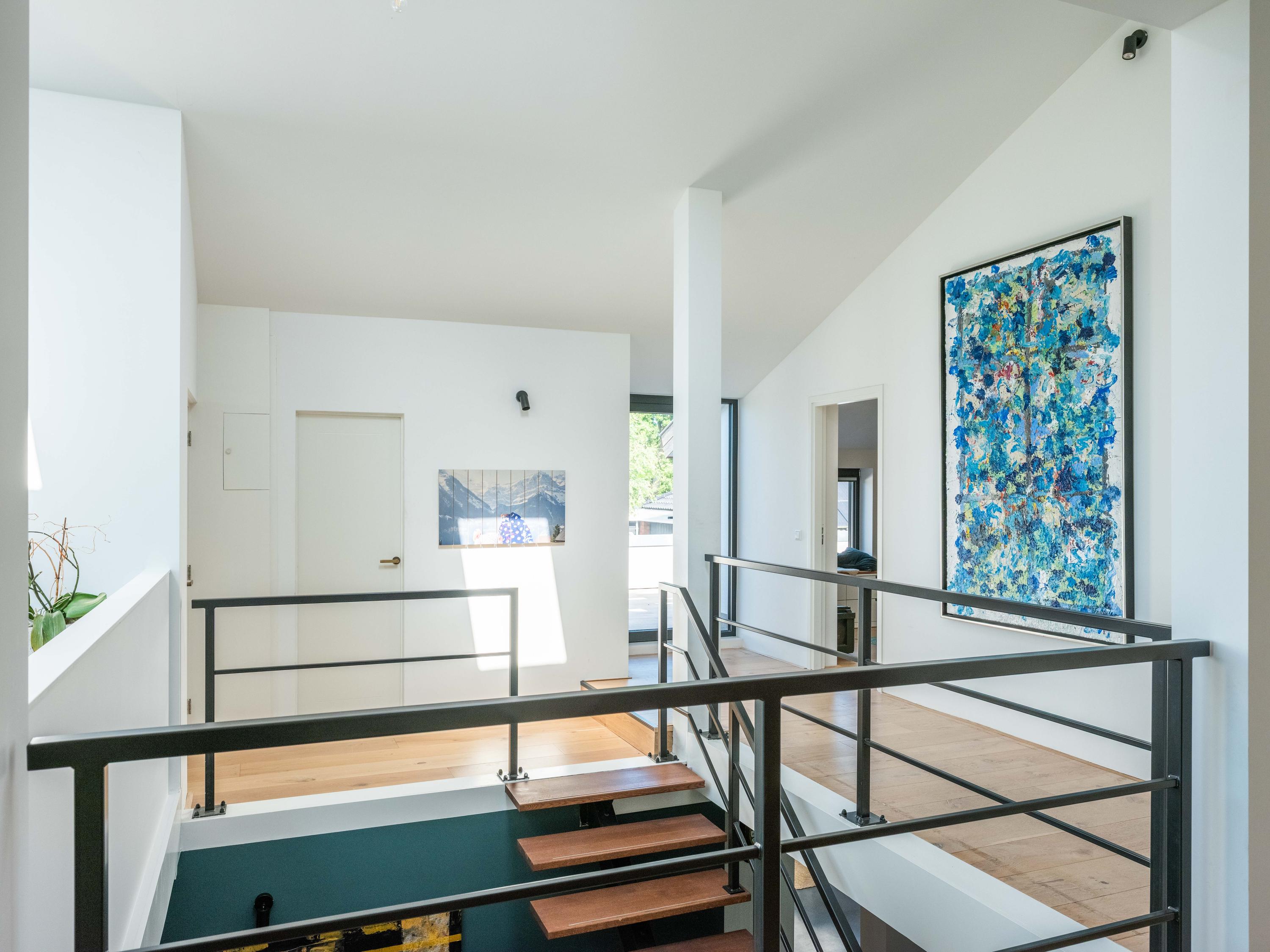 Im Obergeschoss finden sich drei Schlafzimmer, ein vielseitiges Büro mit Panoramablick, ein Yoga-Raum sowie eine spielerisch gestaltete Galerie – ideal für Familienleben und kreative Aktivitäten. Ein zweites vollwertiges Bad, separater Hauswirtschaftsraum und zahlreiche durchdachte Details sorgen für ein stimmiges Komfortgefühl.