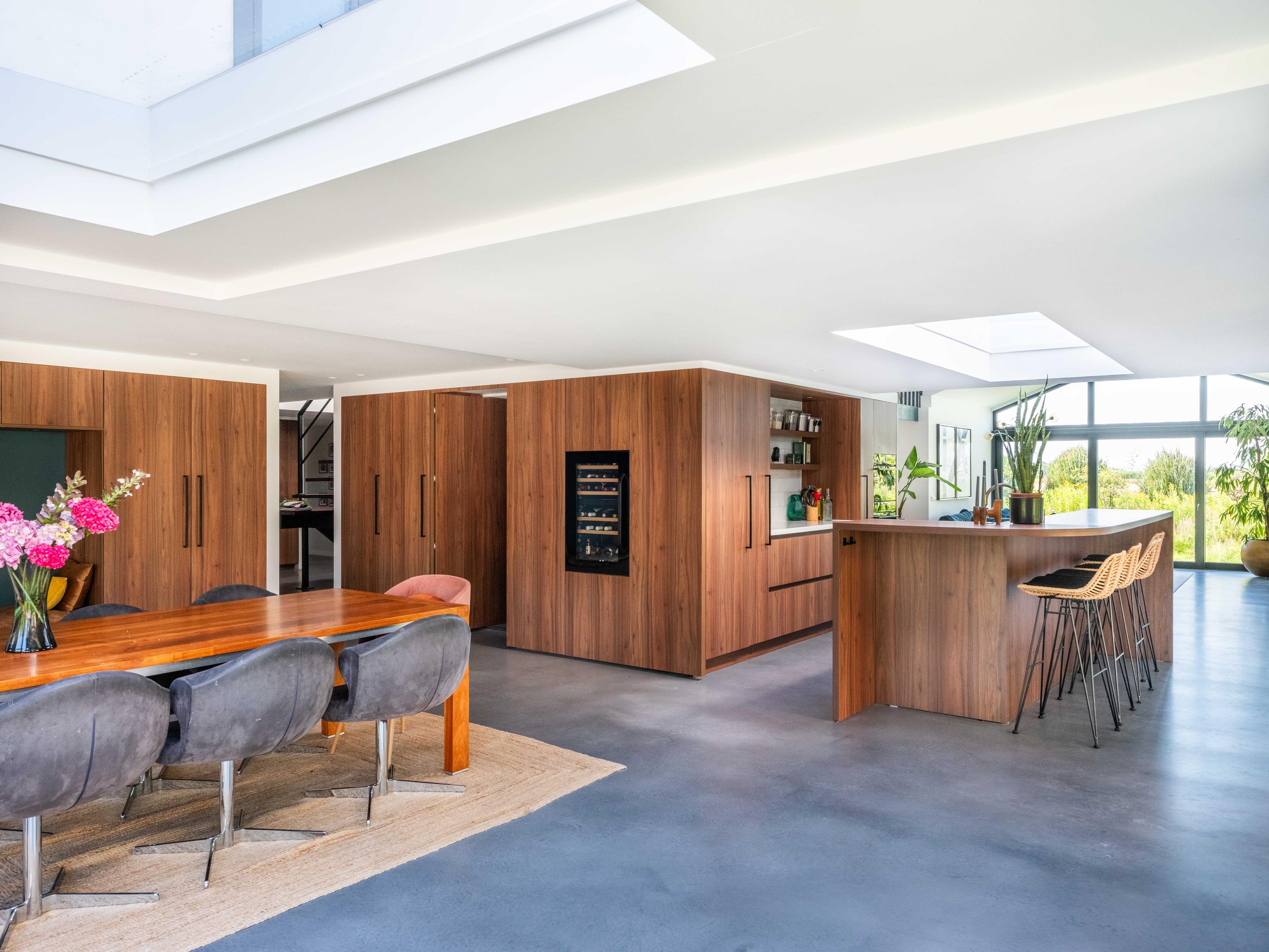 Das lichtdurchflutete Erdgeschoss empfängt Sie mit einer maßgeschneiderten Eingangshalle, einem einladenden Wohnzimmer mit Weitblick und einer Küche mit hochwertigen Einbaugeräten, Weinklimaschrank sowie einer architektonisch gestalteten Walnusswand, die einen versteckten Hauswirtschaftsbereich offenbart. Die Hauptsuite im Erdgeschoss bietet einen begehbaren Kleiderschrank sowie ein Spa-Badezimmer mit Walk-in-Dusche, Badewanne, Doppelwaschbecken, Fußbodenheizung und direktem Gartenzugang.