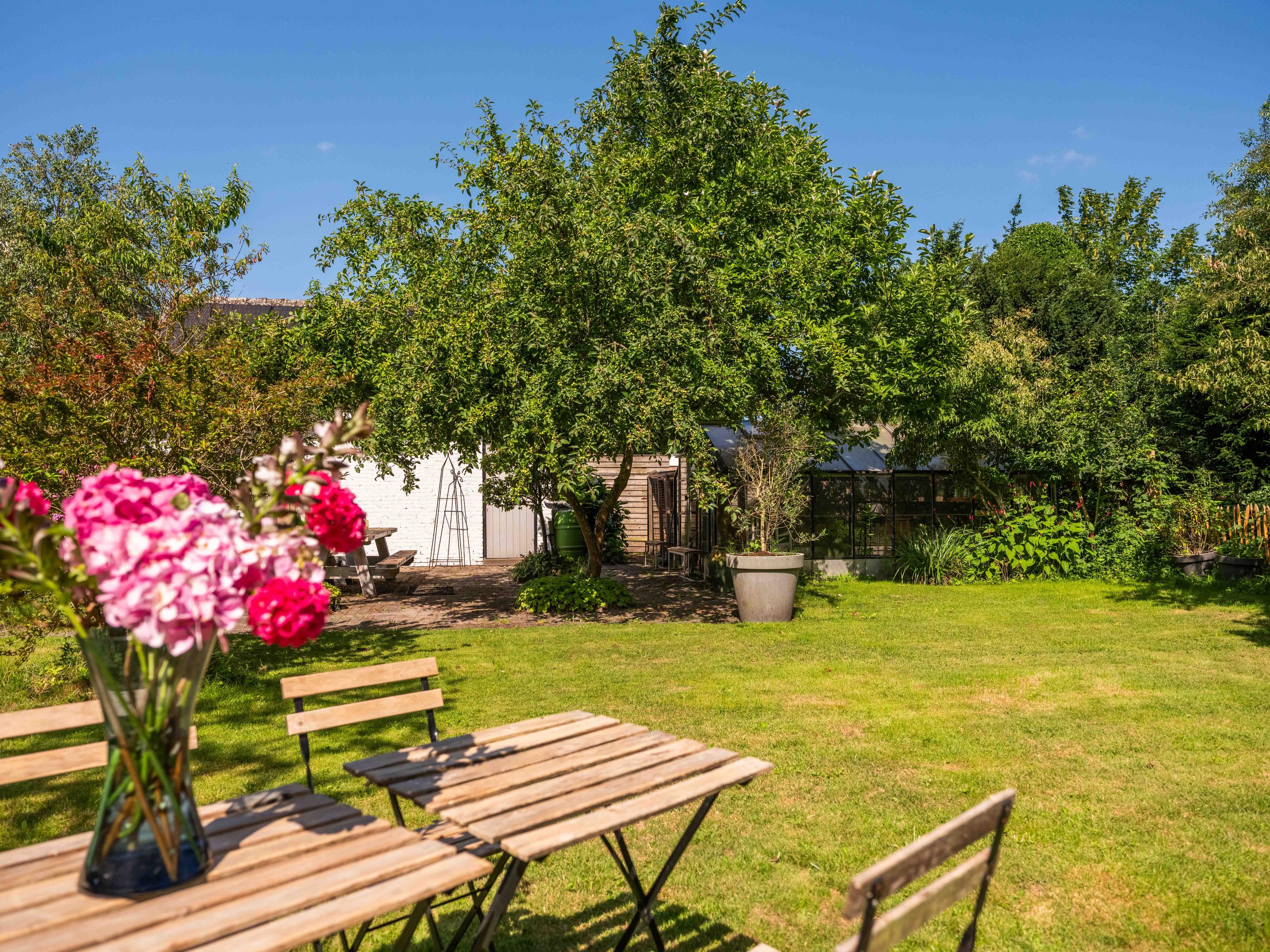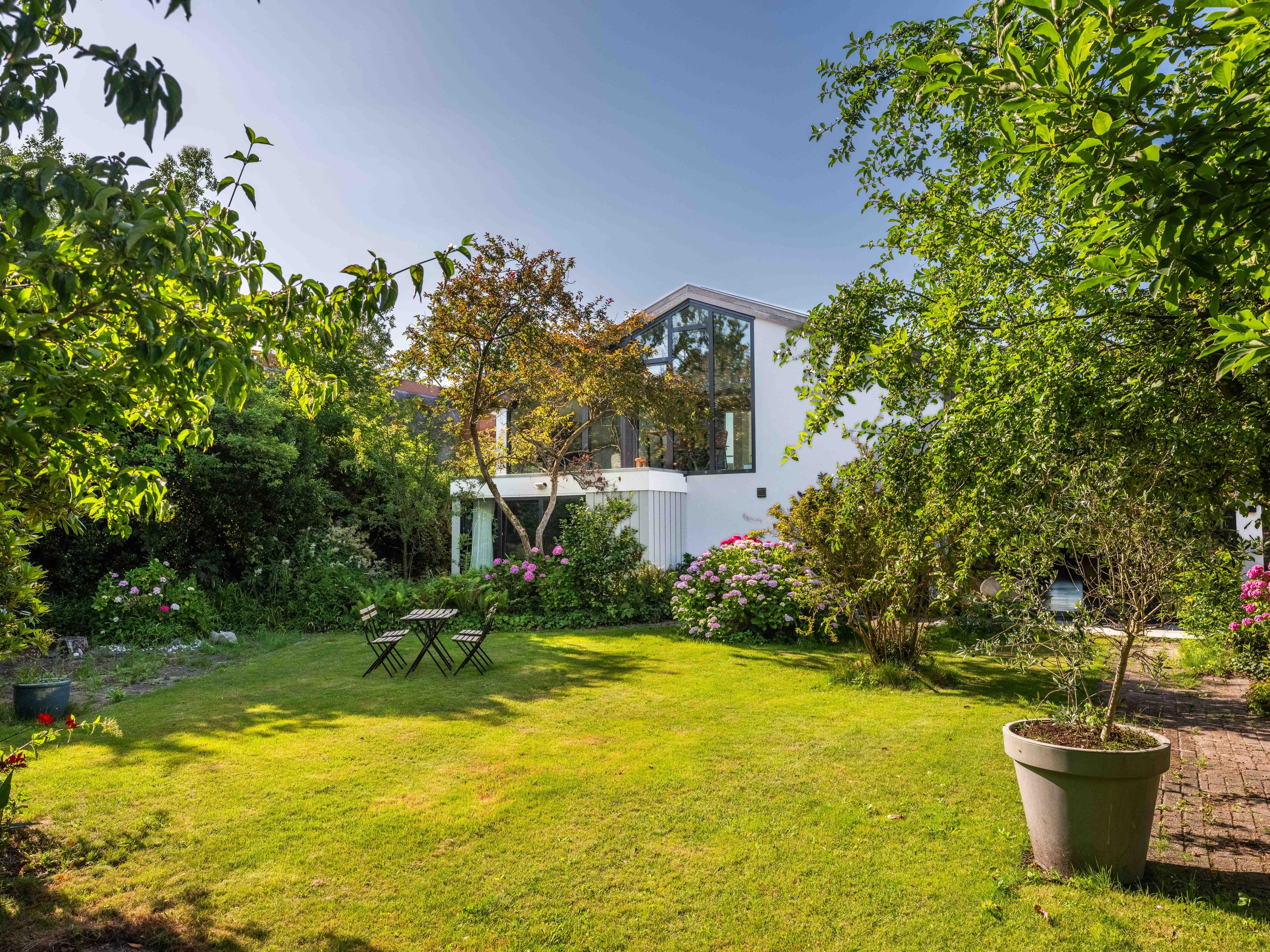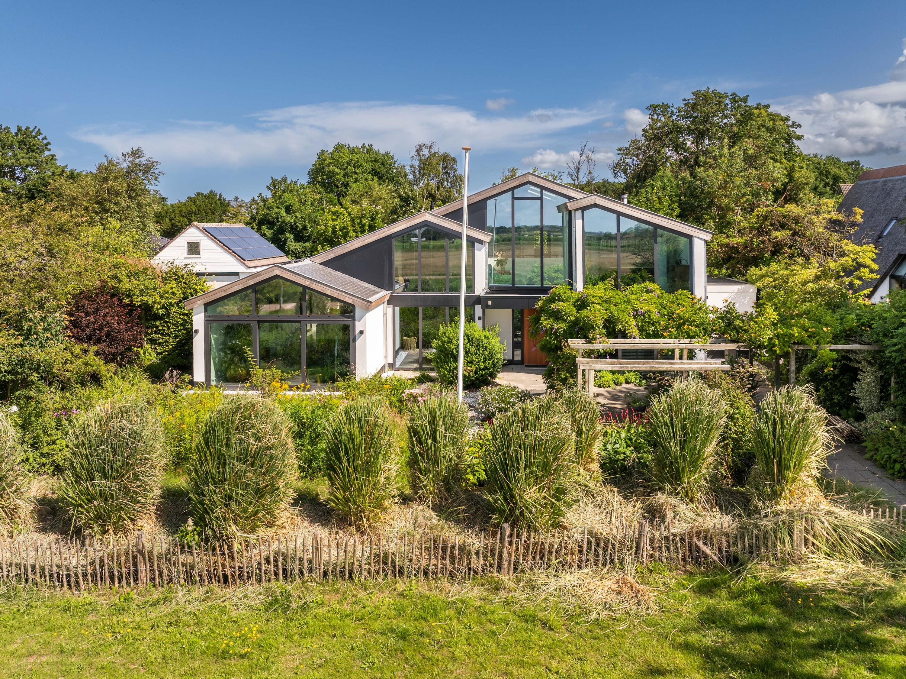 Im Außenbereich genießen Sie echte Privatsphäre, Sonne und Schatten, ein zum Entspannen eingerichtetes Gewächshaus am Außenkamin und eine 50 m² große freistehende Steingarage für zwei Autos. Zwei Einfahrten sowie zwei Ladestationen für Elektrofahrzeuge bieten zusätzlichen Komfort für Familie und Gäste.
