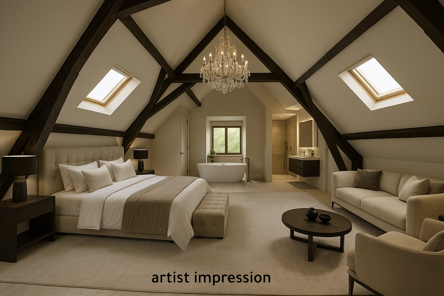 Über dem hinteren Flügel offenbart das Obergeschoss ein offenes Loft mit 4,5 Meter hohem First und Abstellraum, während der vordere Flügel zwei weitere Schlafzimmer und ein Badezimmer beherbergt. Jeder Aspekt ist auf Komfort ausgerichtet: Fußbodenheizung, Klimaanlage, mechanische Belüftung und Isolierverglasung.