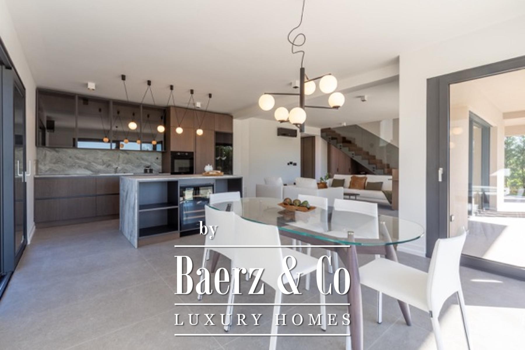 Beim Betreten des Hauses vermitteln hohe Decken und ein offener Wohnbereich ein großzügiges, lichtdurchflutetes Ambiente. Panoramaverglasung eröffnet den Blick auf einen sorgfältig angelegten Garten sowie auf einen beheizten Pool mit den Maßen 9,5 mal 3,5 Meter. Die Hauptebene verbindet sich fließend mit dem Außenbereich; eine automatische Bewässerungsanlage hält den eleganten Innenhof stets gepflegt. Im Zentrum des Hauses befindet sich eine Glaswendeltreppe, die zu drei Schlafzimmern führt – jedes mit eigenem, modern ausgestatteten Bad. Zwei Schlafzimmer haben Zugang zu privaten Terrassen, die zu entspannten Nachmittagsstunden einladen.