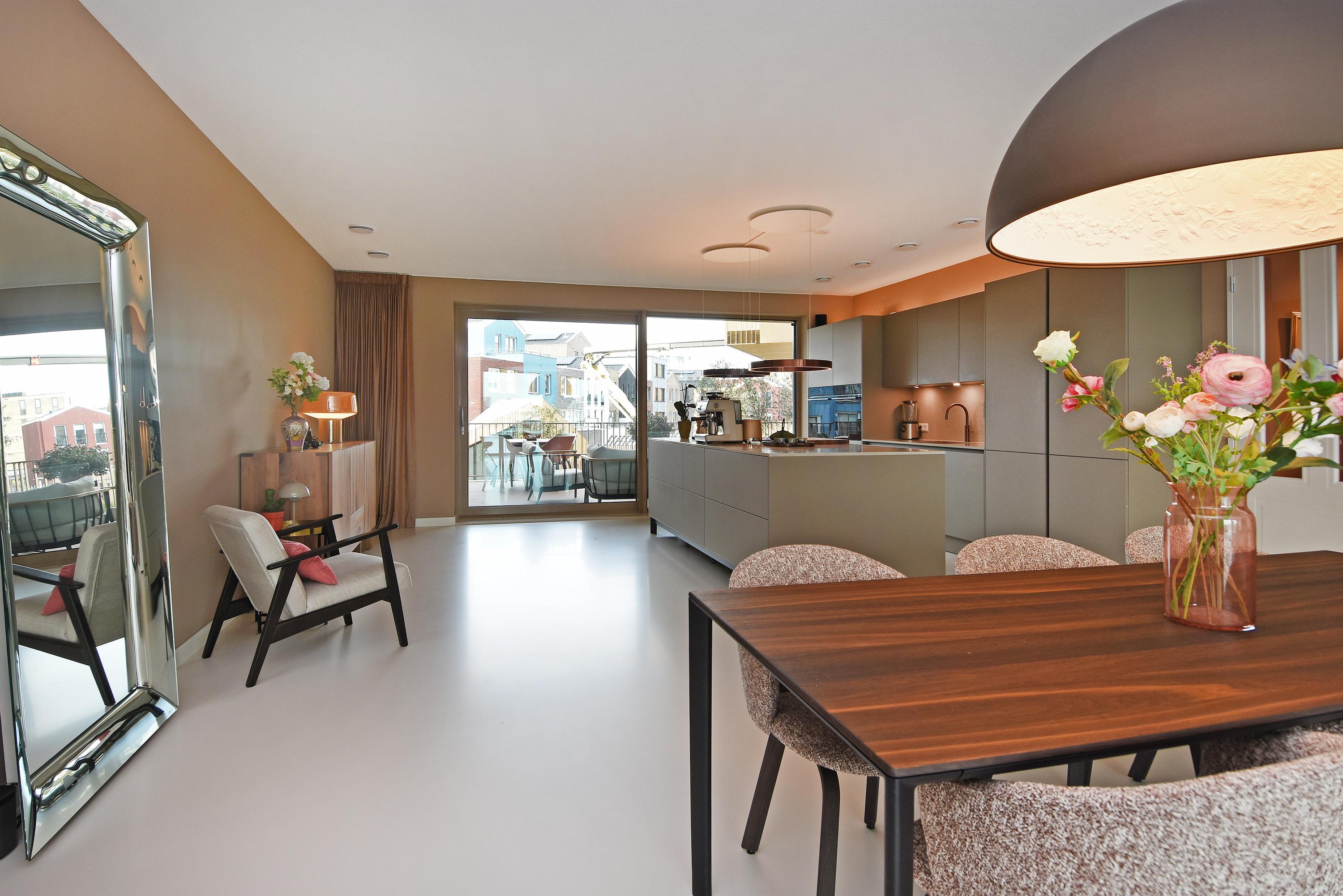 At the front is the seating area with a stylish custom-made wall unit featuring a closable workspace. At the rear you’ll find the designer kitchen with cooking island and every imaginable luxury built-in appliance, including an induction hob with integrated extractor, Quooker, dishwasher, combi-oven, spacious refrigerator, and separate freezer. From the kitchen, the large sliding doors open onto the generous balcony, where you can peacefully enjoy the afternoon and evening sun.