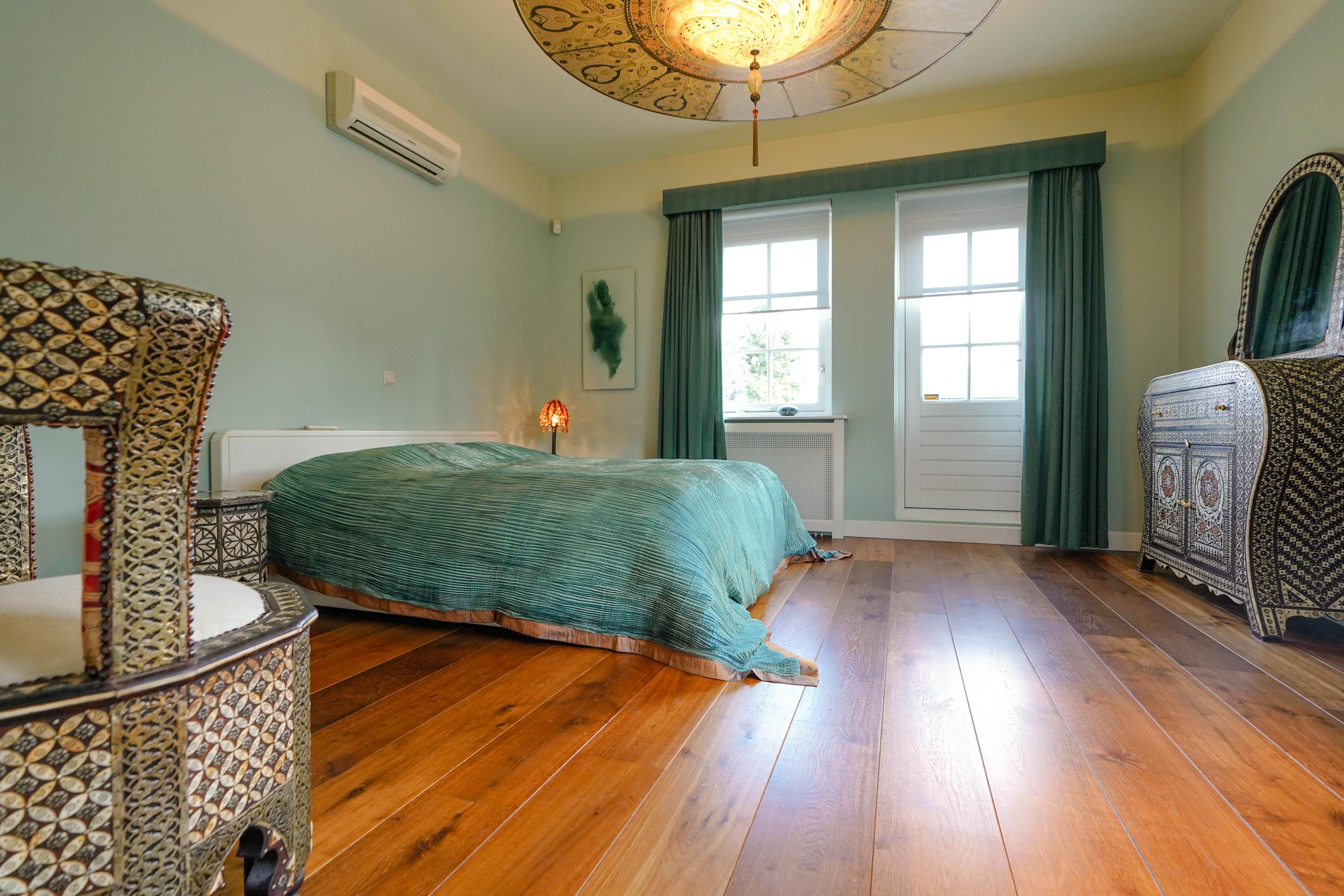 De ruime master bedroom met airconditioning en aangrenzend terras biedt direct toegang tot de badkamer.
