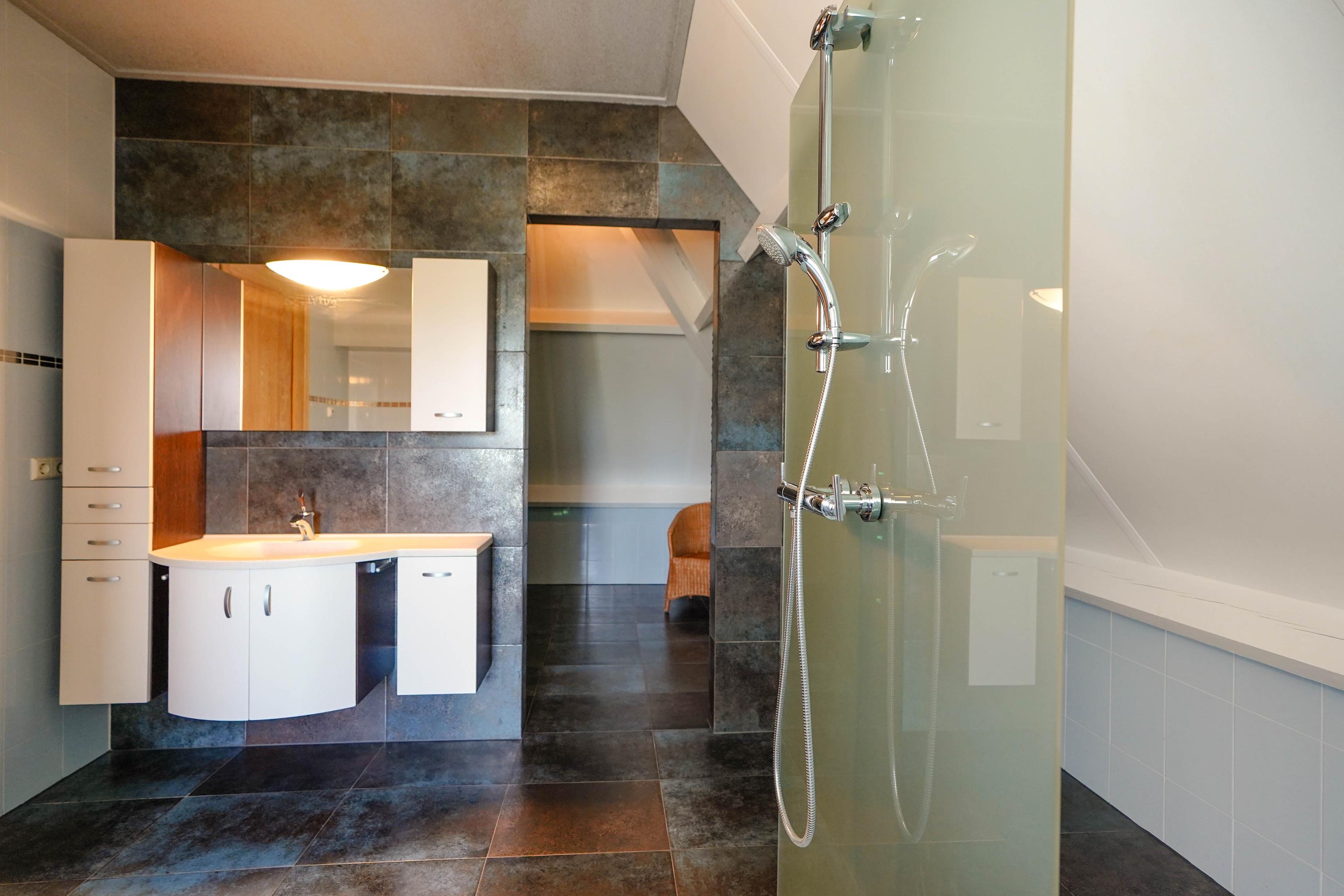 De royale badkamer is ingericht in Andalusische stijl, met een inloopdouche, een bubbelbad, design radiator, twee Sphinx wastafels, een toilet, en bijpassende wandkasten van Sphinx. De exclusieve, nauwgezet op patroon aangebrachte, Andalusische wandtegels zijn speciaal geïmporteerd vanuit Spanje (Mensaque Rodrigues, Triana/Sevilla).