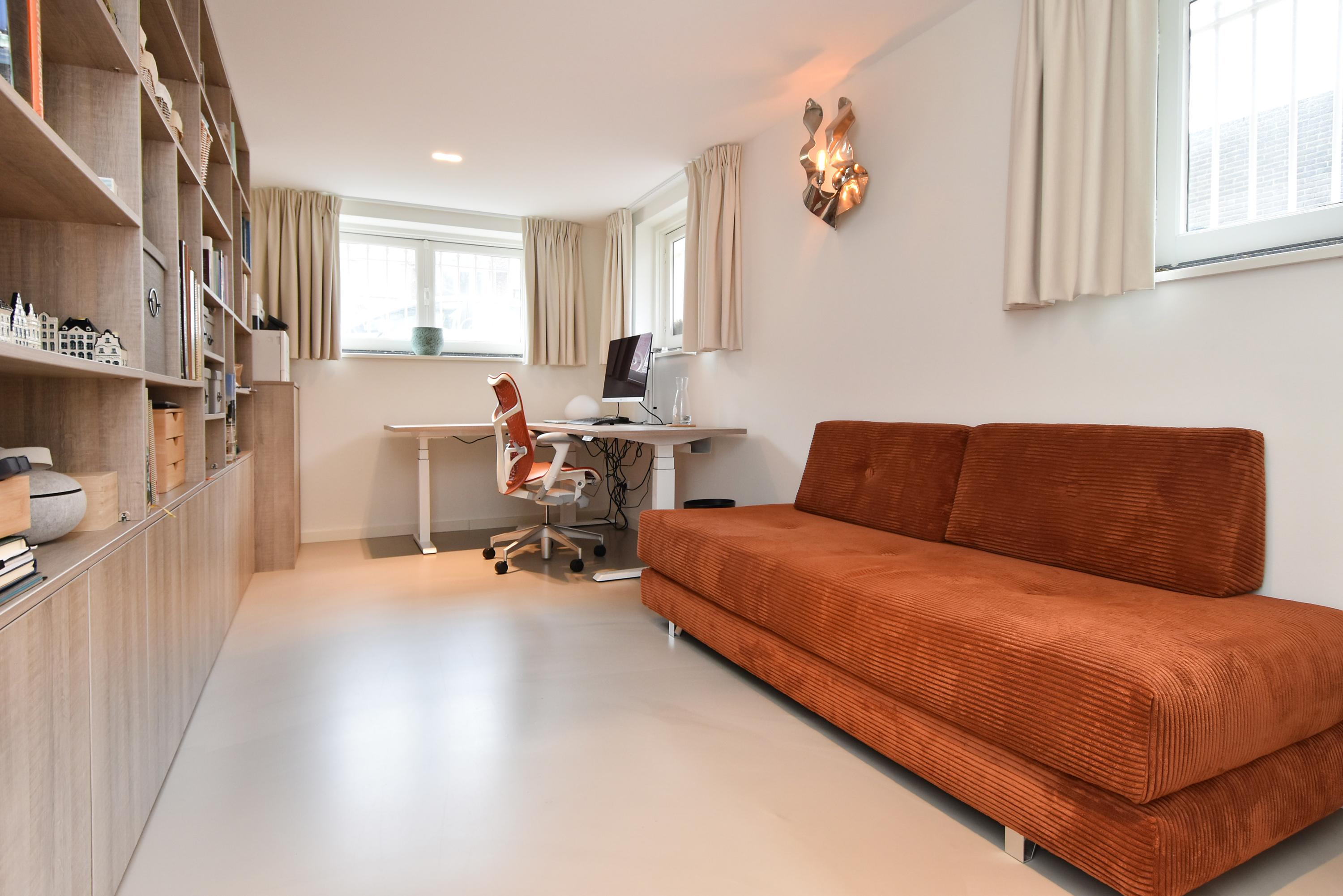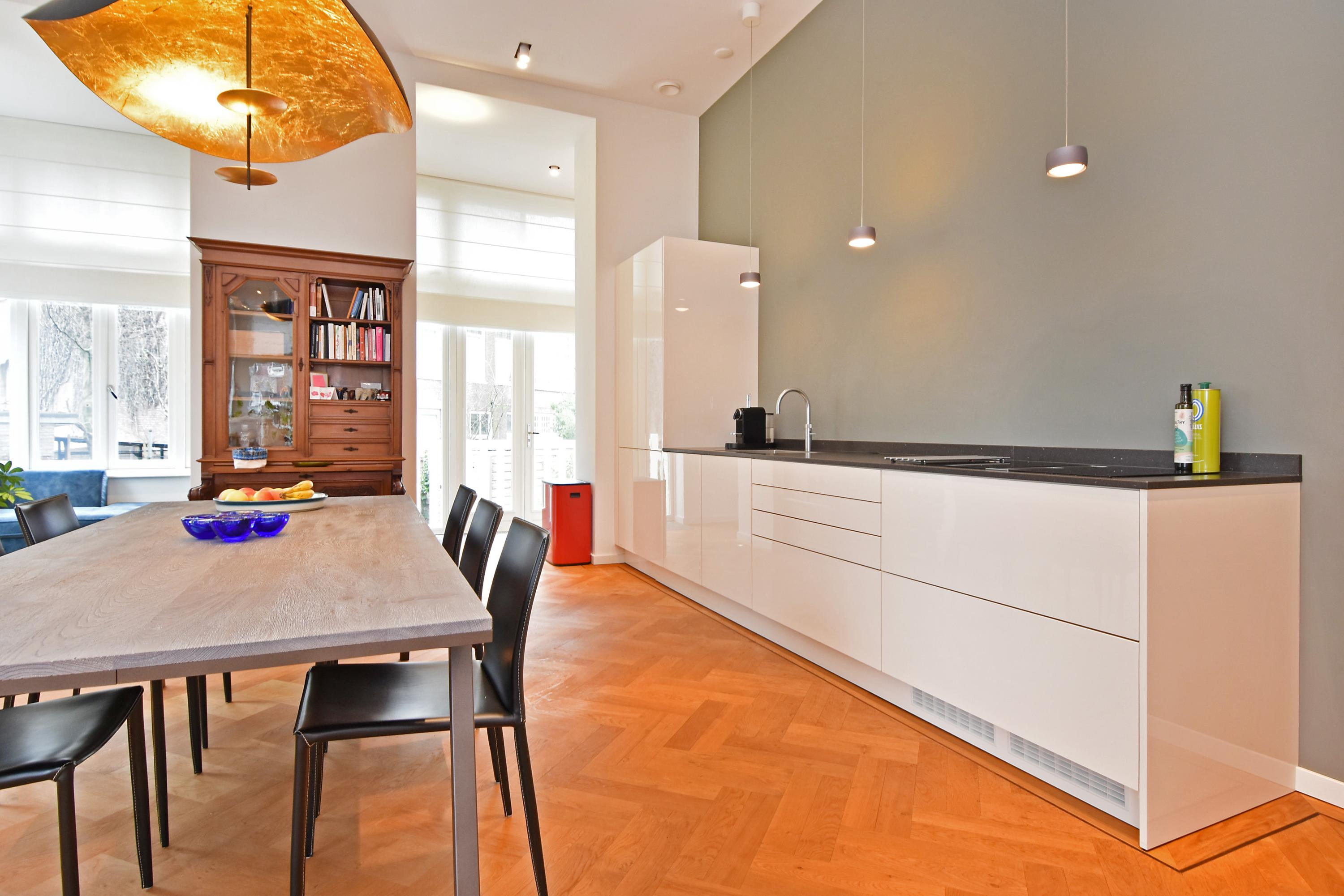 The elevated ground floor hosts the inviting living and dining space, marked by an oak herringbone parquet with underfloor heating and ceilings close to four metres. An open-plan kitchen is equipped with integrated appliances, including an induction cooktop, Quooker, and design lighting. The flow leads out to a balcony and sunlit south-facing garden with storeroom and private exterior entrance.