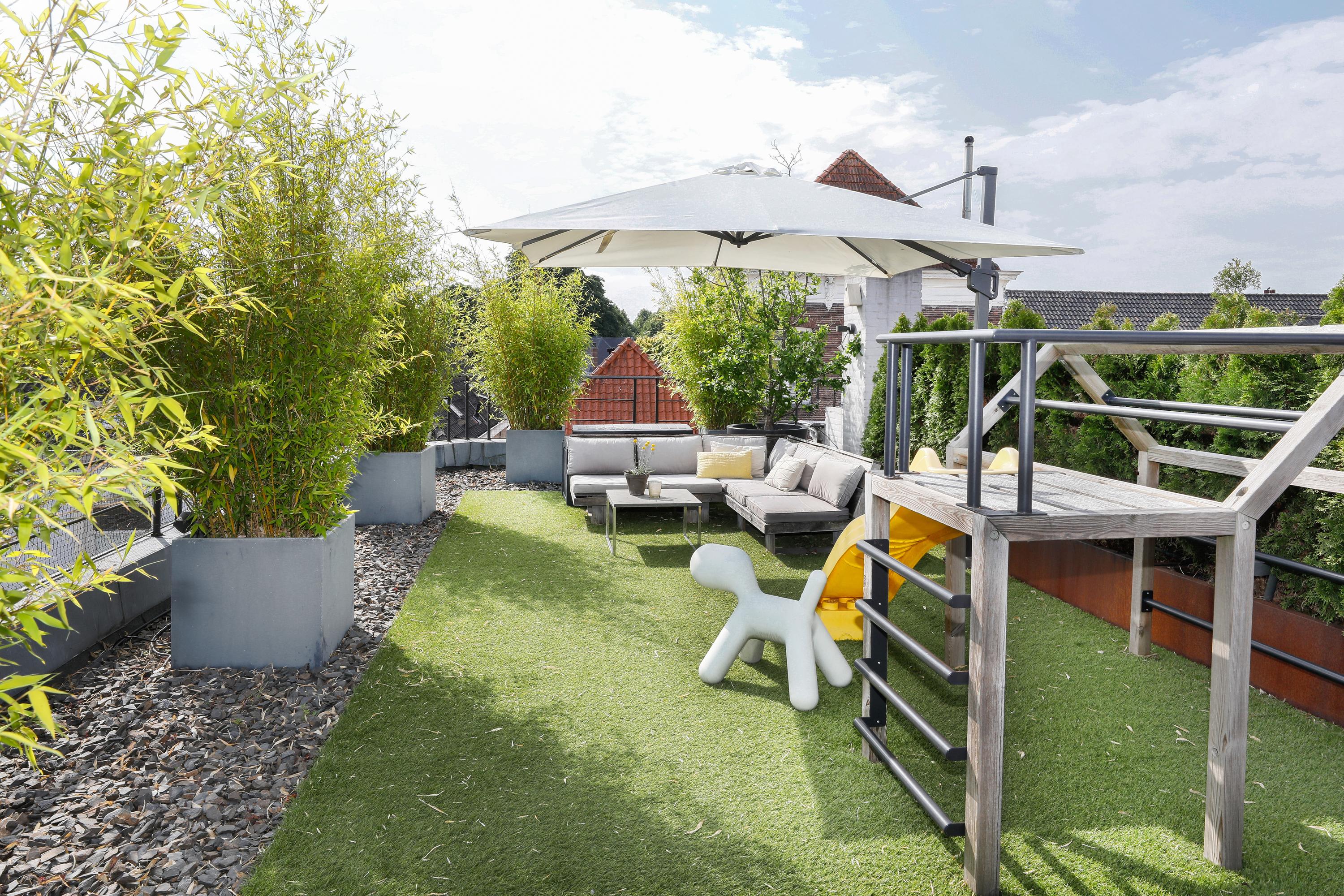 Large apartment in the heart of the city center with five rooms, a private entrance/bicycle storage, and an impressive roof terrace.