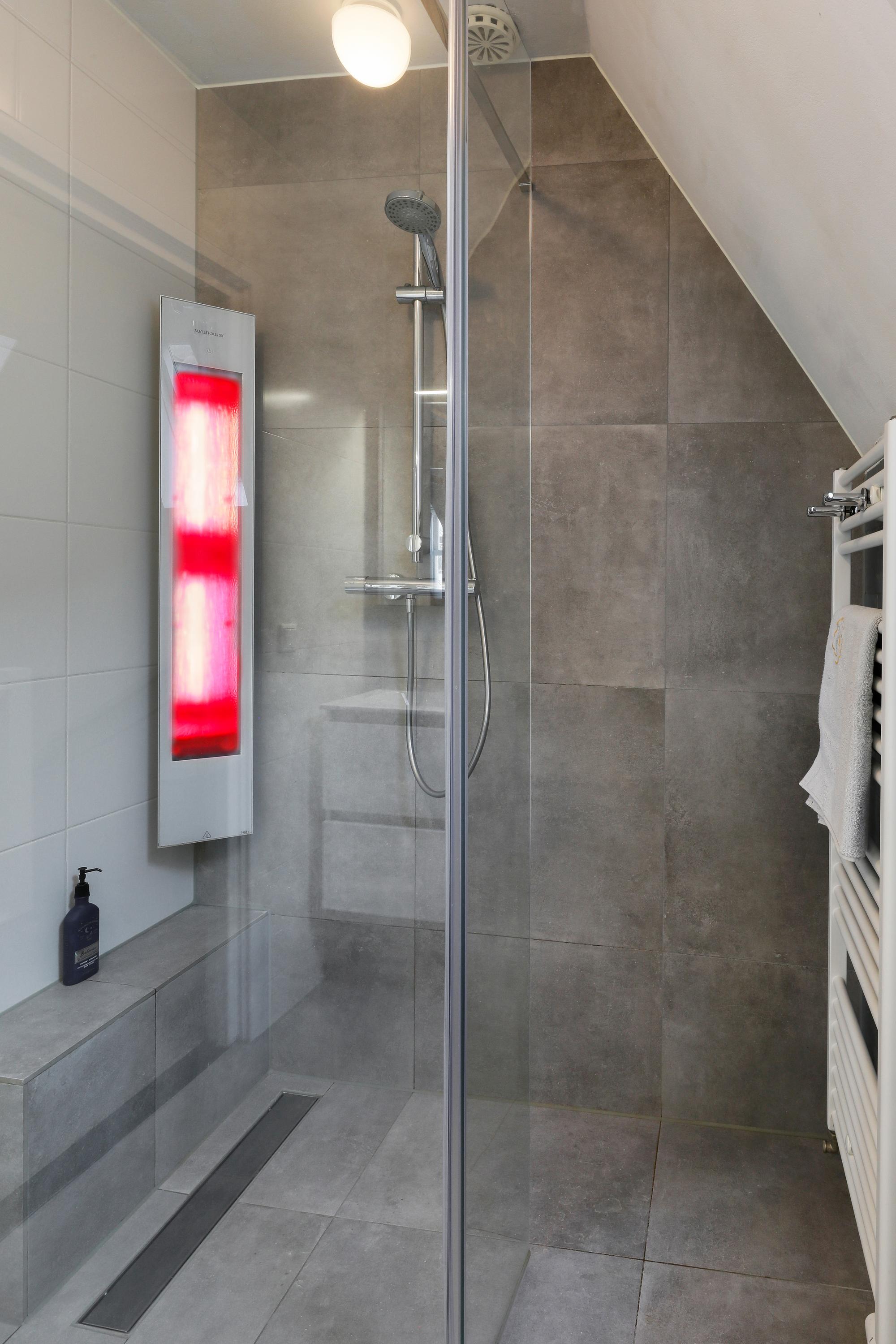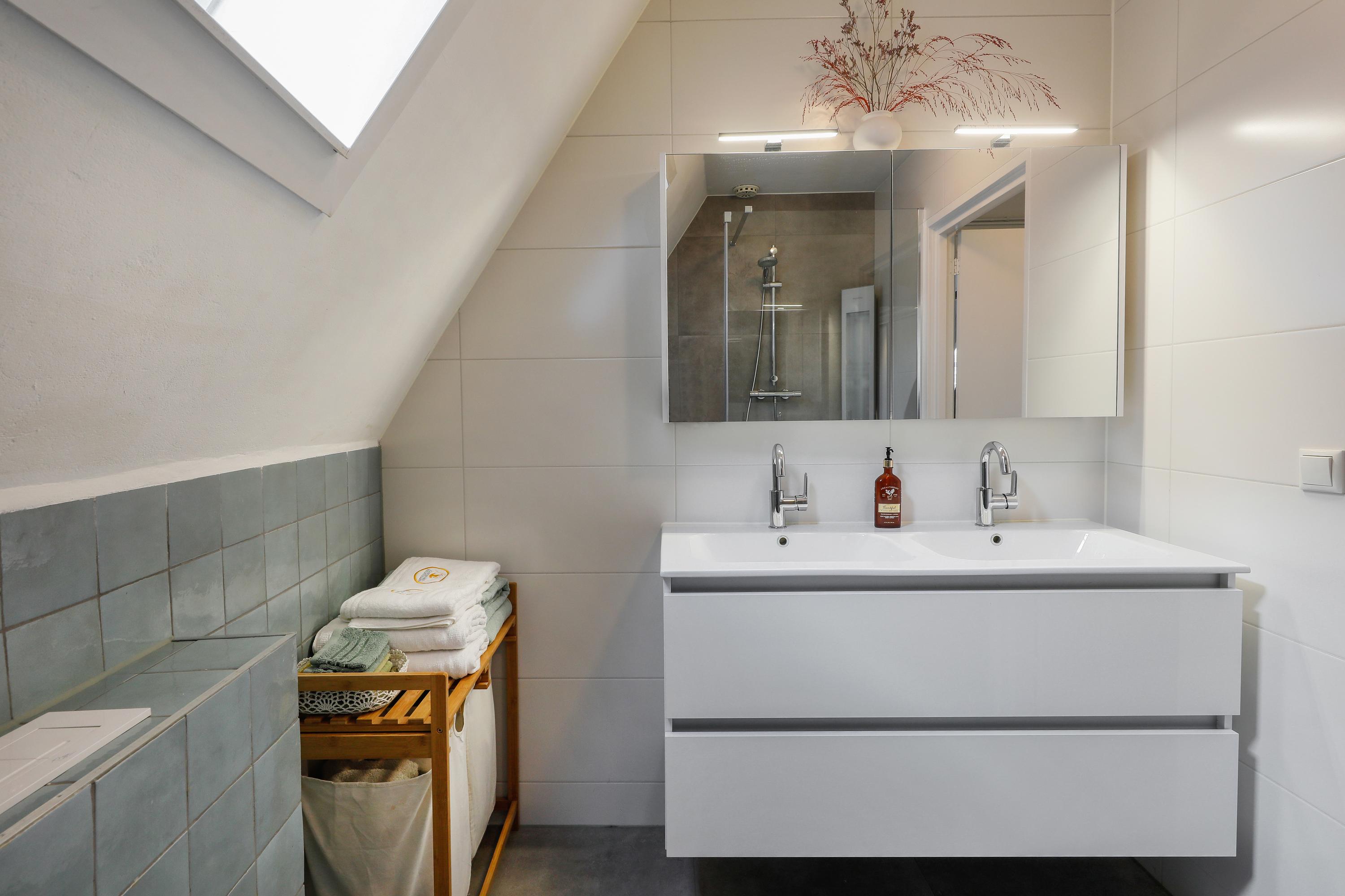 The bathroom was fully renovated in 2024 and includes a walk-in shower, double washbasin, toilet and designer radiator.