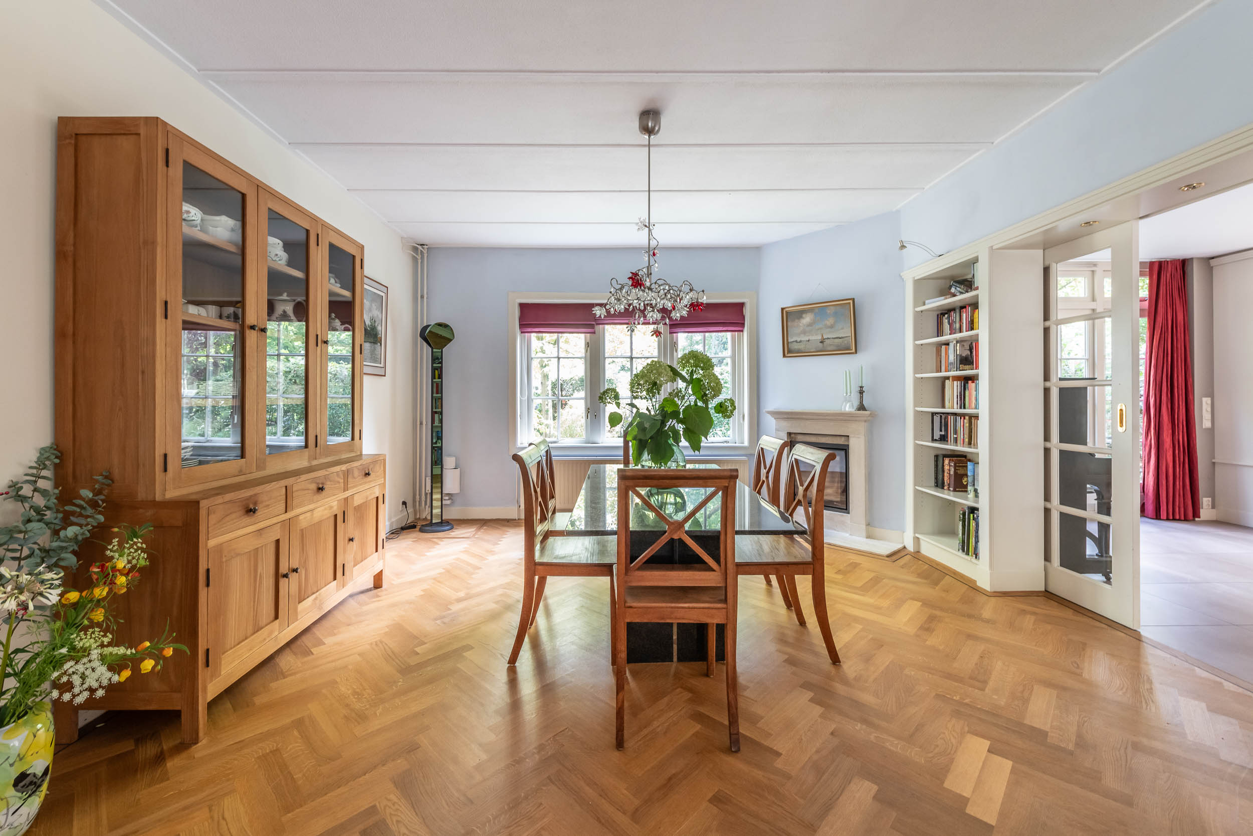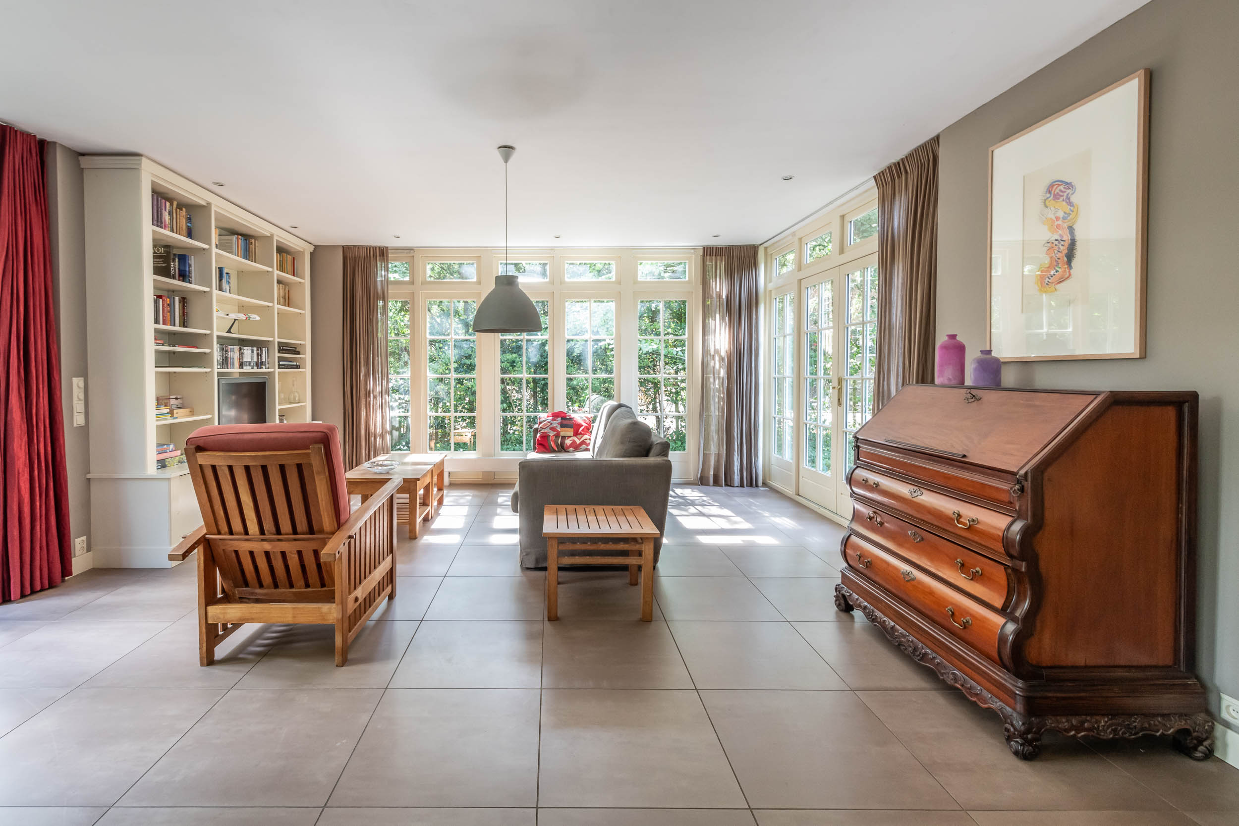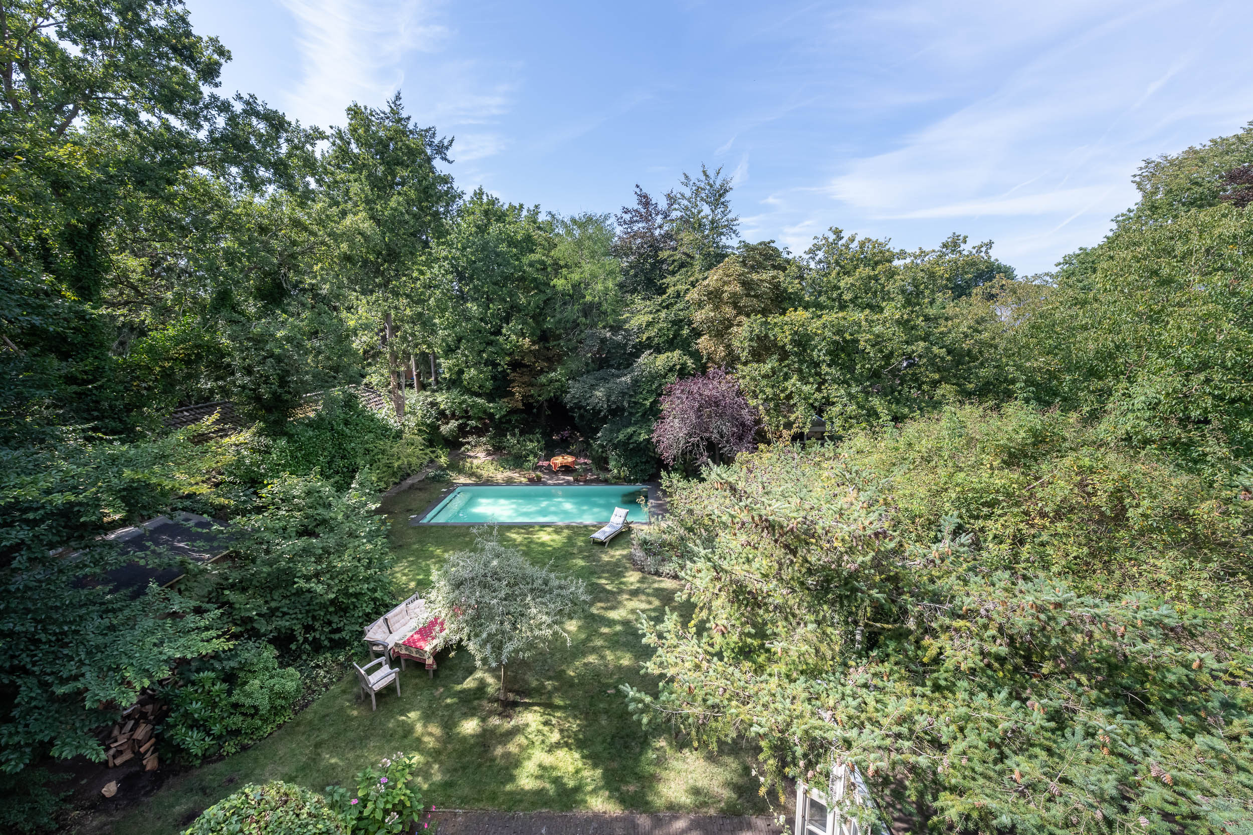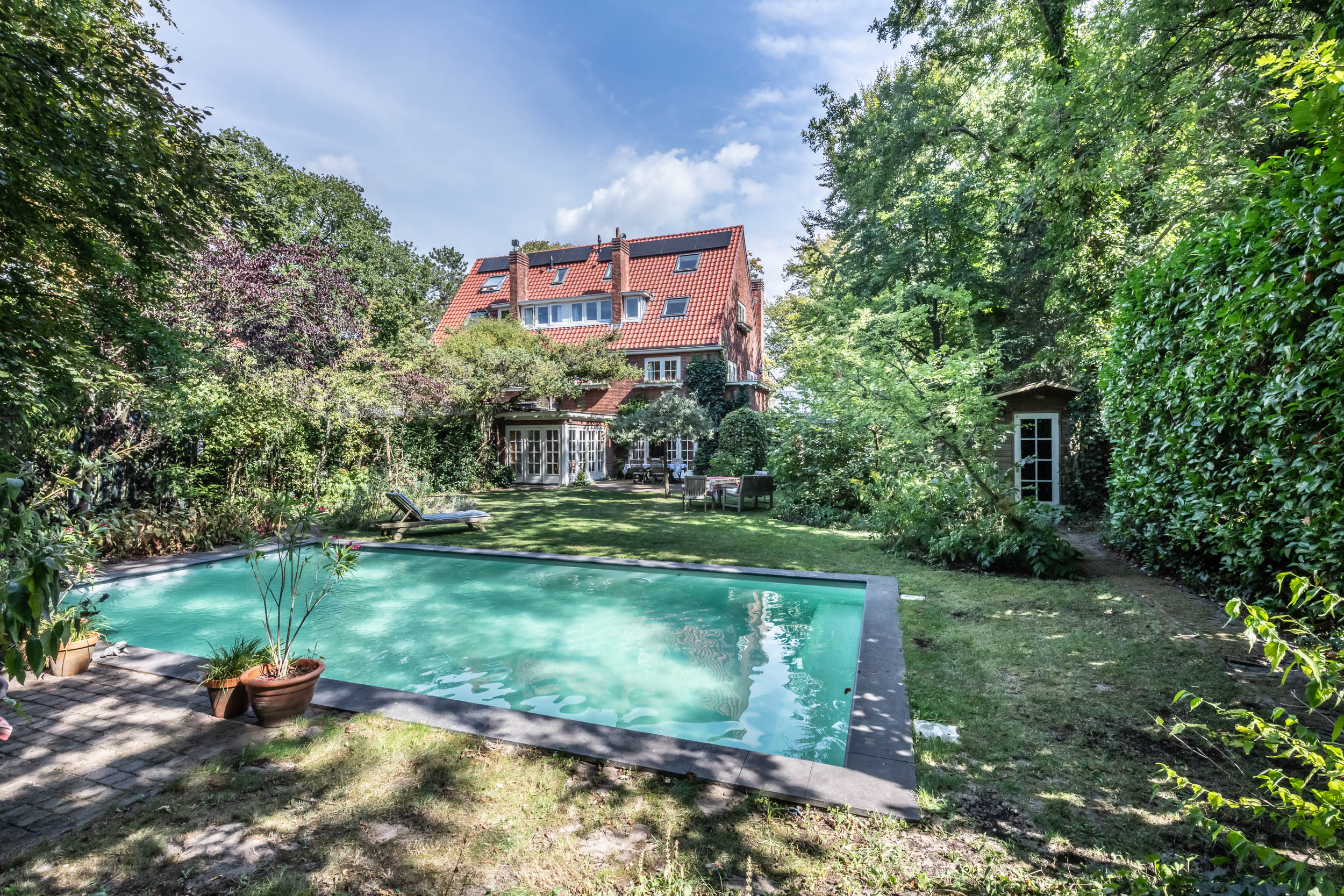 This well-maintained, semi-detached distinctive and uniquely designed villa with swimming pool and garage on a large plot of over 1,000 m² is located on the green and quiet Grenslaan. All living areas are beautifully situated facing the sun (west and south side). A family home par excellence: 6 bedrooms and 2 bathrooms! The extension on the side of the house (which completely matches the style of the main house) has created plenty of space on the ground floor for an extra room, such as a playroom, TV room or study. The beautifully landscaped garden has several terraces, is in a sunny location facing the west and offers complete privacy! At the rear of the garden, where the plot borders Wikkelaan, there is parking space for two cars on private land with two private charging stations.