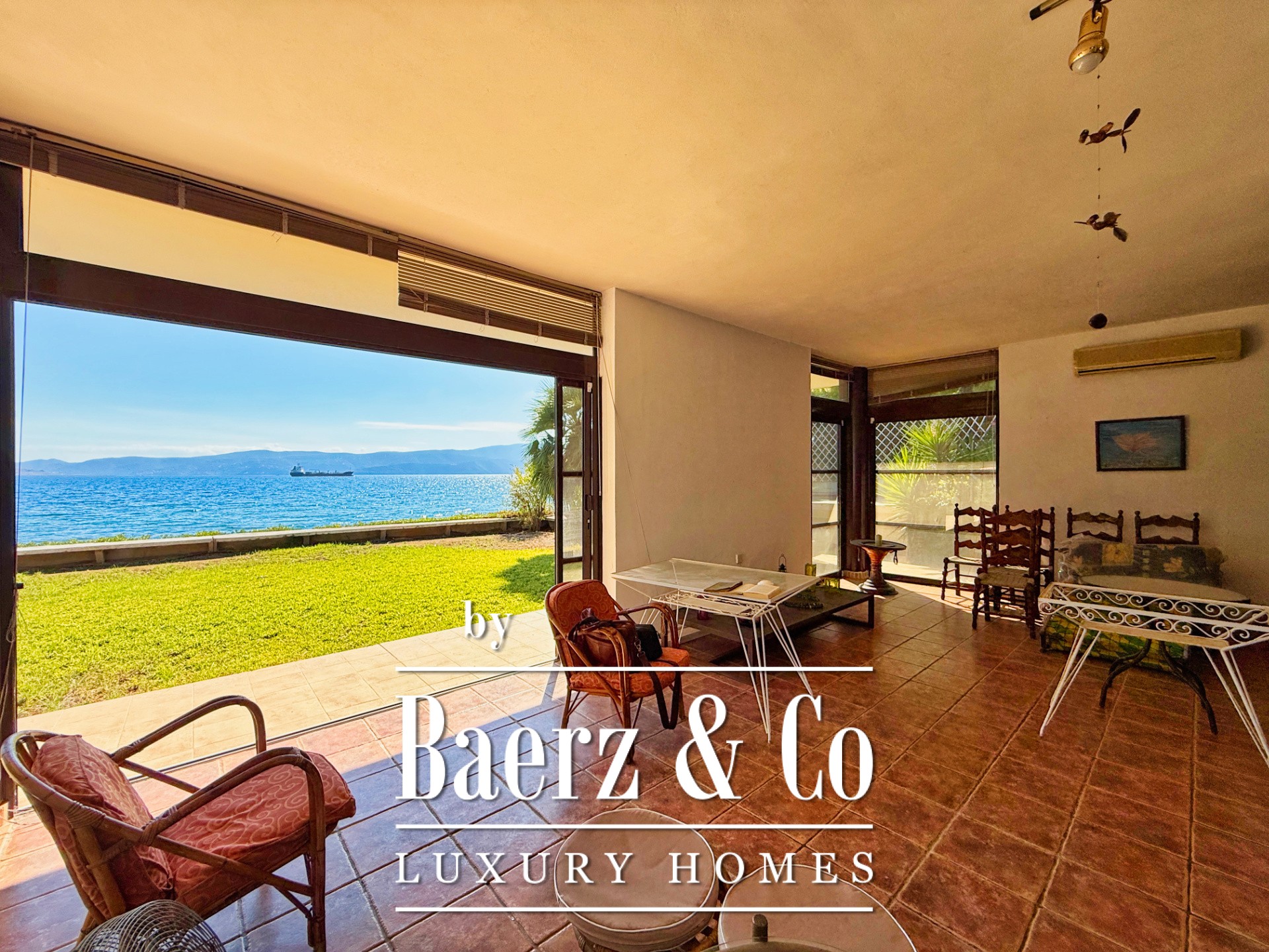 Detached house of 140 sq.m. on a 1,400 sq.m. plot, located directly on the seafront in Agioi Theodoroi, Corinthia. Built in 1967, the property offers five bedrooms, two bathrooms, a kitchen, a living room, and a spacious sitting area. The sitting area is the most privileged part of the house, featuring large openings that allow abundant natural light and provide unobstructed sea views, creating an atmosphere of calmness and refined aesthetics.