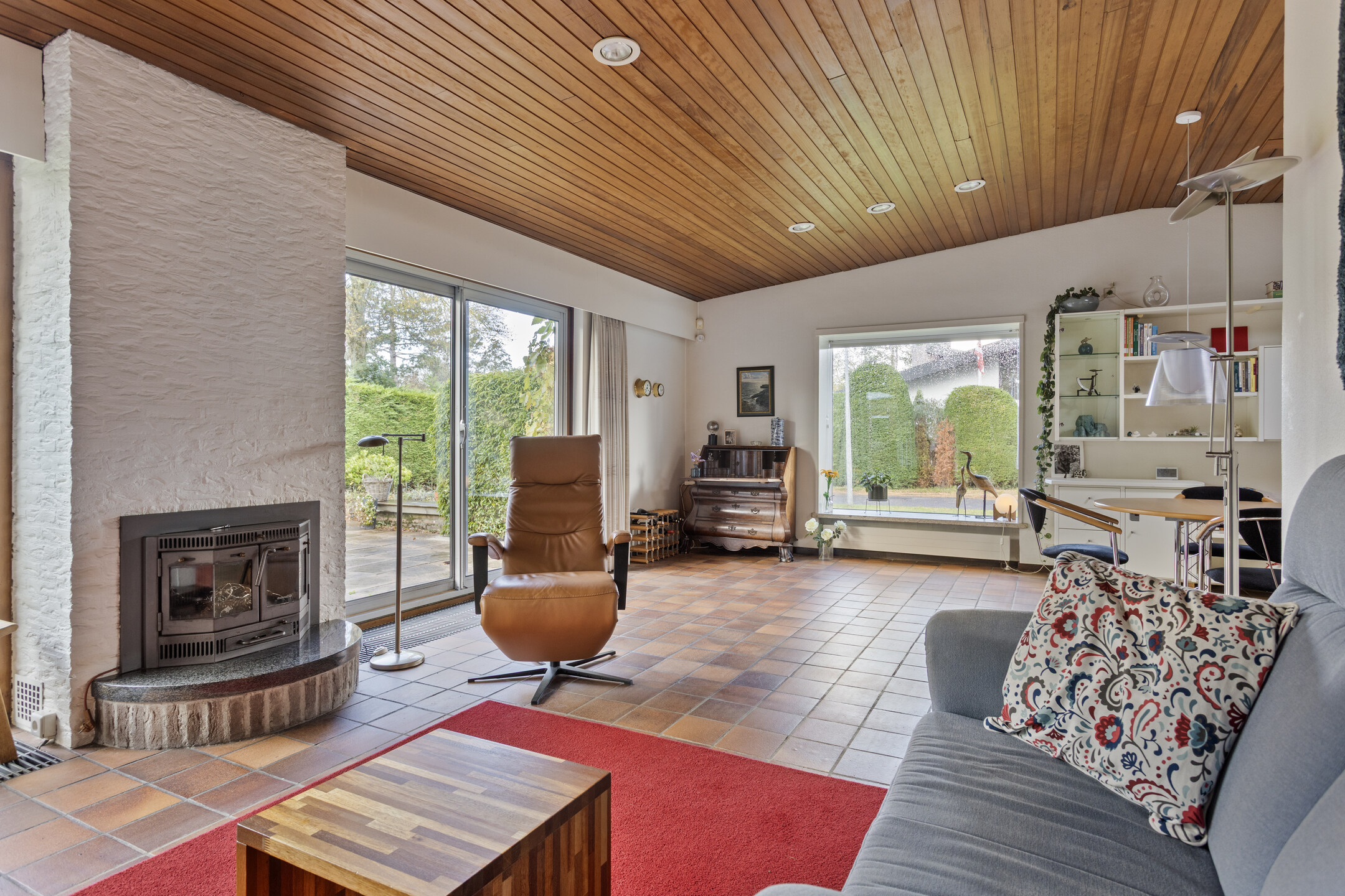 De royale woonkamer met grote raampartijen, schuifpui en open haard biedt een sfeervolle leefruimte met prachtig zicht op de tuin. Aansluitend de eetkamer en de halfopen keuken, uitgerust met onder andere een oven, vaatwasser, elektrische kookplaat en koelkast. De houten plafondafwerking zorgt voor een warme, karakteristieke uitstraling.