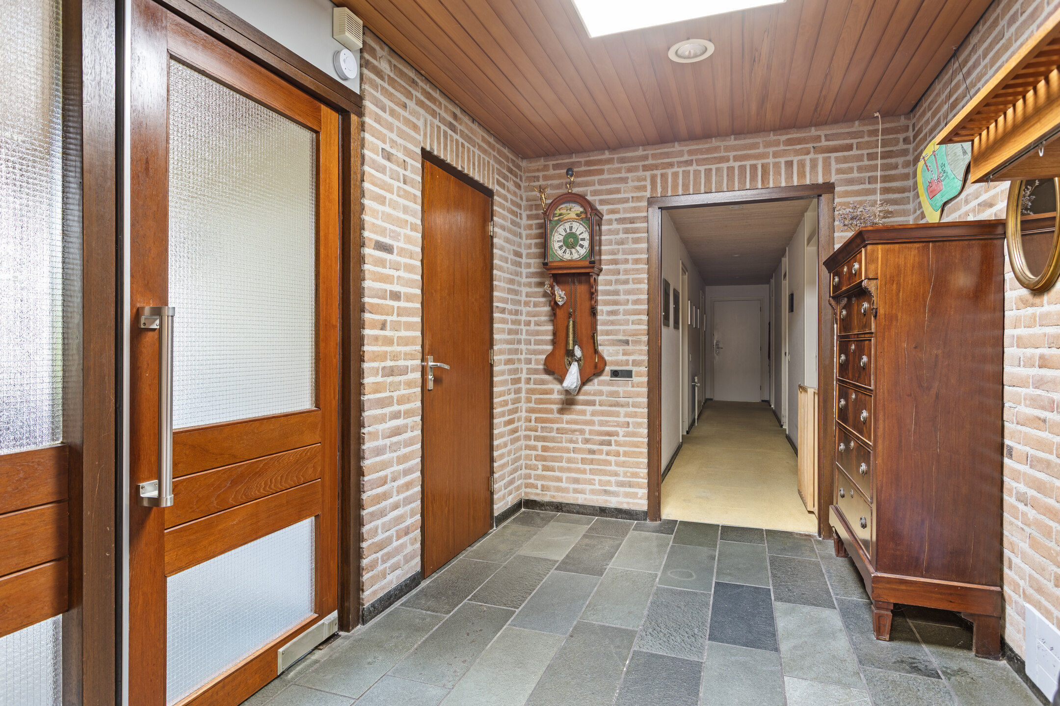 Ruime ontvangsthal met garderobe, toilet en toegang tot de gang die leidt naar het woongedeelte en de slaapvleugel.