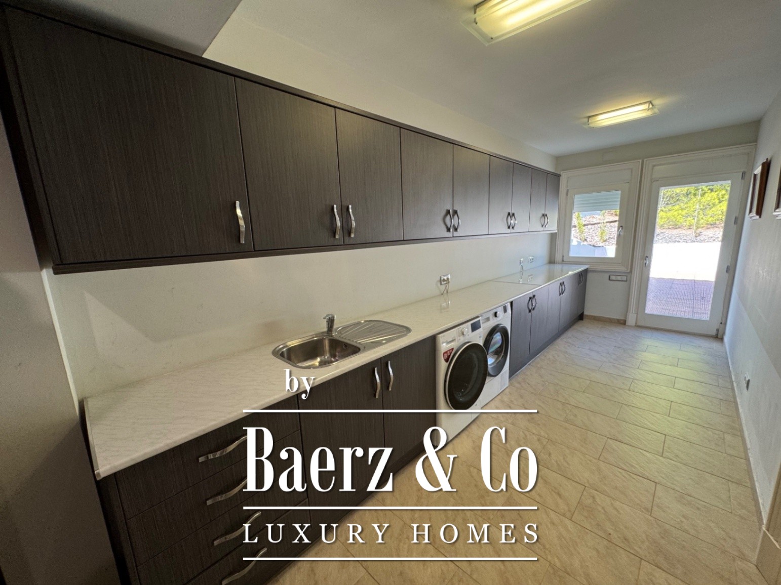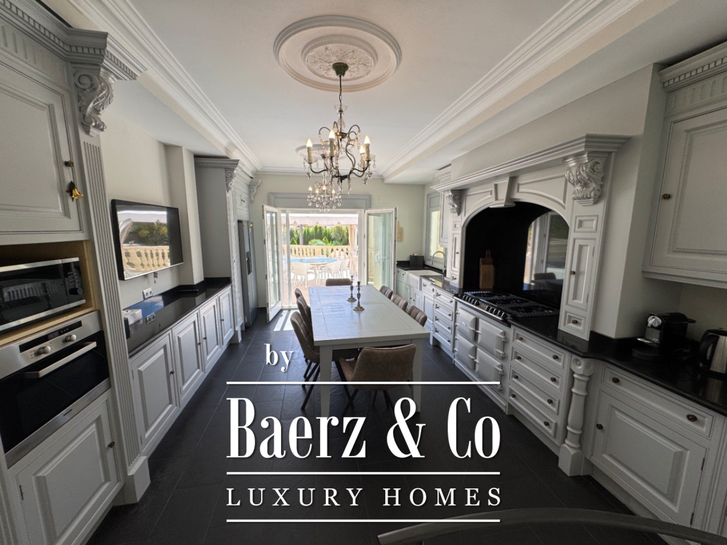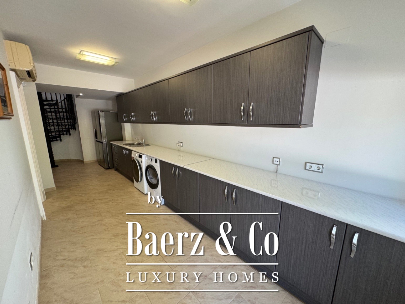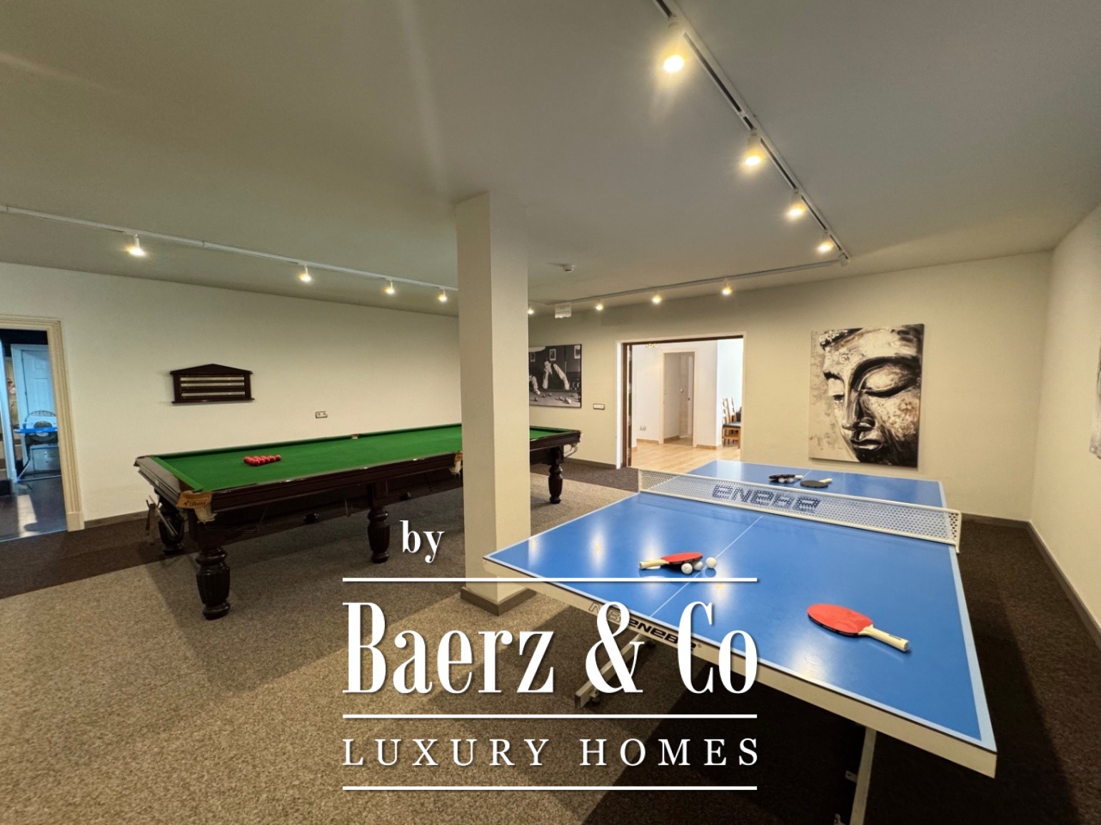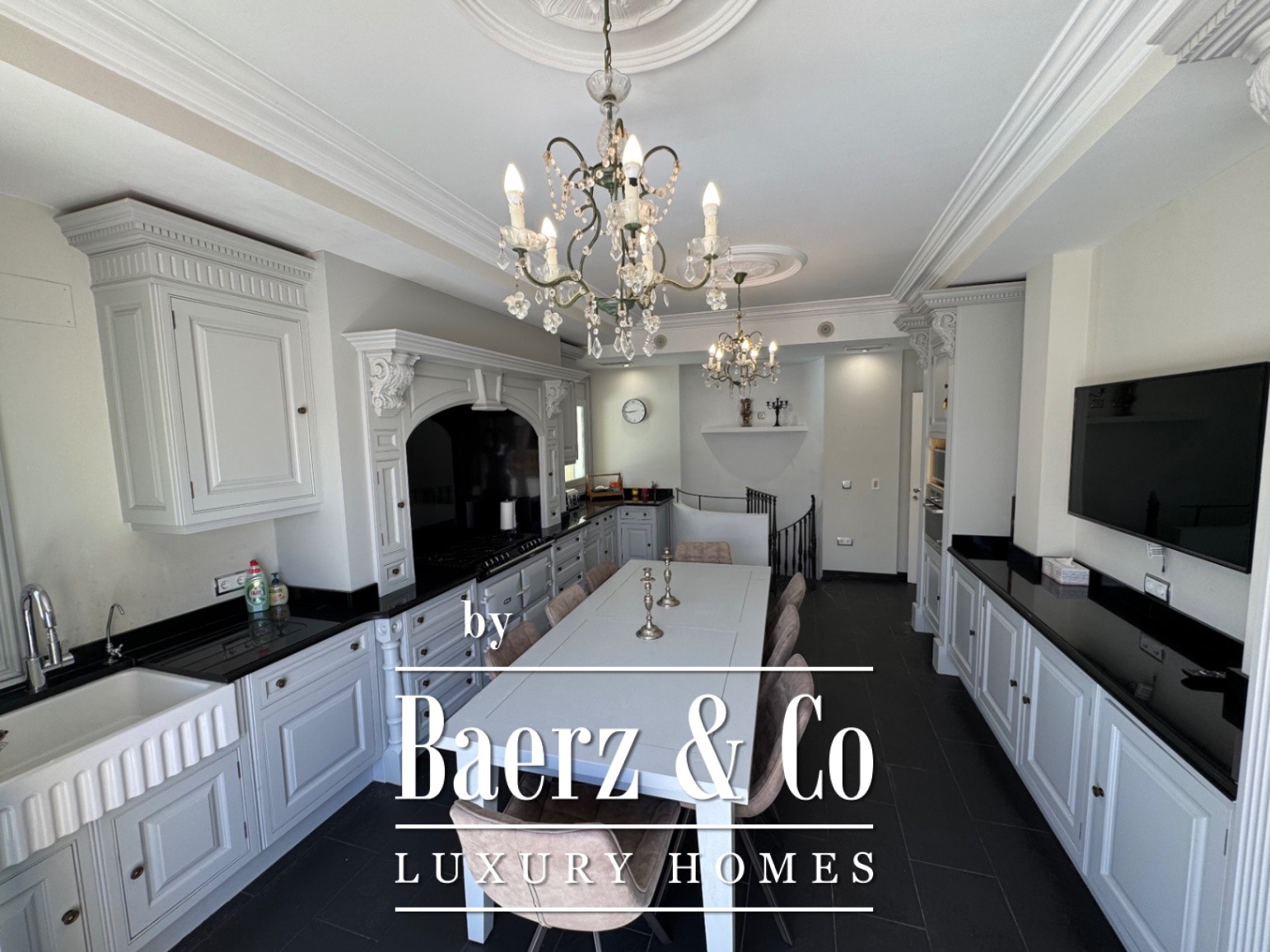 The ground floor is designed for well-being, featuring a private cinema, spa, gym, and laundry, complemented by a guest apartment with three bedrooms and its own fully equipped kitchen. A garage for three cars sits alongside carefully planned outdoor areas, including a pool, landscaped garden, and secure, fenced plot of 6,315 m².