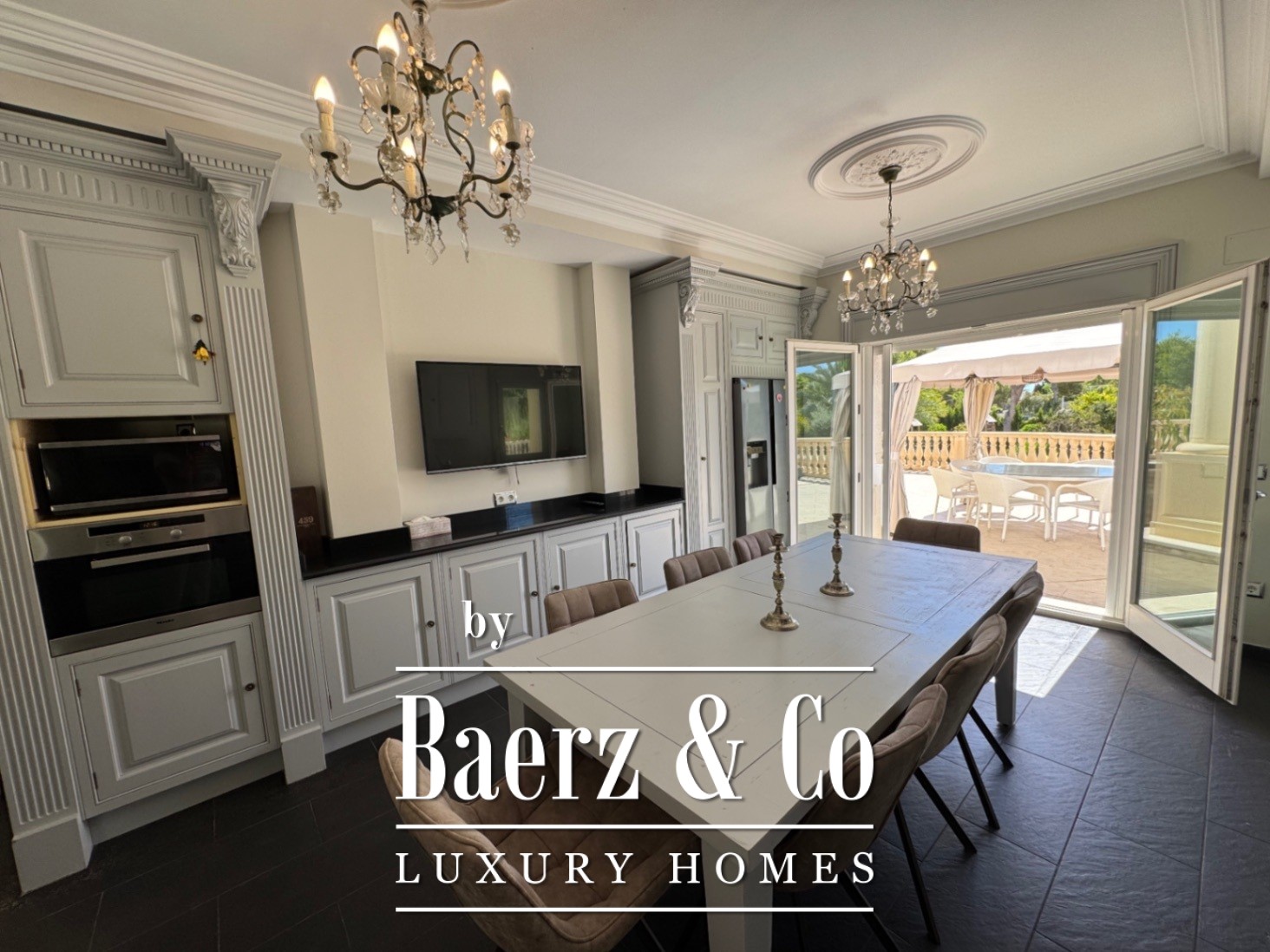 An elegant entrance hall gives way to luminous interiors, anchored by a living room with fireplace and separate dining room, each opening directly onto open and covered terraces. The kitchen is fully furnished and includes a guest toilet and a dedicated office for quiet work. Upstairs, three bedrooms await, with two bathrooms—one ensuite—securing privacy and tranquility.