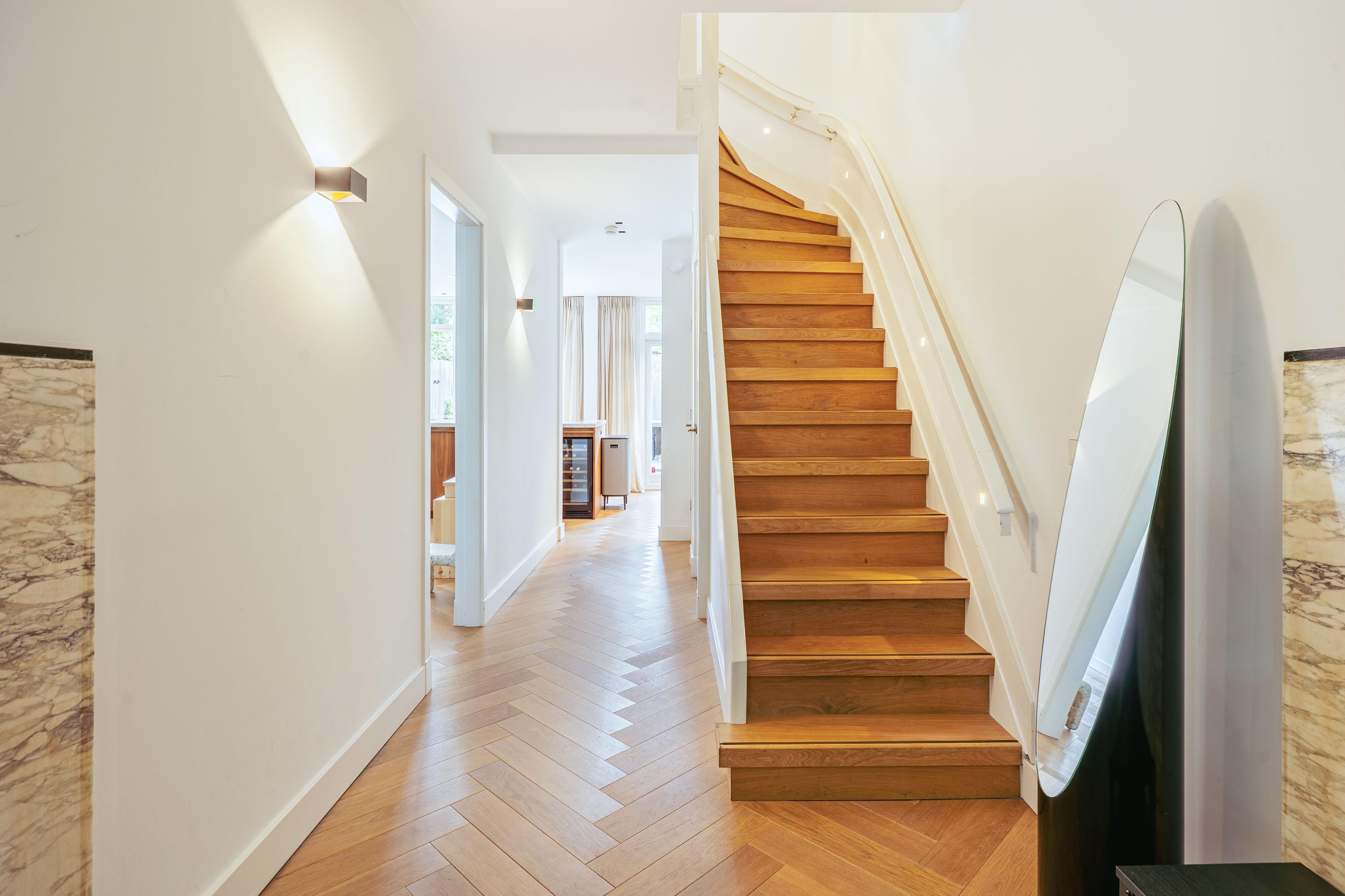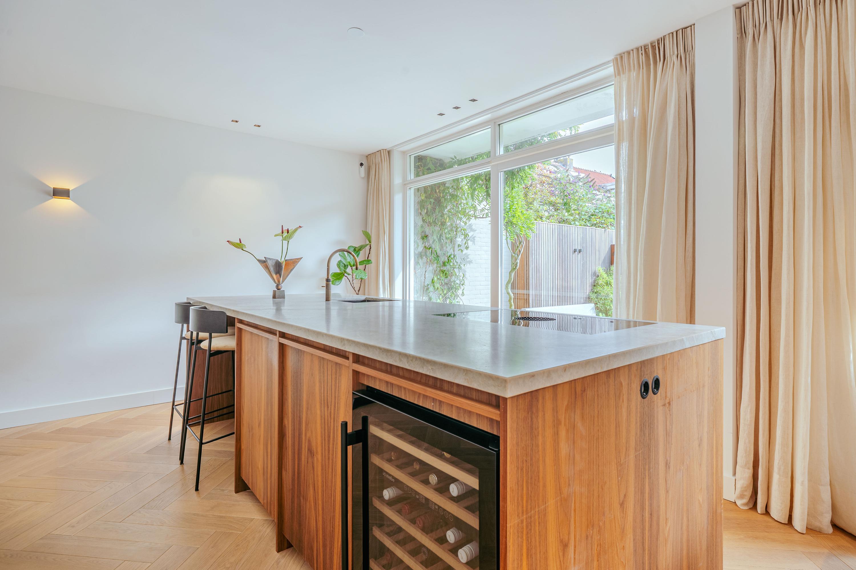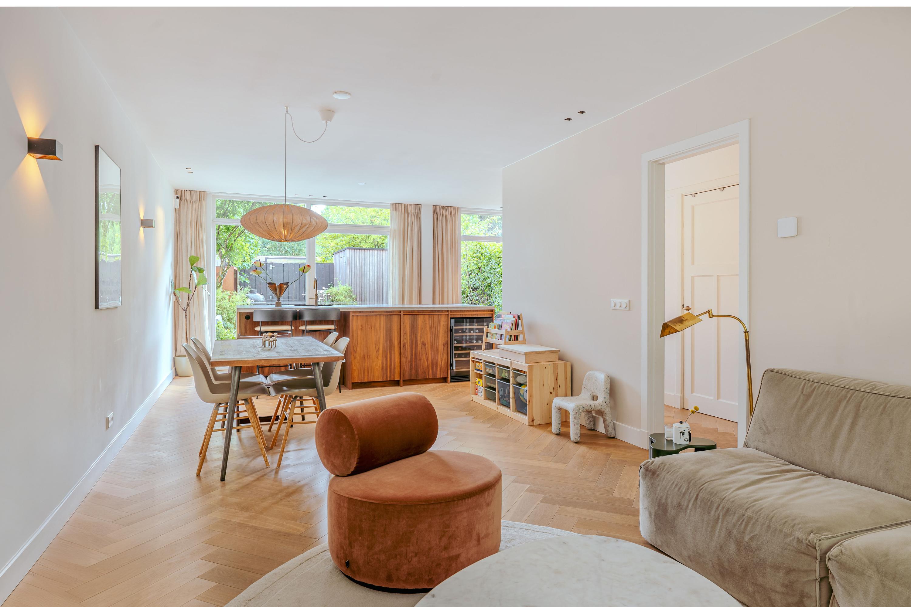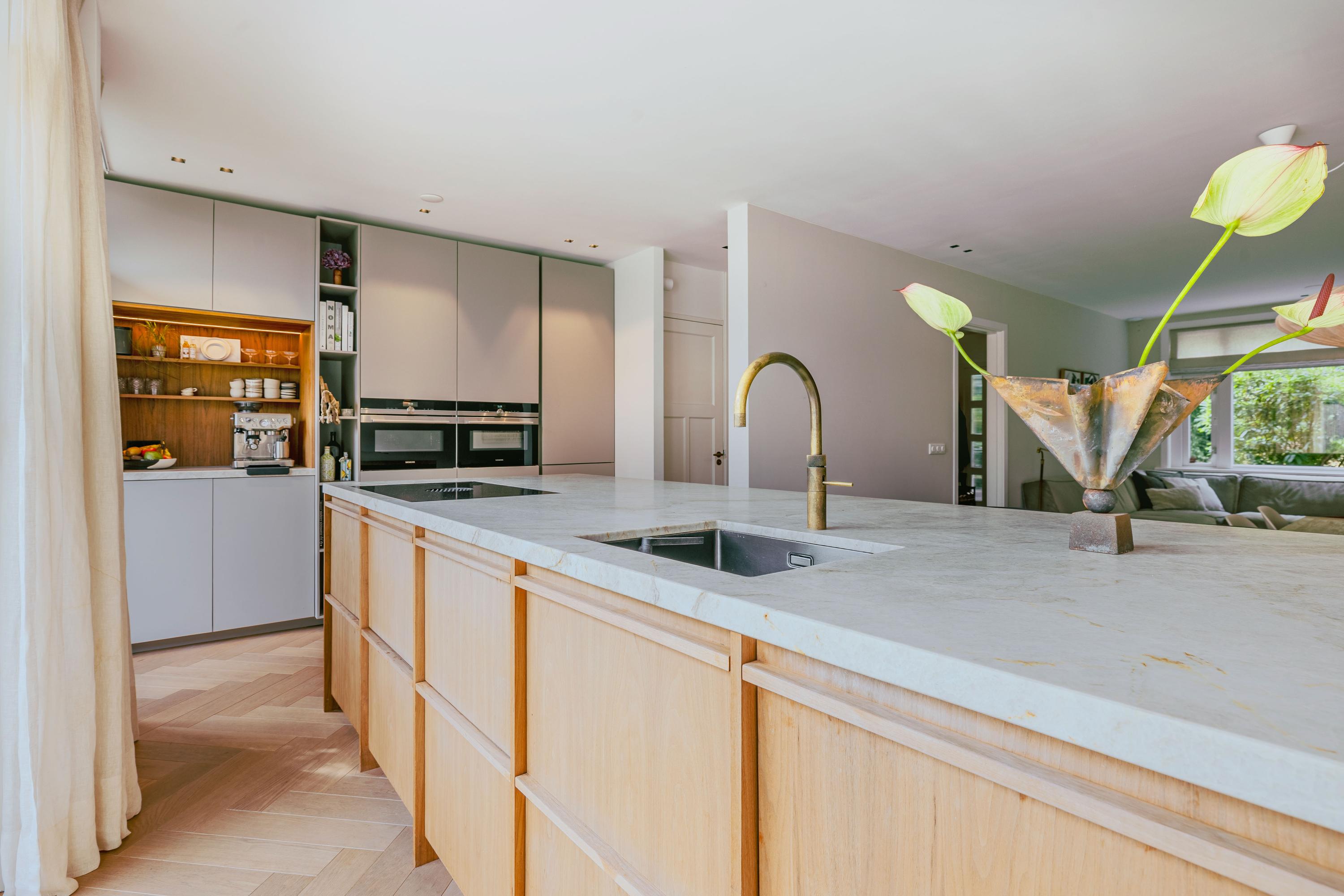 Through the well-kept front garden you reach the entrance of the house. The hallway features a practical storage cupboard under the stairs and a separate toilet with washbasin. From here you have access to the bright living room and the spacious open-plan kitchen at the rear. The property was fully renovated in 2021 and fitted with an oak herringbone floor with underfloor heating. The luxurious kitchen is designed with a central cooking island and high-quality built-in appliances, including a Bora induction hob with integrated extractor, Quooker tap, sink, climate-controlled wine cabinet, two combination ovens (one with steam function), fridge, freezer and dishwasher. The natural stone countertop made of Taj Mahal quartzite gives the kitchen a refined look. Thanks to the large windows and the glass door to the garden, this floor benefits from plenty of natural light. The rear garden (41 m², south-facing) was designed and landscaped in 2022 by a professional garden architect, and is equipped with lighting, irrigation, and a detached storage shed (approx. 6 m²) with electricity.