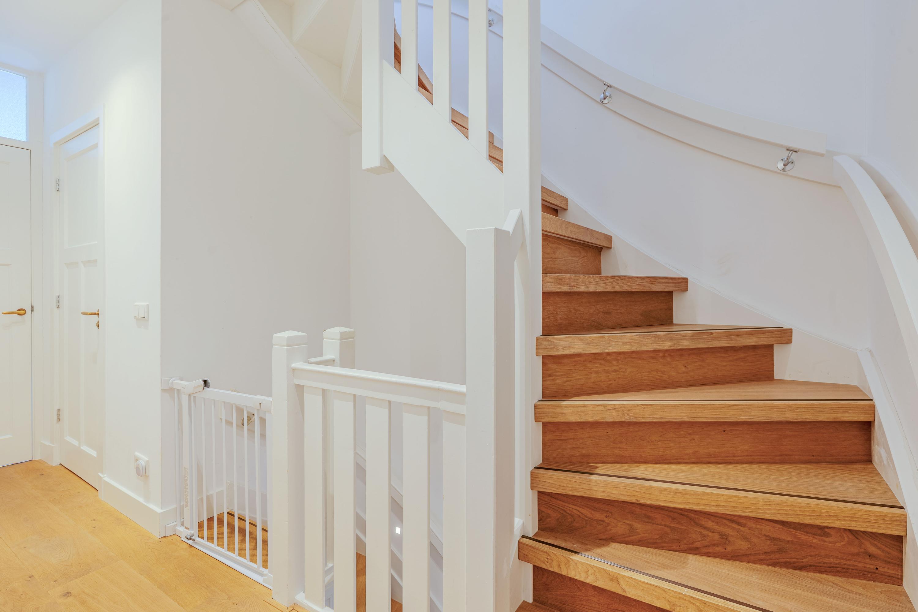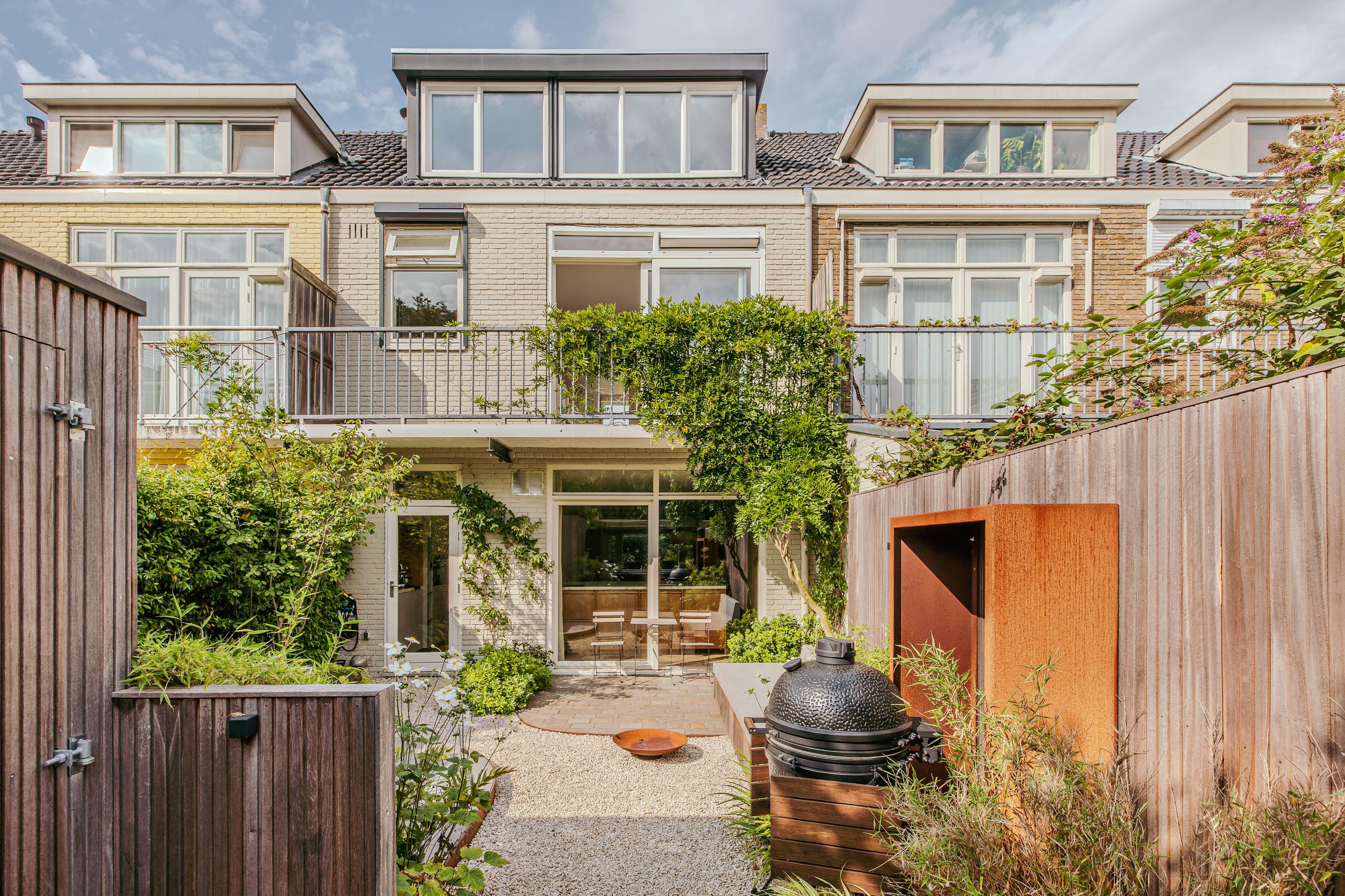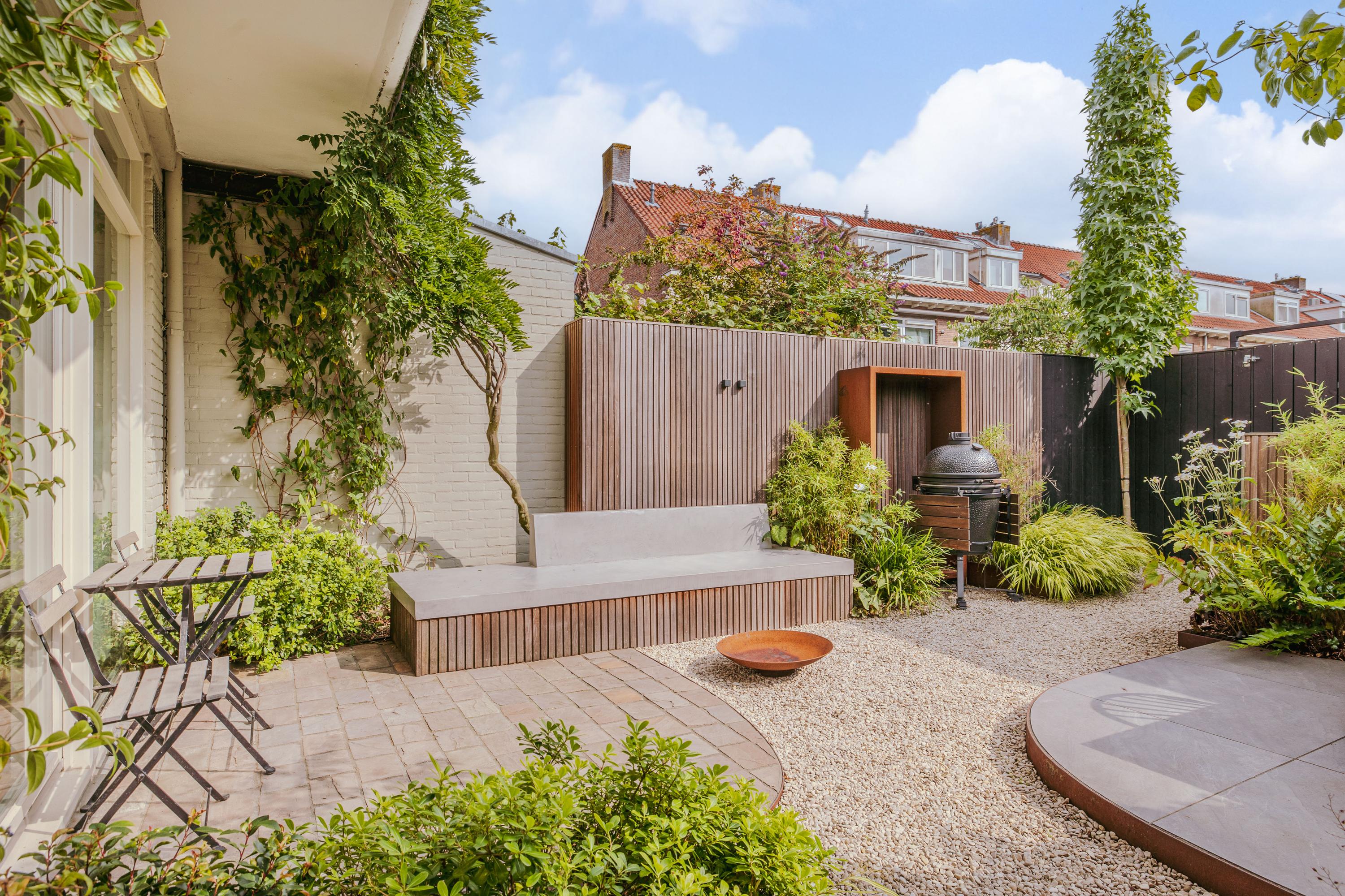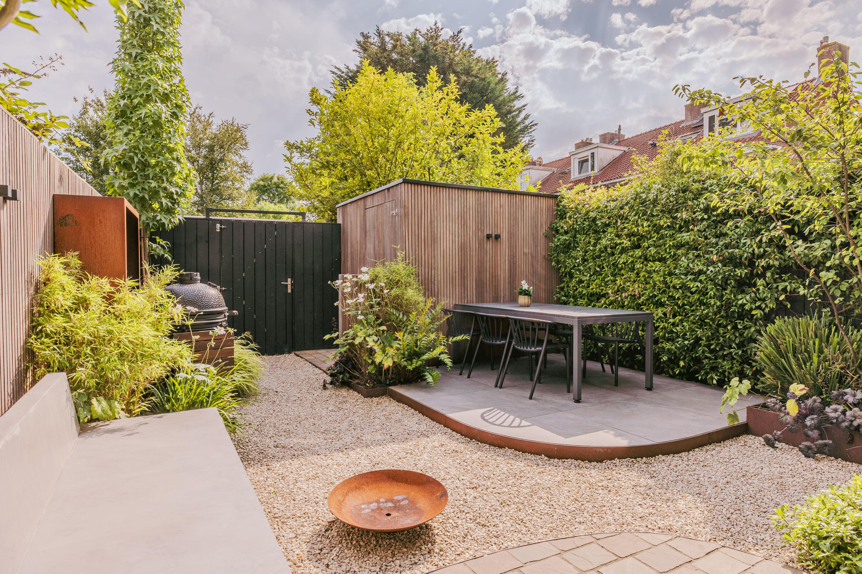 Through the well-kept front garden you reach the entrance of the house. The hallway features a practical storage cupboard under the stairs and a separate toilet with washbasin. From here you have access to the bright living room and the spacious open-plan kitchen at the rear. The property was fully renovated in 2021 and fitted with an oak herringbone floor with underfloor heating. The luxurious kitchen is designed with a central cooking island and high-quality built-in appliances, including a Bora induction hob with integrated extractor, Quooker tap, sink, climate-controlled wine cabinet, two combination ovens (one with steam function), fridge, freezer and dishwasher. The natural stone countertop made of Taj Mahal quartzite gives the kitchen a refined look. Thanks to the large windows and the glass door to the garden, this floor benefits from plenty of natural light. The rear garden (41 m², south-facing) was designed and landscaped in 2022 by a professional garden architect, and is equipped with lighting, irrigation, and a detached storage shed (approx. 6 m²) with electricity.