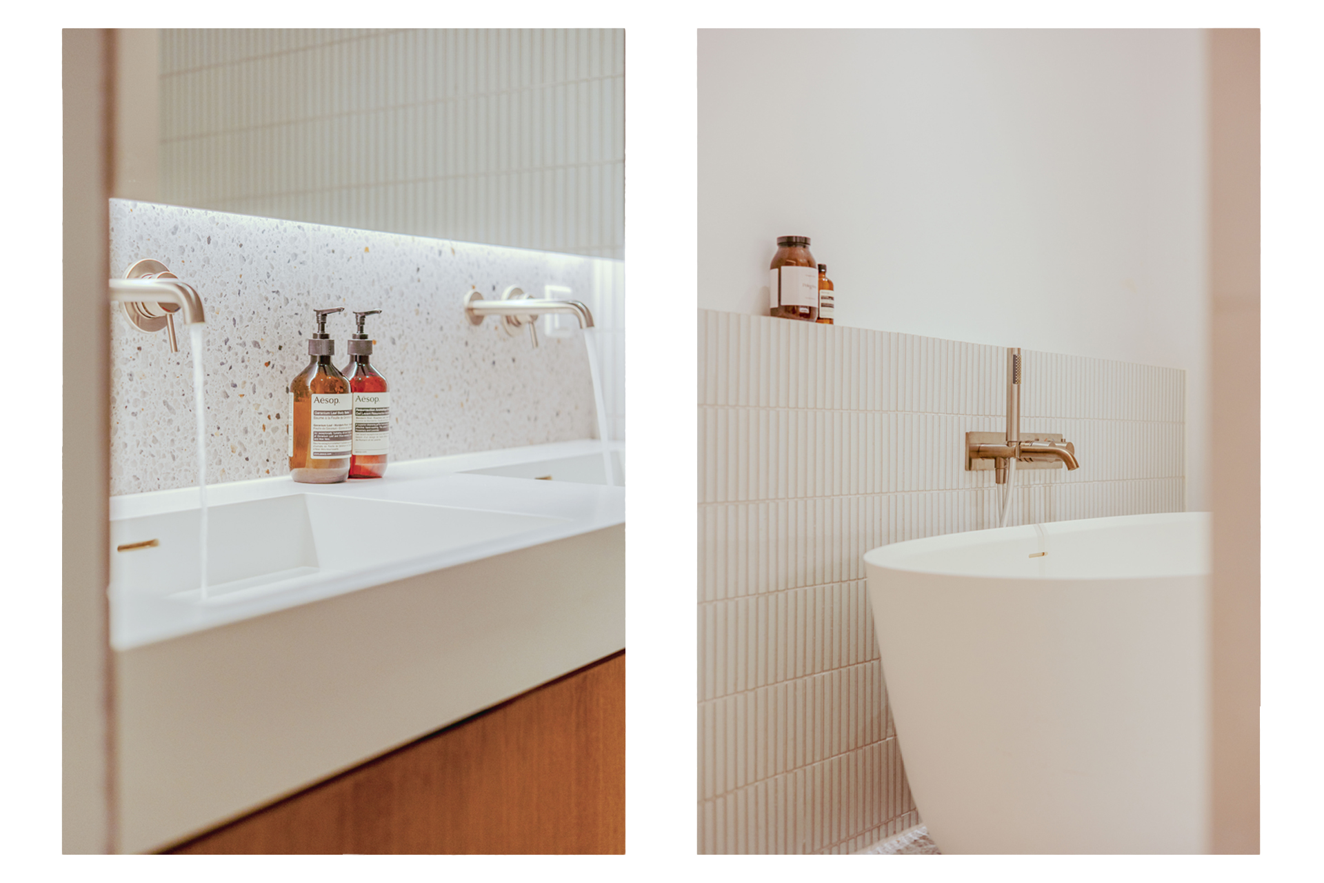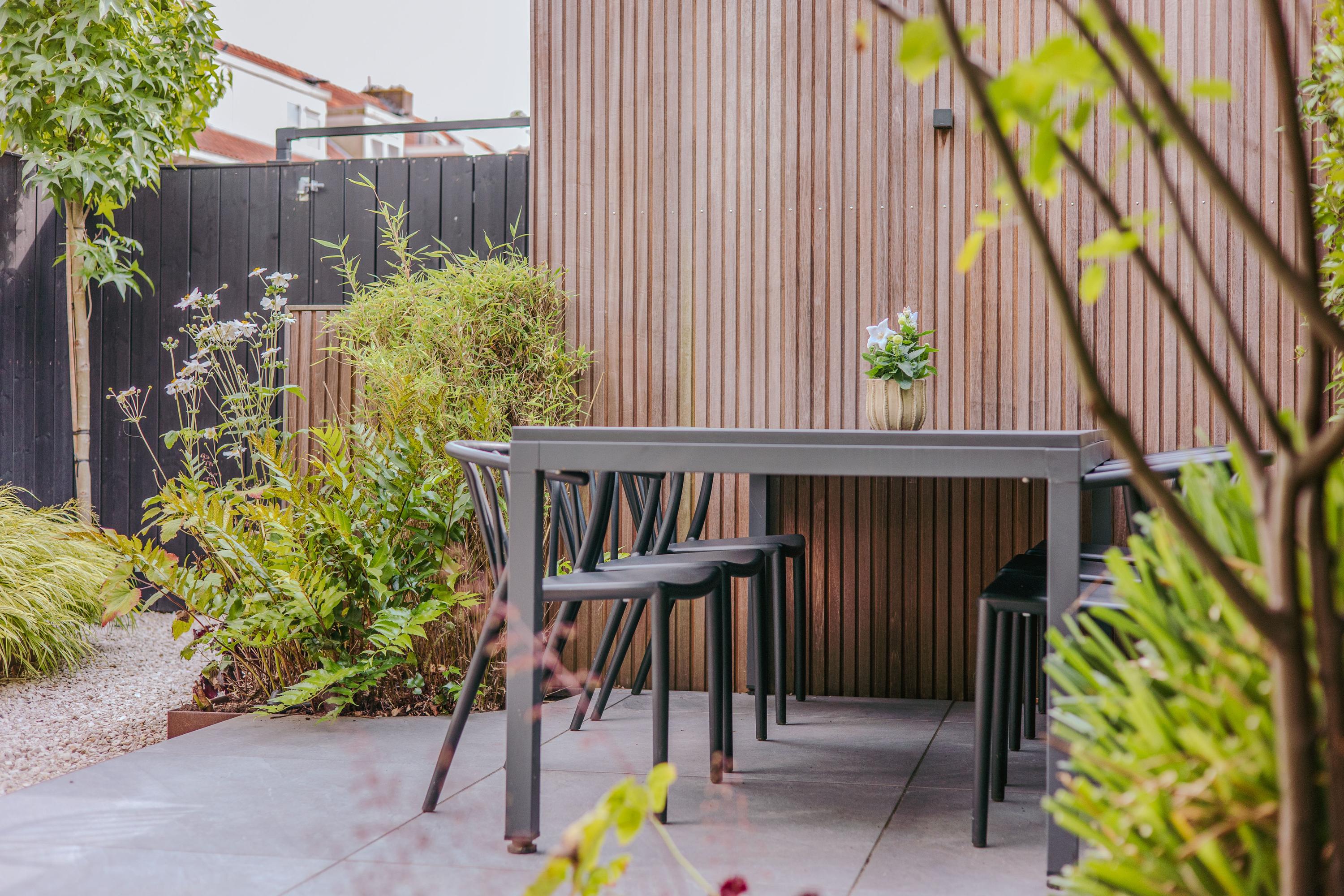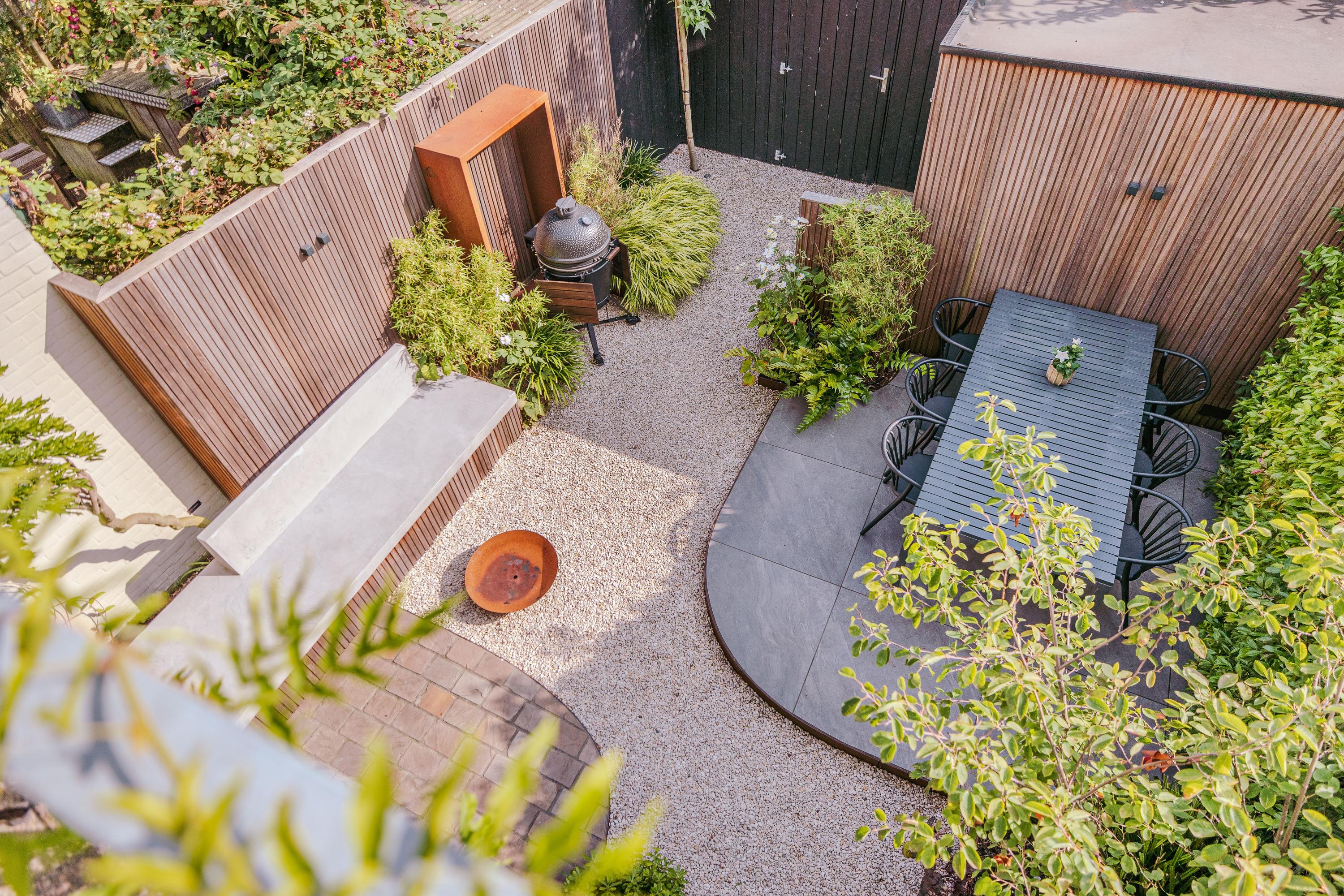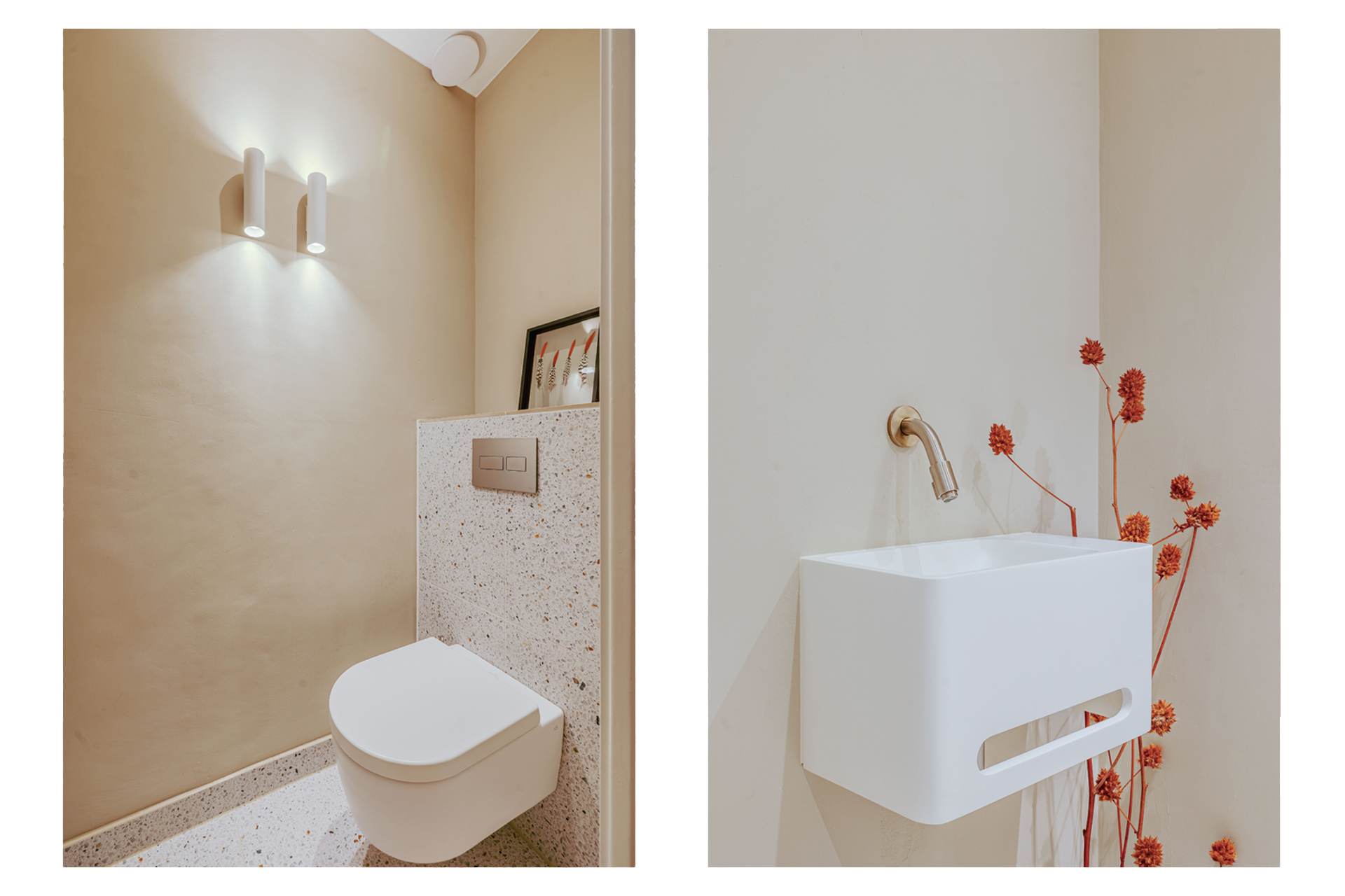 Through the well-kept front garden you reach the entrance of the house. The hallway features a practical storage cupboard under the stairs and a separate toilet with washbasin. From here you have access to the bright living room and the spacious open-plan kitchen at the rear. The property was fully renovated in 2021 and fitted with an oak herringbone floor with underfloor heating. The luxurious kitchen is designed with a central cooking island and high-quality built-in appliances, including a Bora induction hob with integrated extractor, Quooker tap, sink, climate-controlled wine cabinet, two combination ovens (one with steam function), fridge, freezer and dishwasher. The natural stone countertop made of Taj Mahal quartzite gives the kitchen a refined look. Thanks to the large windows and the glass door to the garden, this floor benefits from plenty of natural light. The rear garden (41 m², south-facing) was designed and landscaped in 2022 by a professional garden architect, and is equipped with lighting, irrigation, and a detached storage shed (approx. 6 m²) with electricity.