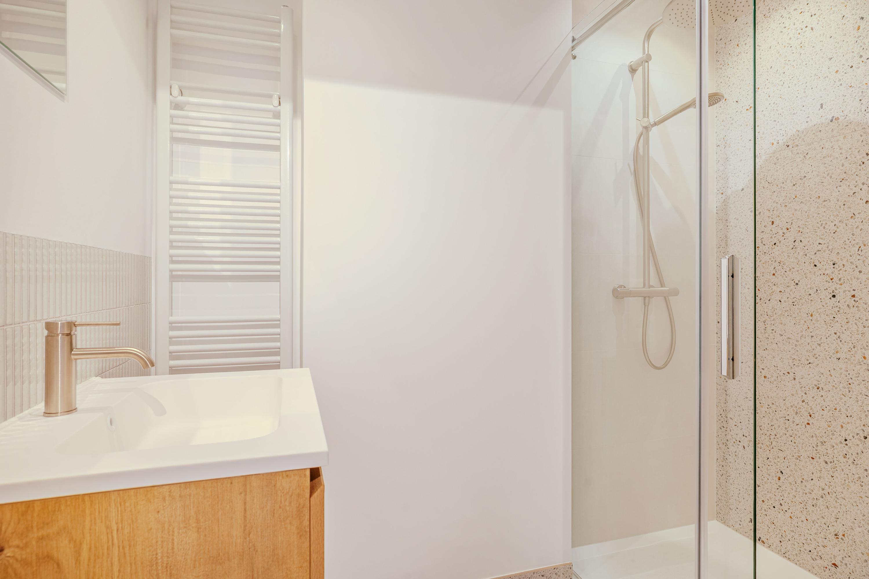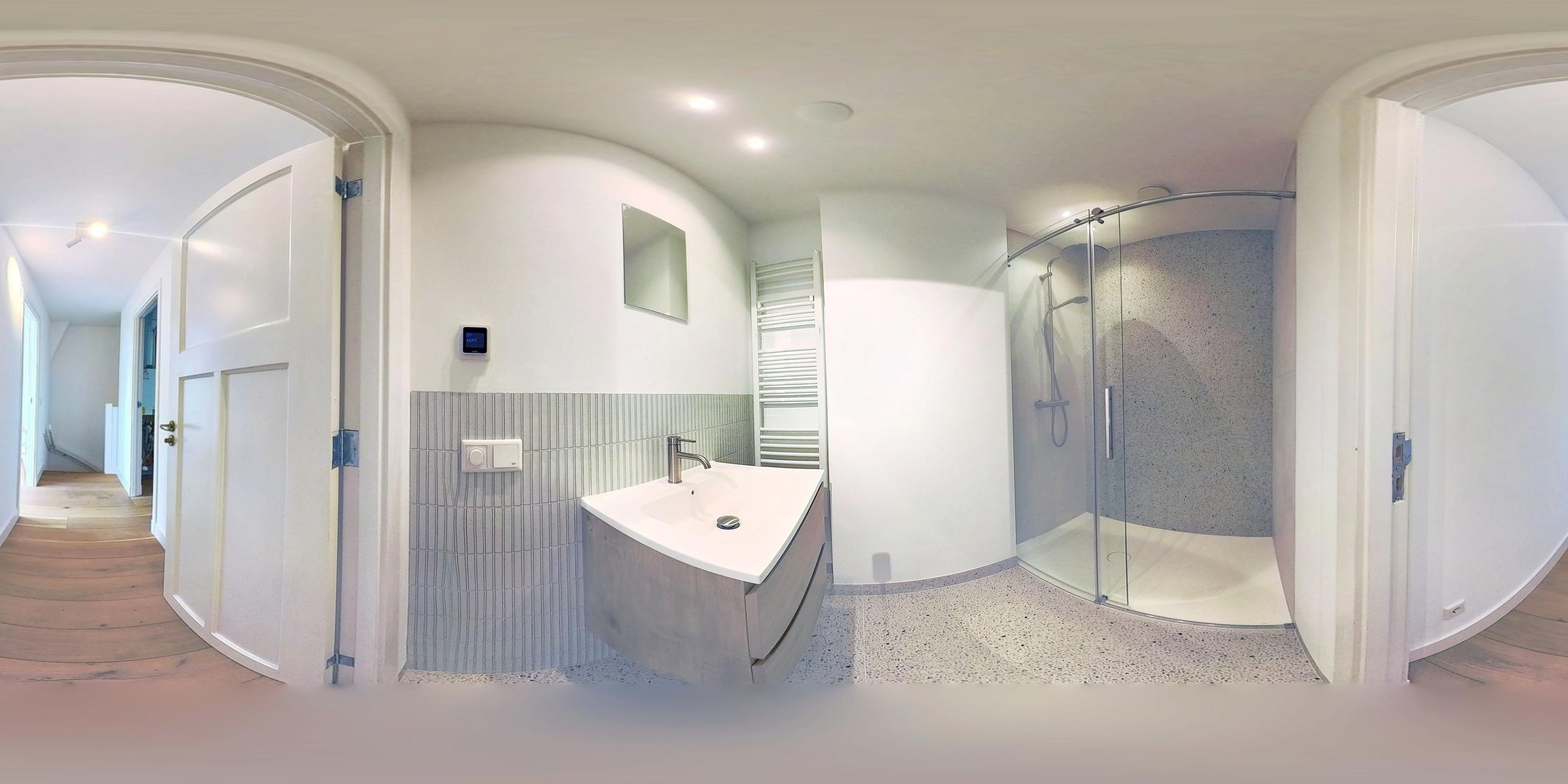 The second floor offers a spacious bedroom (which can be divided into two rooms if desired) with a new dormer window (2021) featuring triple glazing and electric sun blinds. In addition, there is a second room, ideal as a guest room or study, with connections for a washing machine and dryer. This floor also includes a second bathroom with walk-in shower, washbasin with cabinet, and underfloor heating.