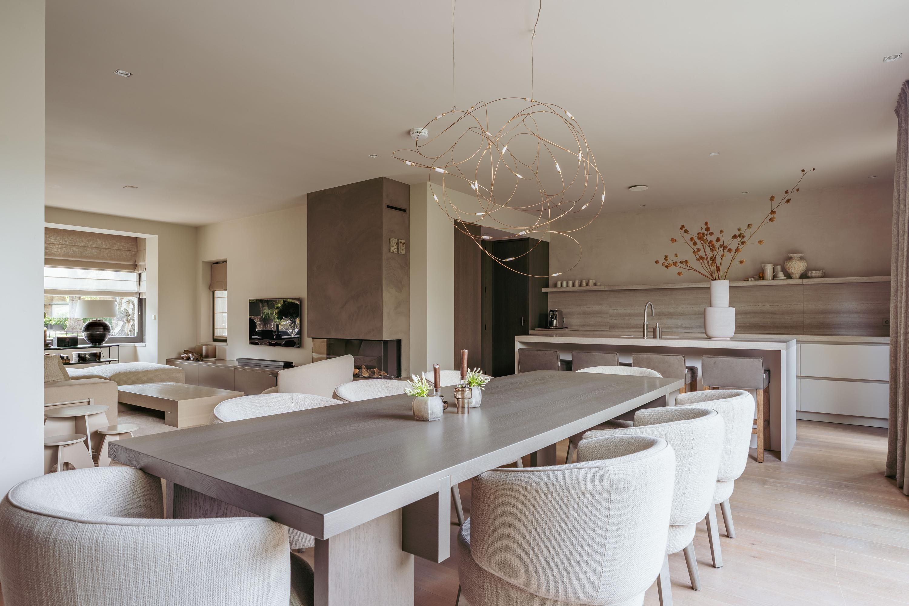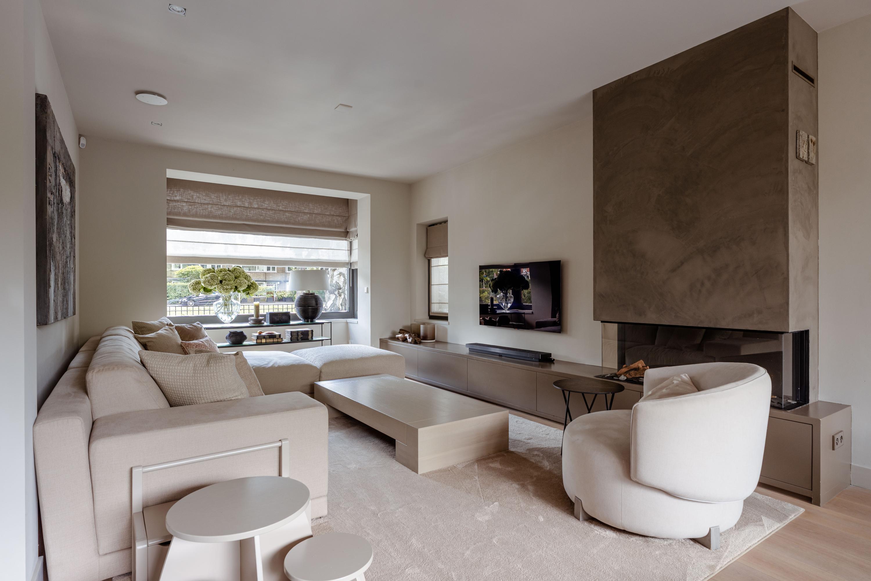 The living room forms the beating heart of this residence. A striking gas fireplace, finished floor-to-ceiling in grey béton ciré, serves as a dramatic centerpiece. A bespoke TV cabinet and grey-washed oak parquet flooring create a timeless and inviting atmosphere. Expansive windows provide abundant natural light and seamless connection to the garden, while the generous width of the space adds to the sense of openness. From the sofa, you enjoy serene water views, and the considerable distance to neighboring properties ensures excellent privacy.