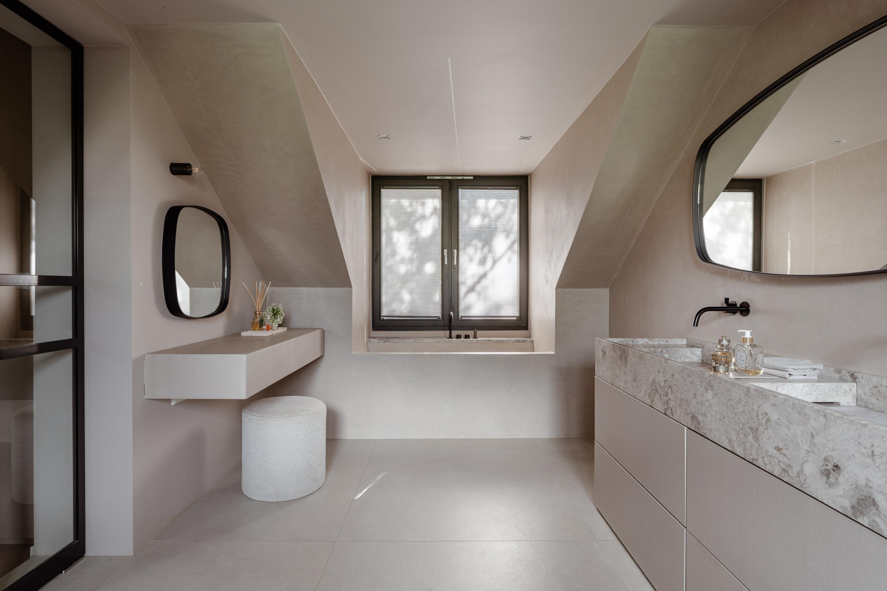 The master bathroom, designed by Piet Boon, is finished in exclusive materials: a double sink in Portuguese marble with COCOON built-in faucets, a béton ciré bathtub, and a large walk-in rain shower with glass door all combine to create a spa-like experience at home.