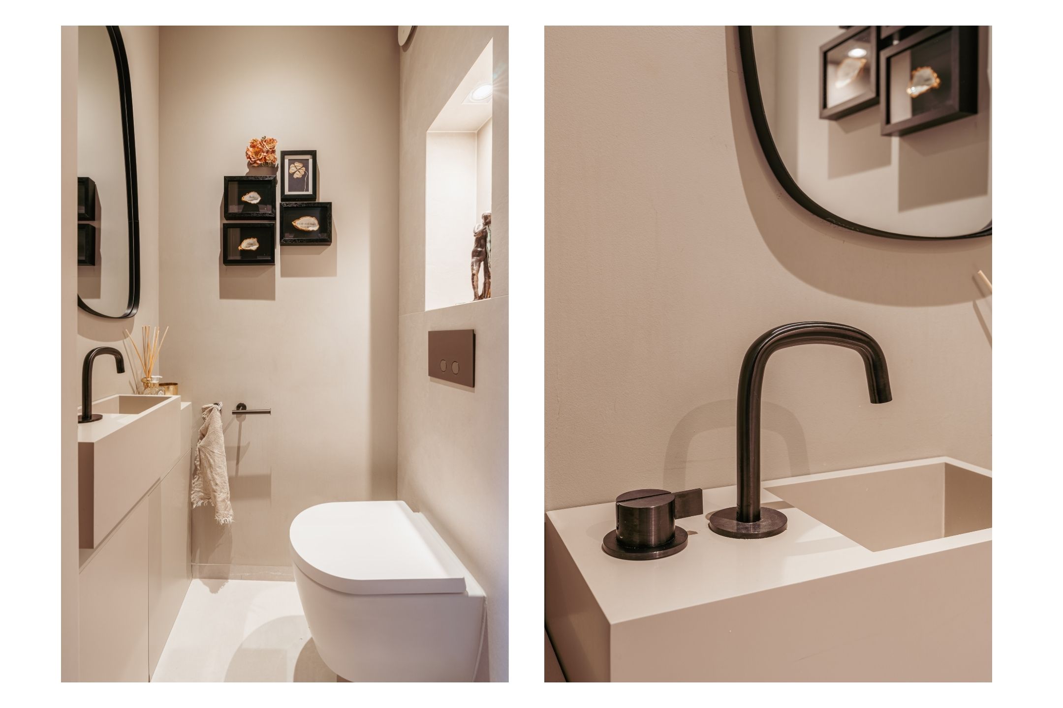 The front garden radiates elegance, with a private driveway secured by an anthracite-grey electric sliding gate. Upon entry, it becomes immediately clear that every detail has been carefully considered. The steel front door—an anthracite-grey classic, adapted to modern insulation standards—sets the tone for what lies inside. The hallway features a custom-built wardrobe with light wood veneer doors, a designer toilet with Piet Boon COCOON faucet, and an oak staircase with steel railings. From here, tall pivot doors lead you into the living room.