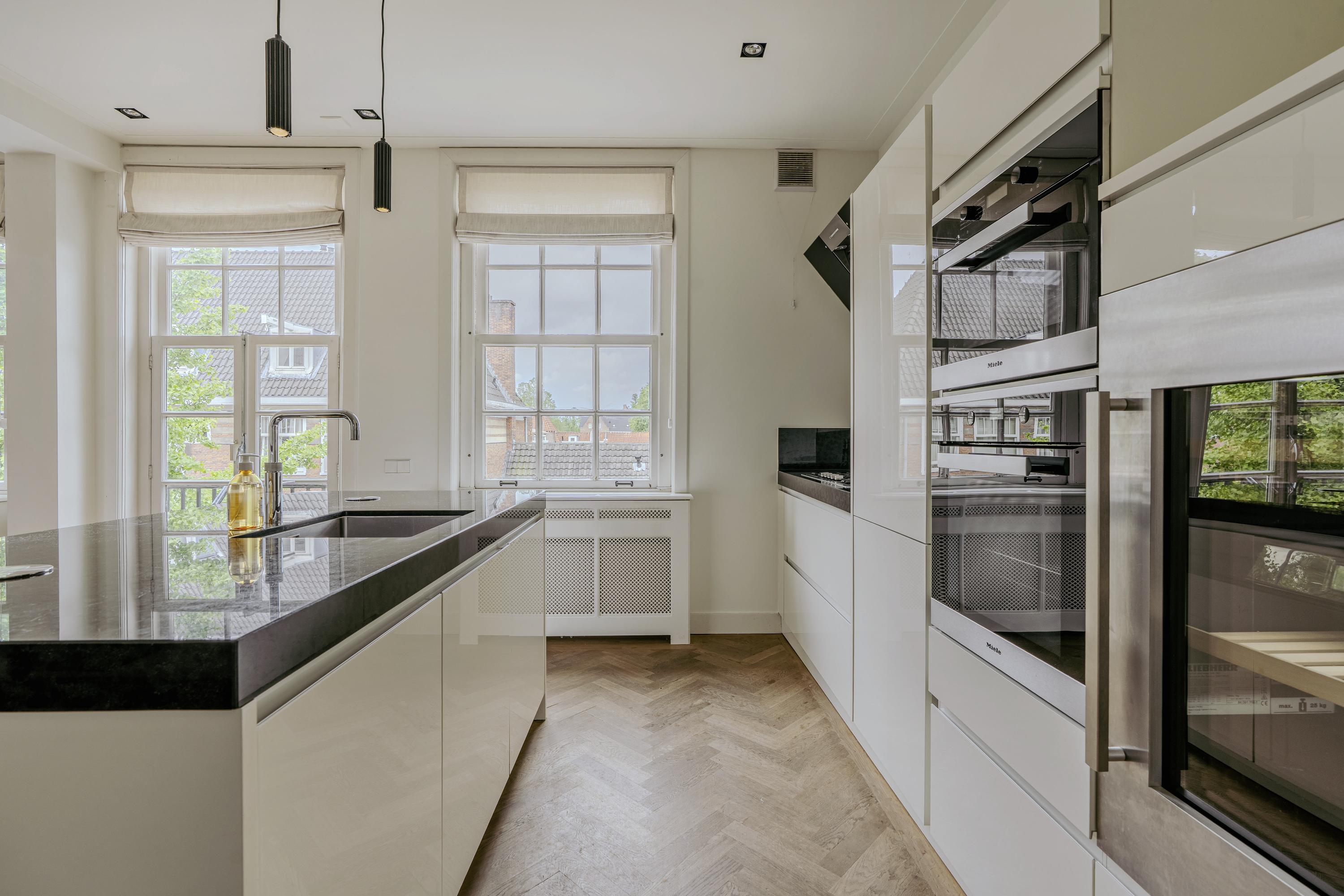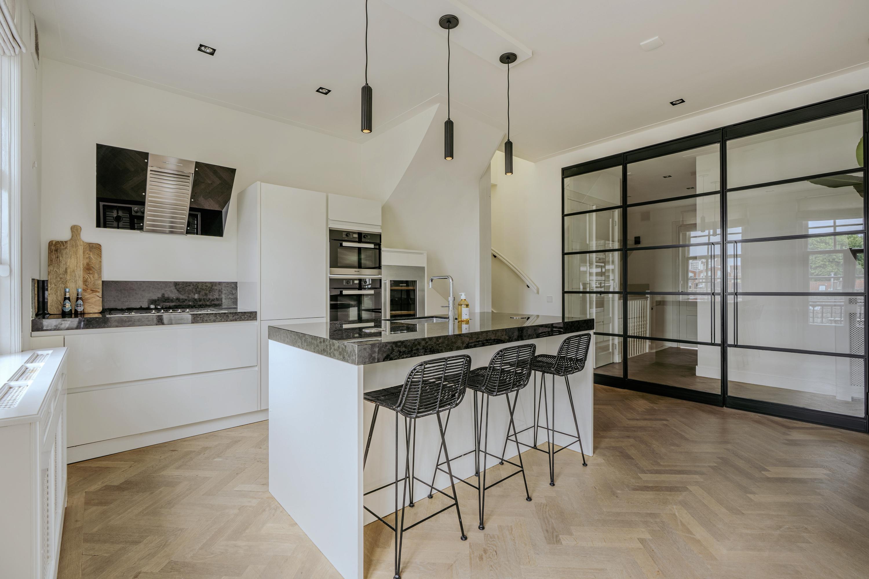 From the hall, elegant steel-framed doors open into a bright and expansive living area. At the front, you'll find a luxurious open-plan kitchen fully equipped with high-end built-in appliances: a 5-burner gas stove, oven, microwave, Quooker, refrigerator, freezer, wine cooler, and dishwasher. The generous kitchen island with bar seating is the social centerpiece of the home, ideal for relaxed evenings with family and friends.