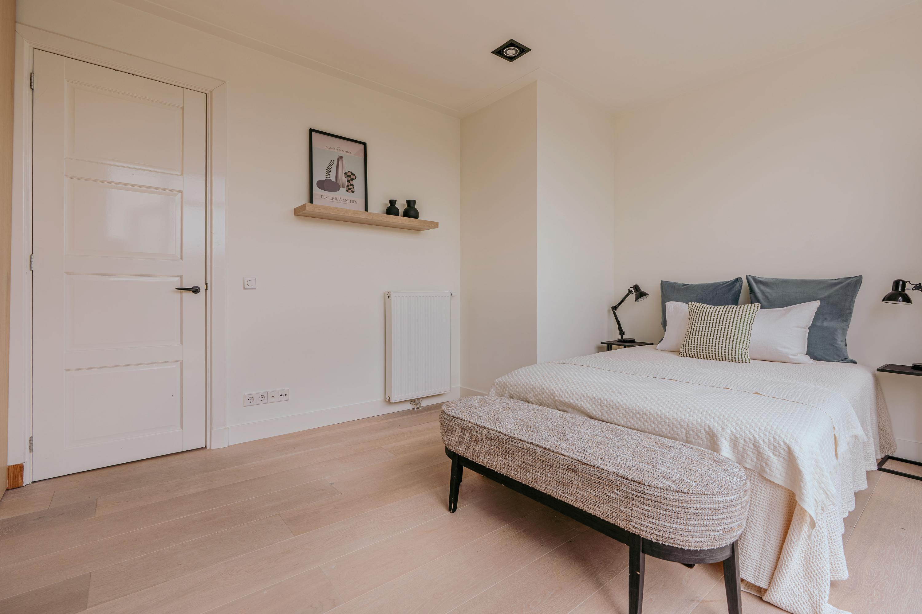 The landing—boasting impressive ceiling height reaching into the roofline, skylights, and clever storage—gives access to all rooms on this level. At the rear is a comfortable bedroom with built-in wardrobes and French doors to a sunny roof terrace. The master bedroom spans the full depth of the building and features air conditioning, custom-made wardrobes, and beautiful original wooden beams that create a warm and inviting atmosphere. Double doors open directly onto the spacious roof terrace—an exceptionally private outdoor area where you can soak up the sun in complete peace. Centrally located on this floor is the stylish bathroom, luxuriously appointed with underfloor heating, a freestanding bathtub, walk-in shower, double washbasin with cabinet, and a second toilet. Large skylights provide plenty of natural light.