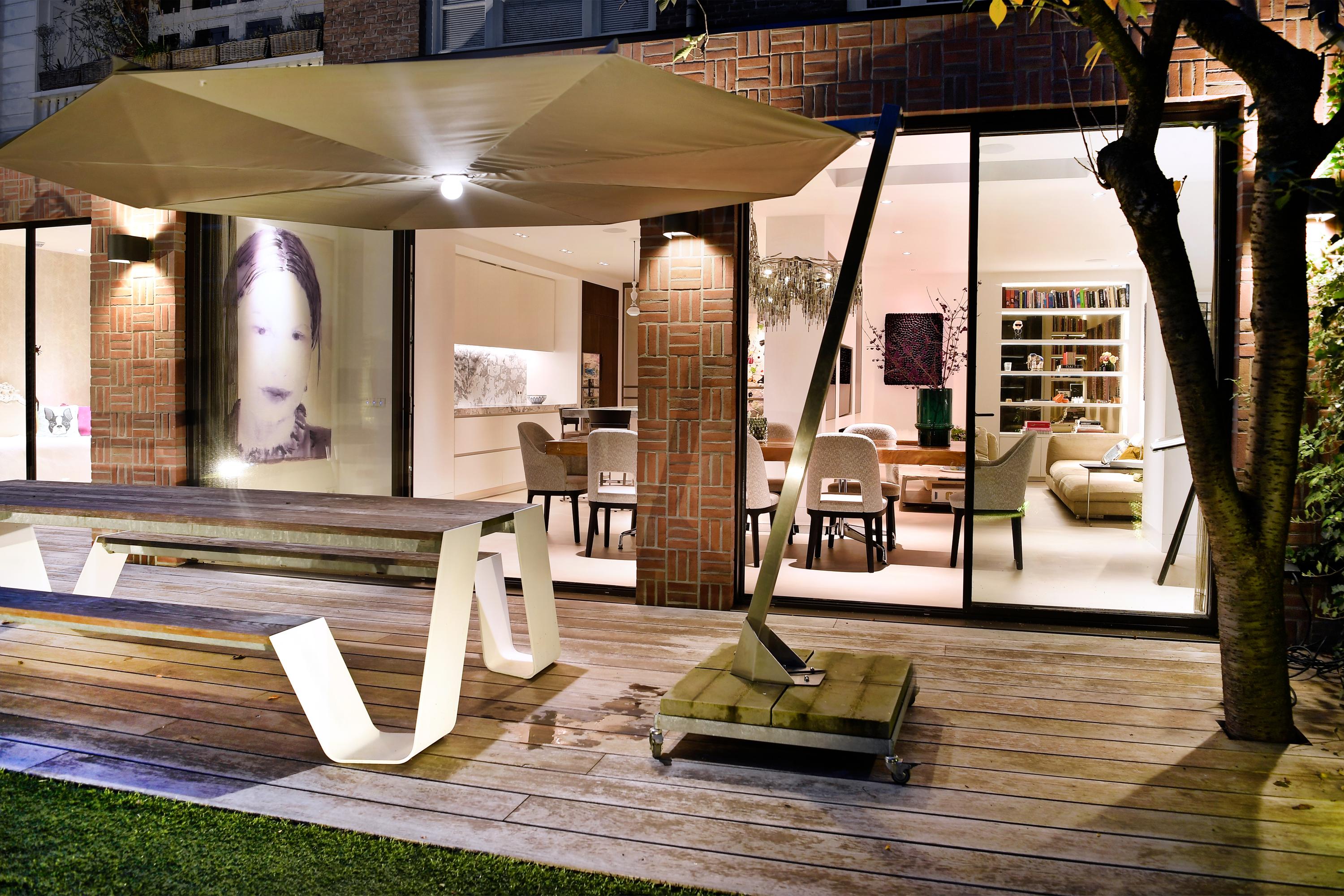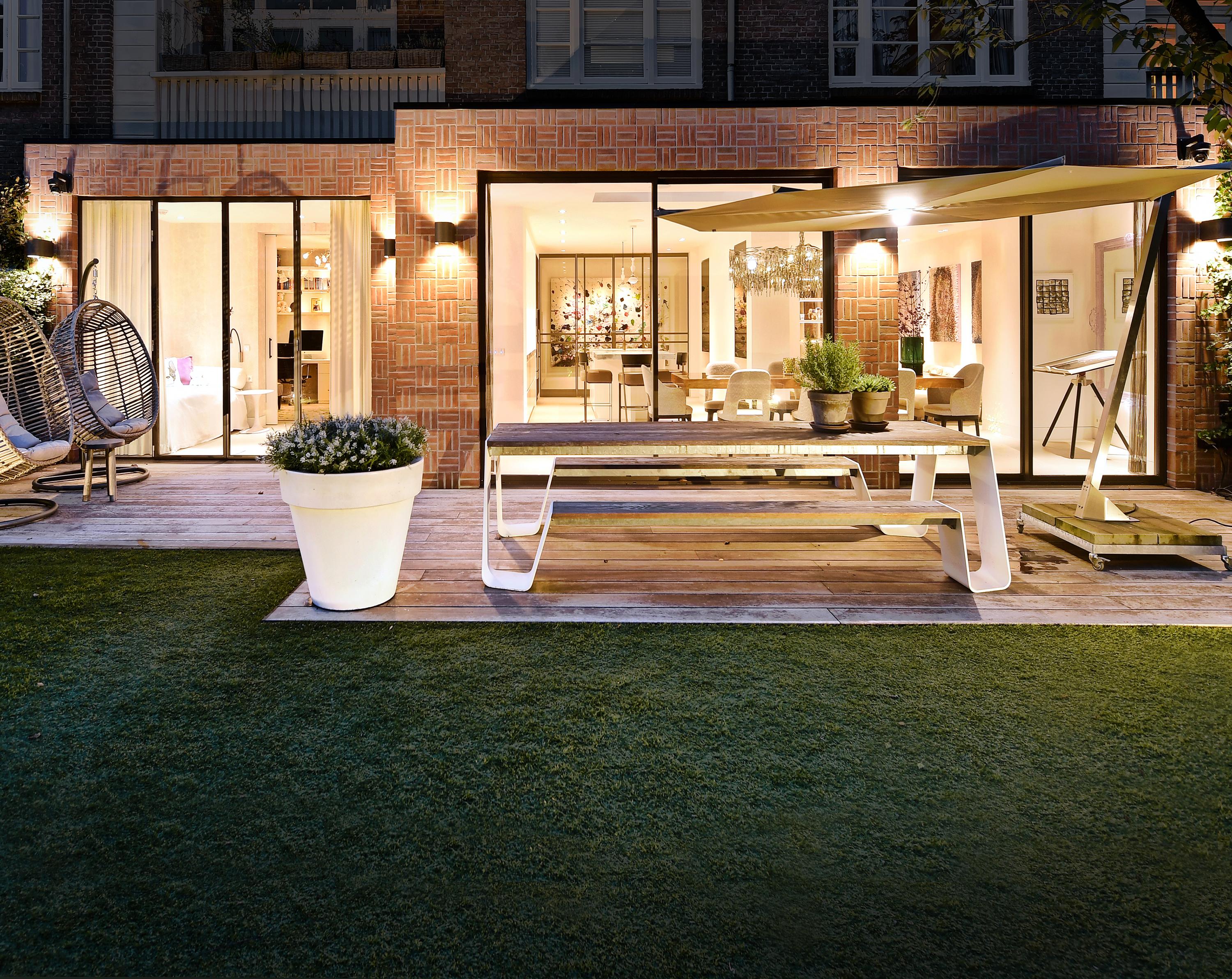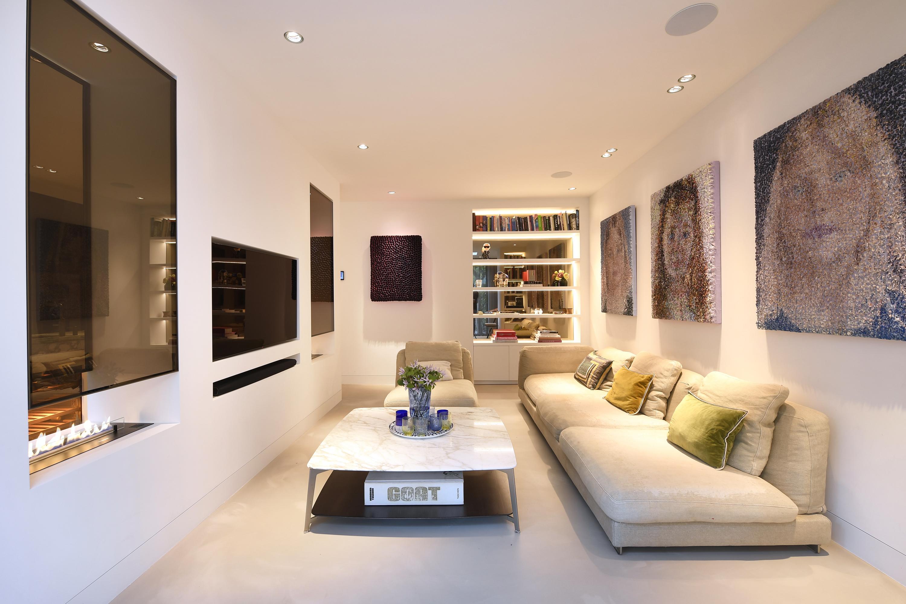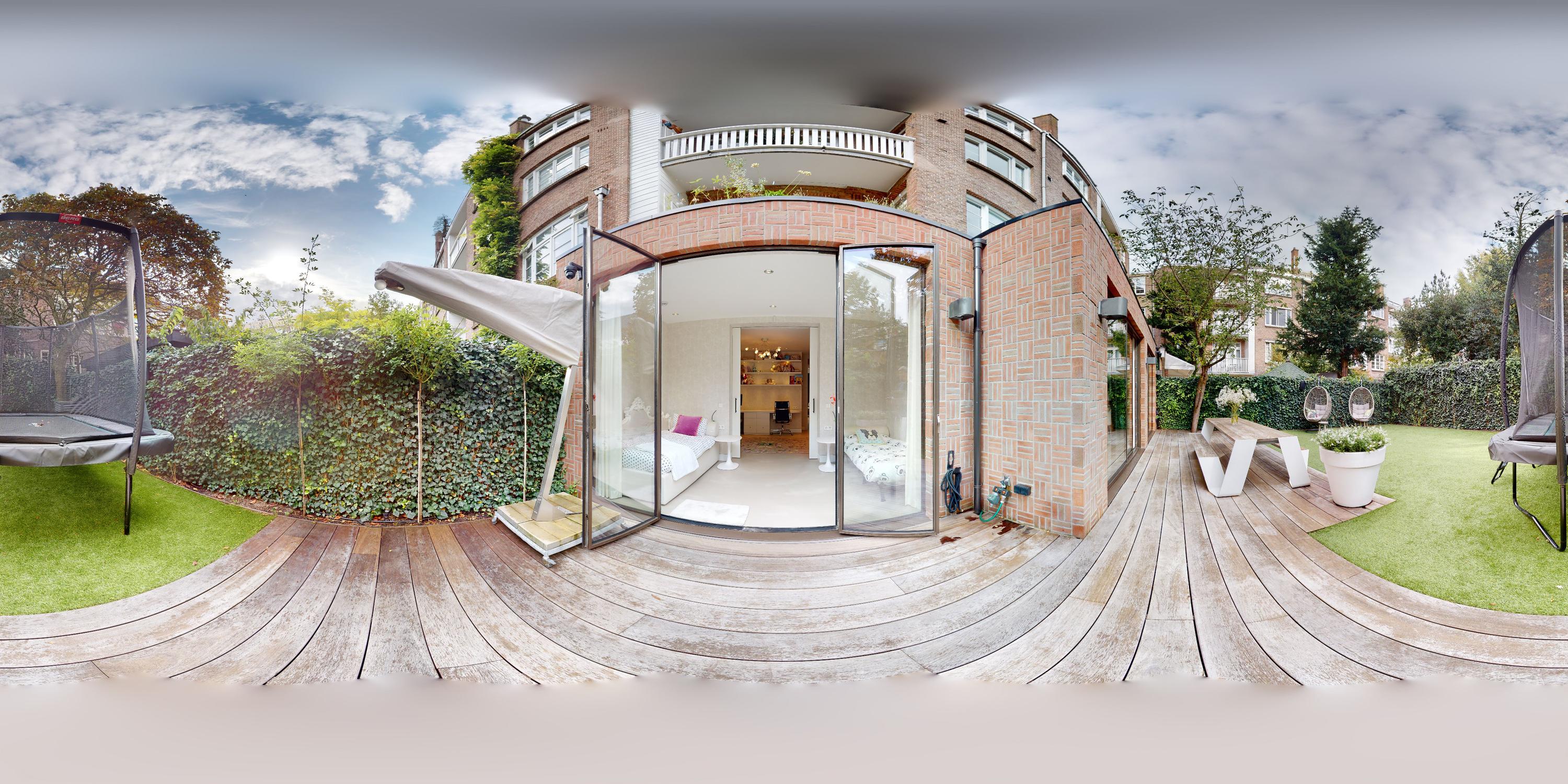 There is a bedroom at the back of this floor too, part of which extends into the extension; it opens out into the back garden via French doors. This large bedroom has a built-in desk and wall unit and sliding doors. A luxury bathroom on this floor is accessed from the hall and has a double, natural-stone washbasin vanity unit, a toilet and a large shower.