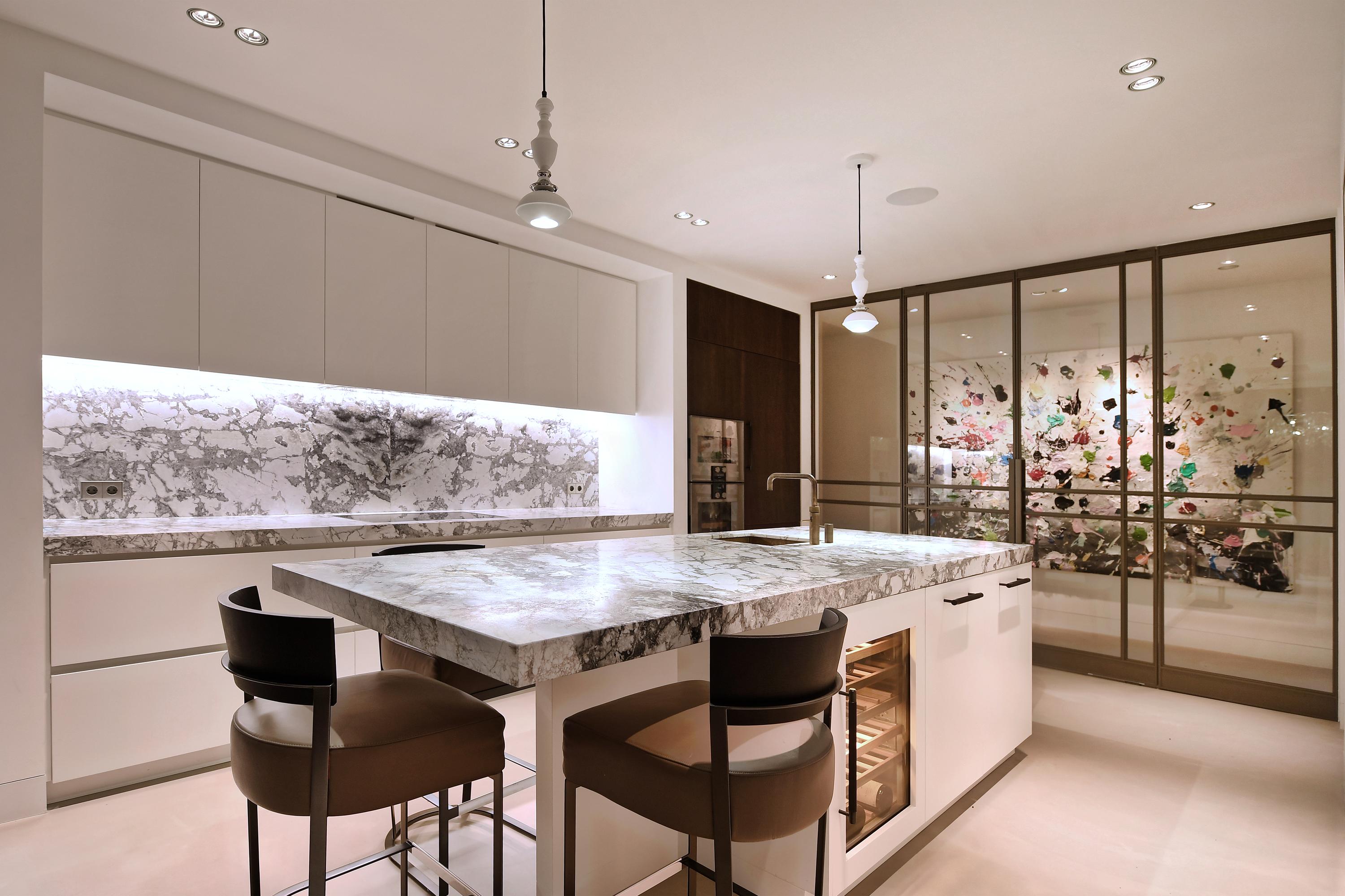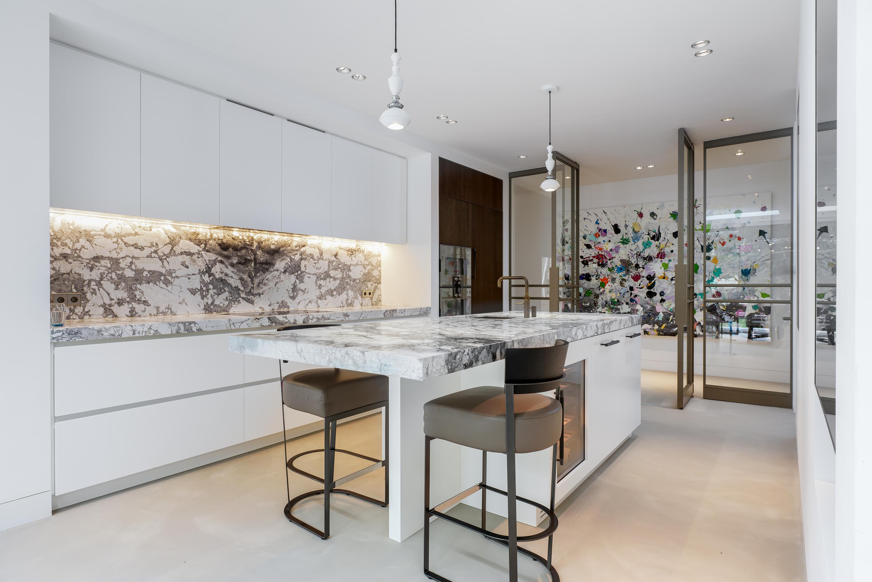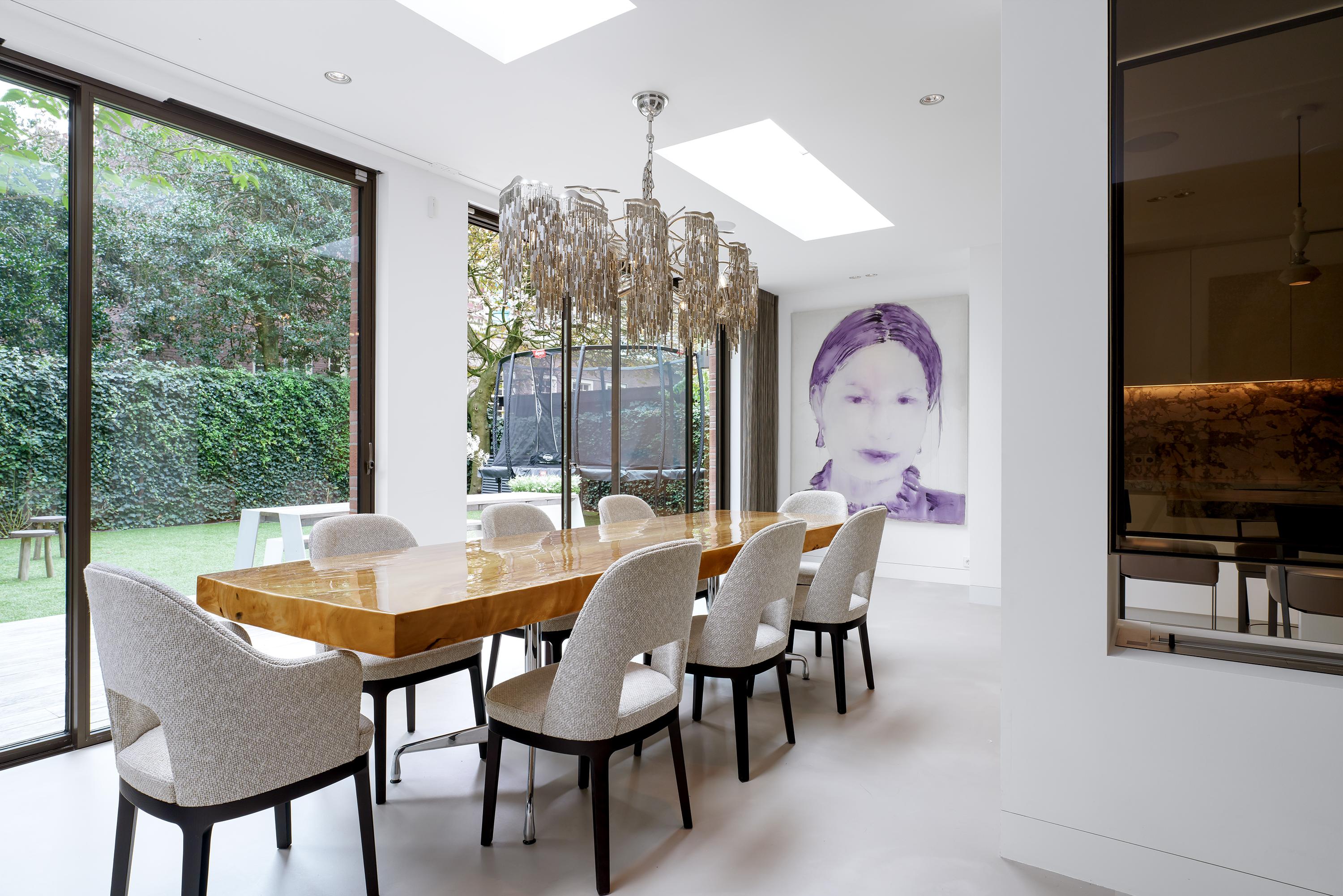 At the back of this floor, there is a large living space with a lovely, luxury kitchen, which really does come with everything you might expect: a sink island with a Quooker tap and also a cooler, oven, combi steam oven, hot plate, fridge, freezer, induction hob and built-in extractor unit. All the built-in appliances are by Gaggenau. The kitchen’s pièce de résistance is a special alcove with a pull-out unit for a coffee machine. Two attractive ethanol fireplaces separate the kitchen from the living-room area. The living space has been fitted with a number of built-in cupboards. The dining-room area, which is located in the extension, is next to the kitchen and the living-room area and comes complete with electric curtains. Skylights flood this space with light. A sliding door gives access to the large, south-east facing back garden.