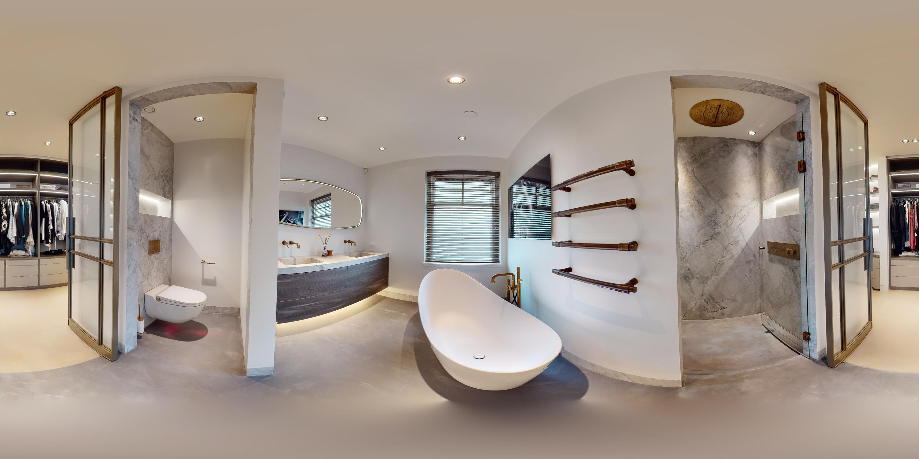 The master bedroom is situated at the front of the apartment on this floor. This spacious room has a large walk-in closet on both sides and a built-in dressing table. The master bedroom also has a luxury en-suite bathroom with a stand-alone bath, large rain shower, a double, natural-stone washbasin vanity unit and a shower-toilet.