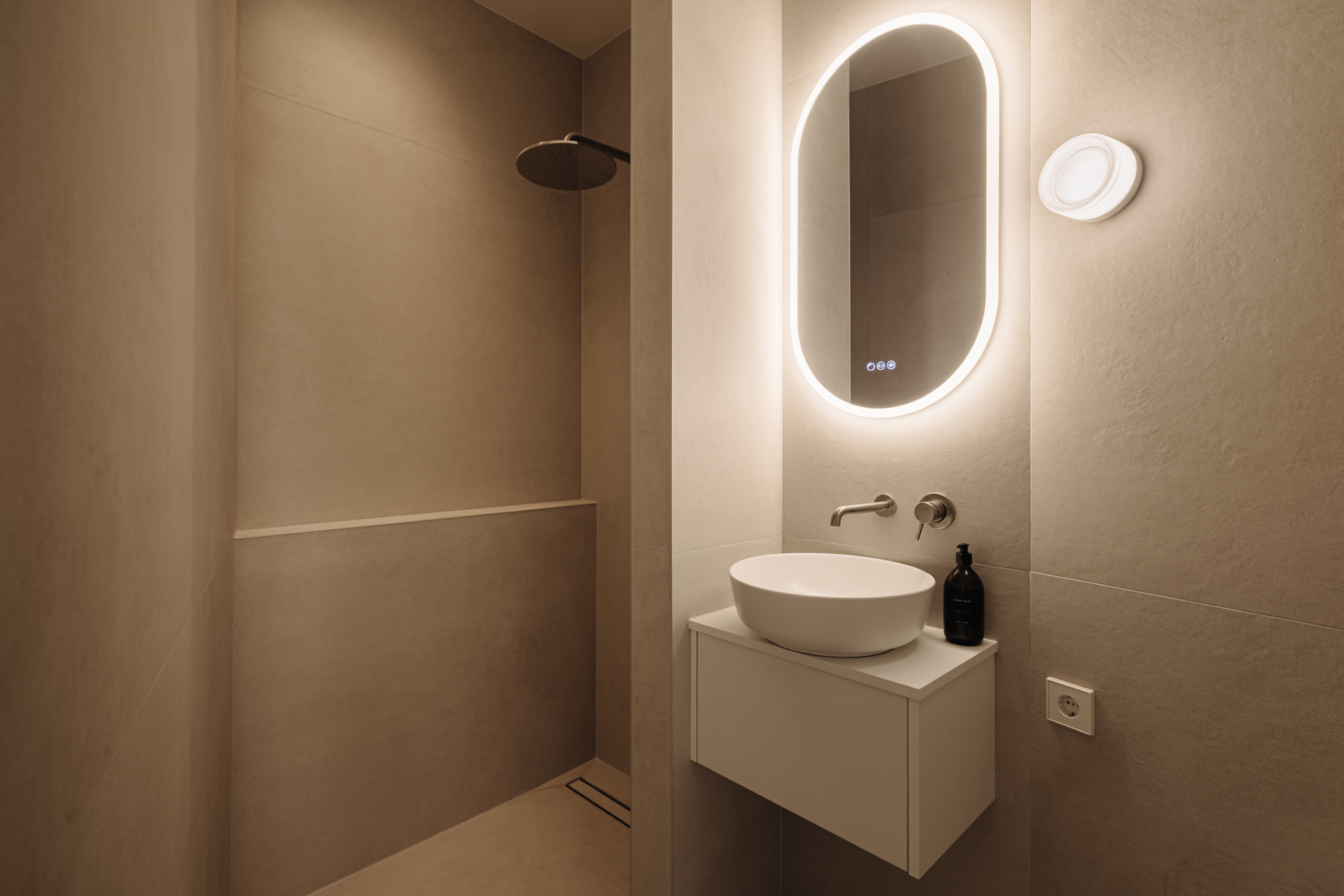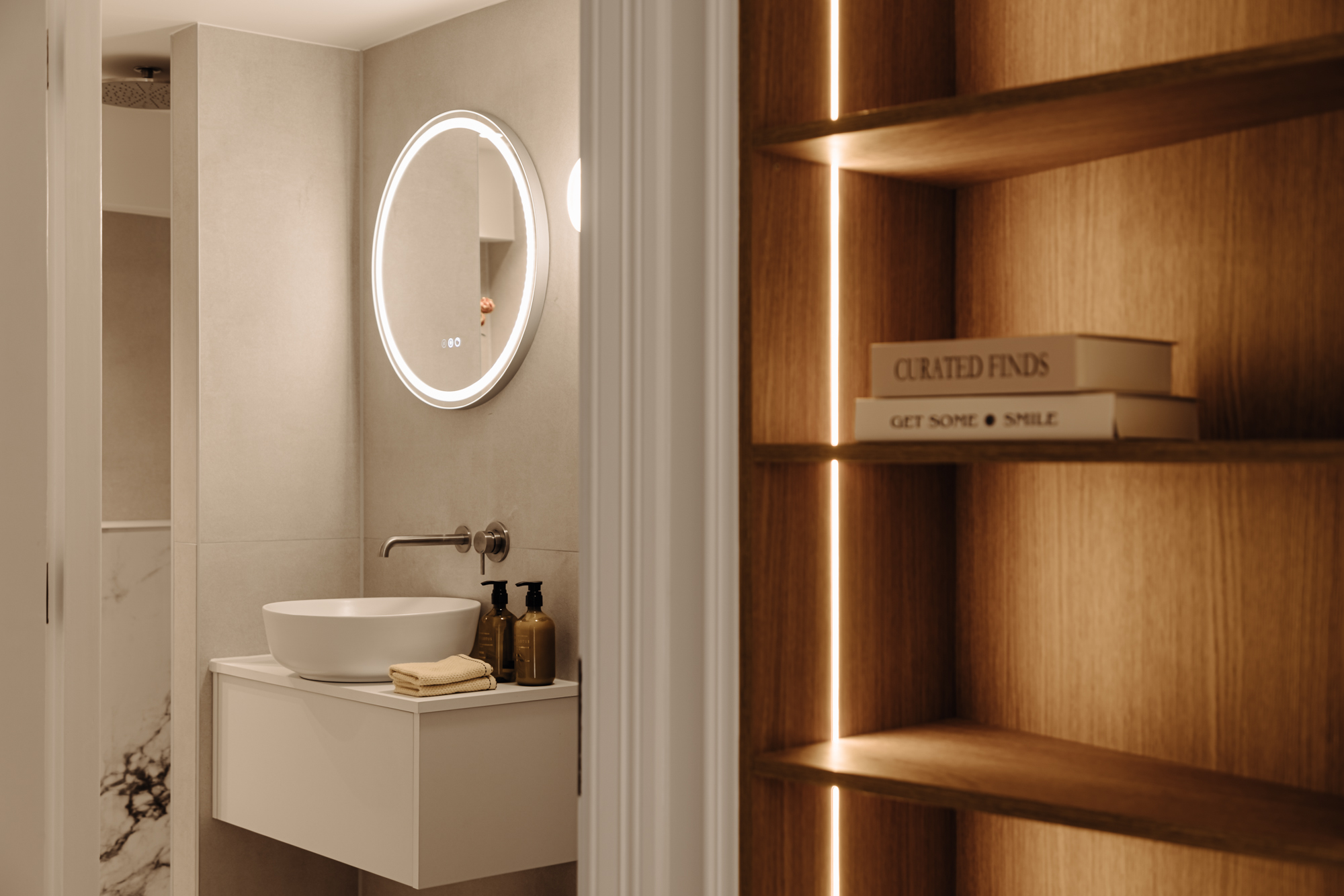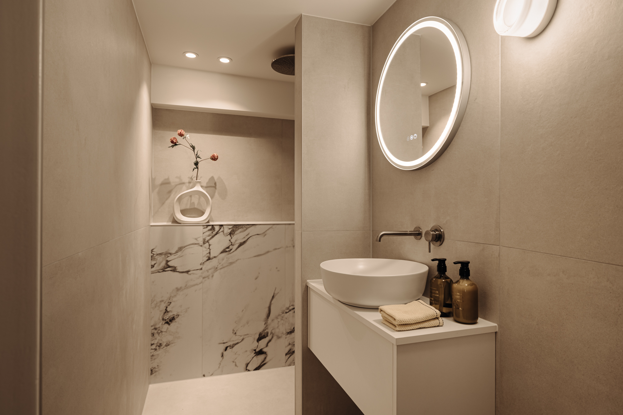 The lower ground floor is arranged as a comfortable sleeping level. At the front is the spacious master bedroom with built-in wardrobes and an en-suite bathroom featuring a walk-in rain shower and double washbasin. At the rear is the second large bedroom, also with its own bathroom equipped with a walk-in shower and washbasin. From this room, there is access to the attractively landscaped rear garden of approximately 18 m². A separate toilet is accessible from the hallway. In addition, the landing provides access to an internal storage room with connections for a washing machine and dryer.