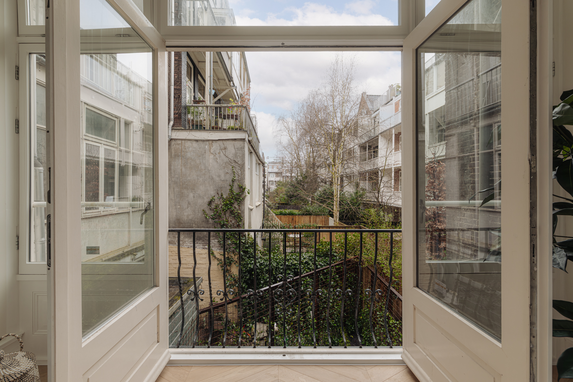 Through the private entrance, you enter the vestibule, leading into a spacious and elegant hallway that provides access to the various rooms. At the front is the generous living room, spanning the full width of the property and featuring three large windows that provide abundant natural light. At the rear is the first spacious bedroom with an en-suite bathroom equipped with a walk-in shower and washbasin. From this room, there is access to the first internal balcony, offering beautiful and unobstructed views over the green inner gardens of Van Eeghenstraat. A guest toilet is accessible from the hallway.
