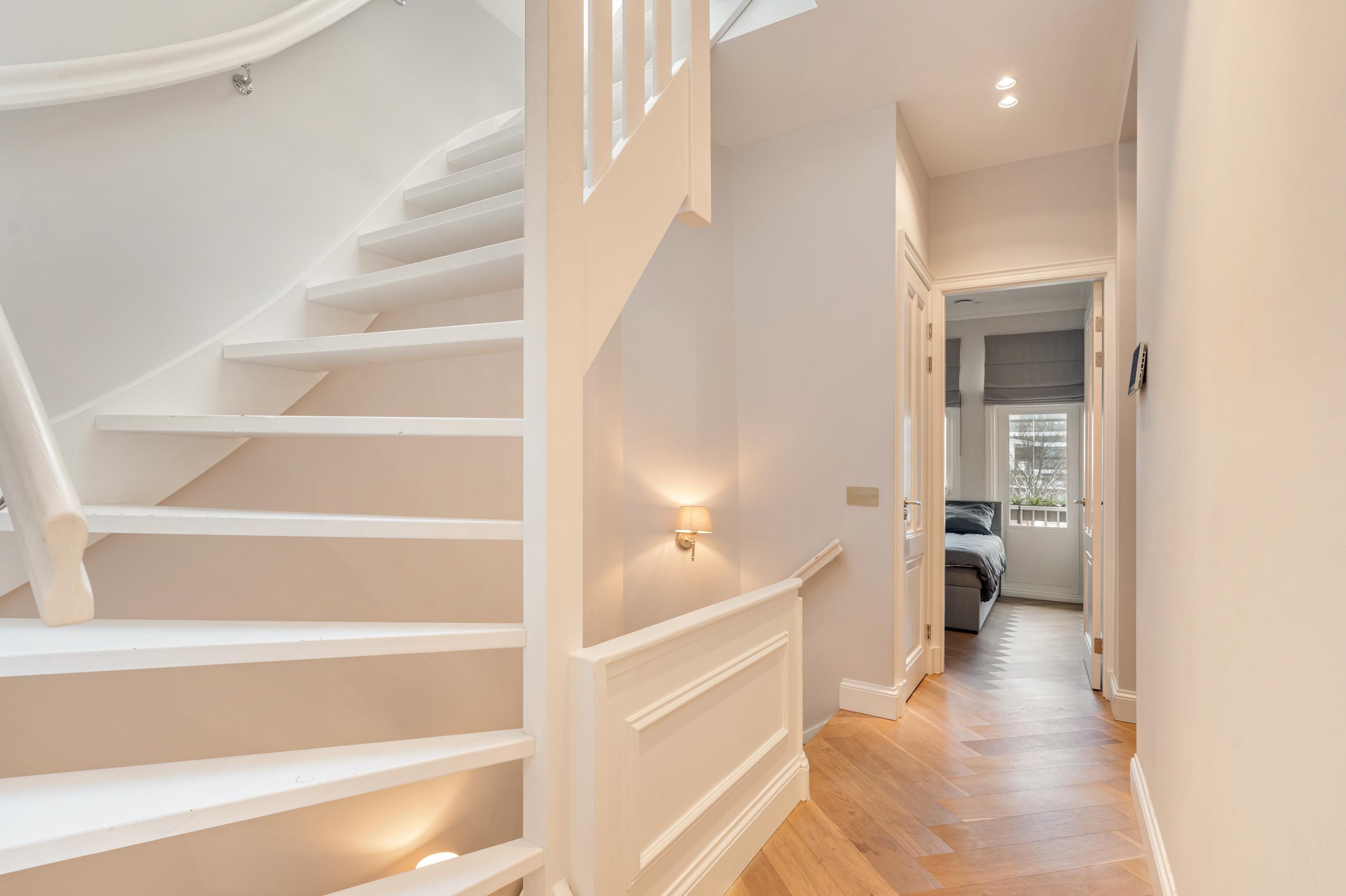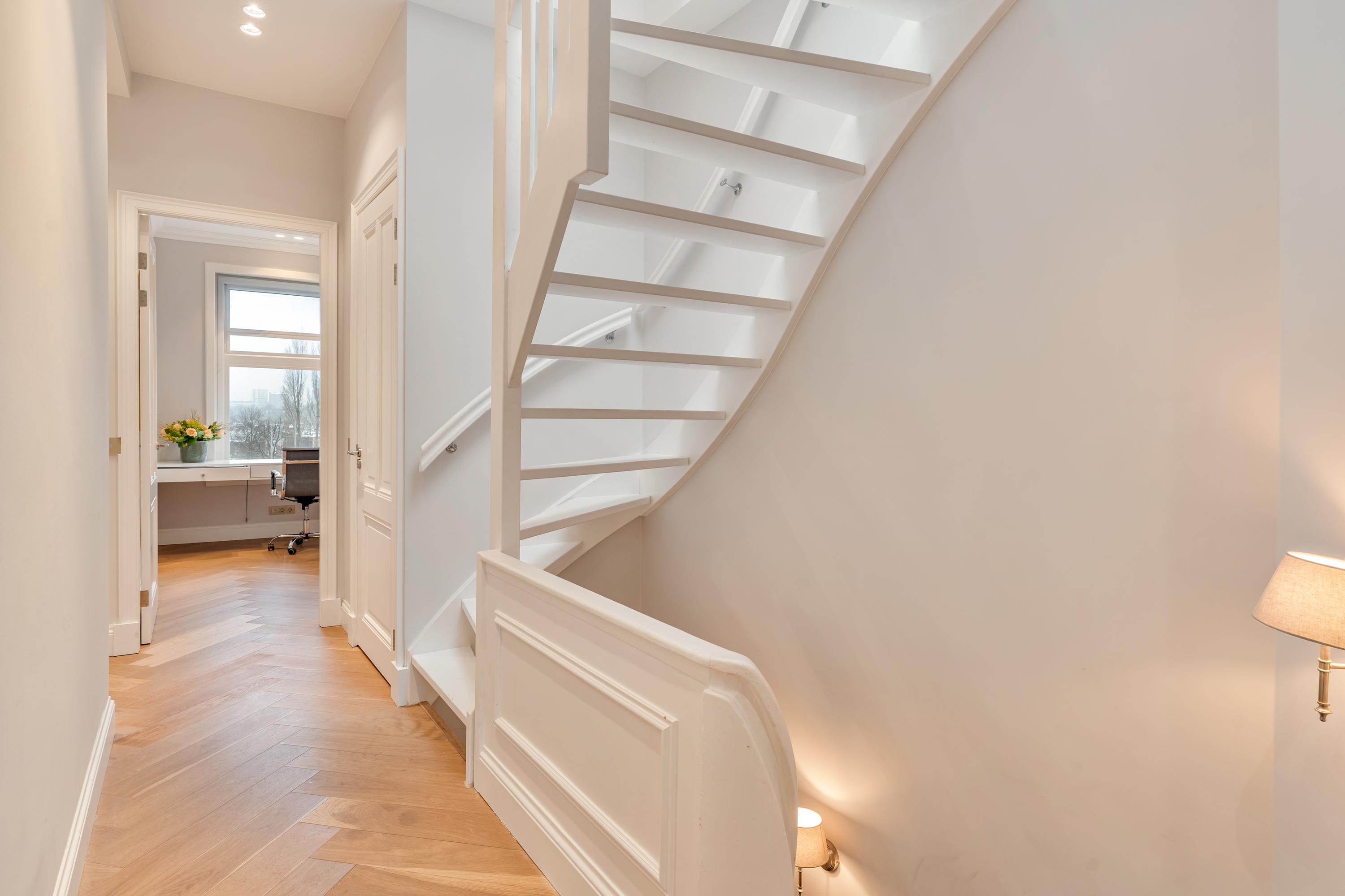 Entrance to the apartment is via the landing, which provides access to two storage cupboards and a separate toilet fitted with a wall-mounted WC and washbasin. The landing connects to all rooms. At the rear, you will find the spacious and bright living room, featuring a gas fireplace and a luxurious open-plan kitchen equipped with various built-in Siemens appliances. French doors open onto the charming balcony. The bedroom at the rear also provides access to the balcony. At the front of the apartment is the master bedroom with a bay window, as well as the third bedroom. Both rooms enjoy lovely views over the Amstel. The centrally located, high-end bathroom is fitted with a bathtub, walk-in shower, and a double vanity unit. An internal staircase leads to the elegant rooftop terrace, fully equipped with LED lighting, a sunshade, greenery, a complete outdoor kitchen, and an outdoor bath. From here, you can enjoy sunshine throughout the day and unobstructed views over the Amstel.