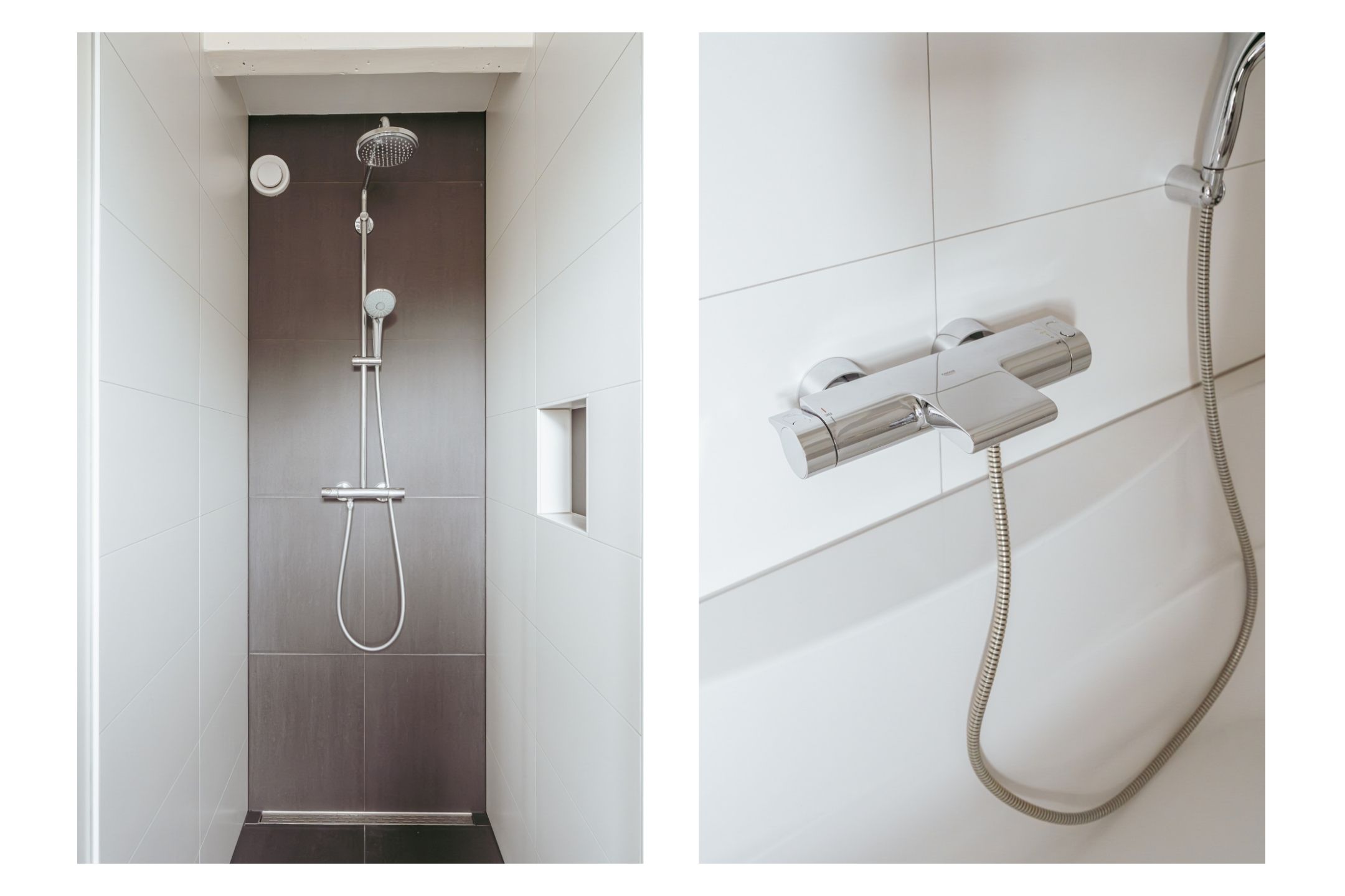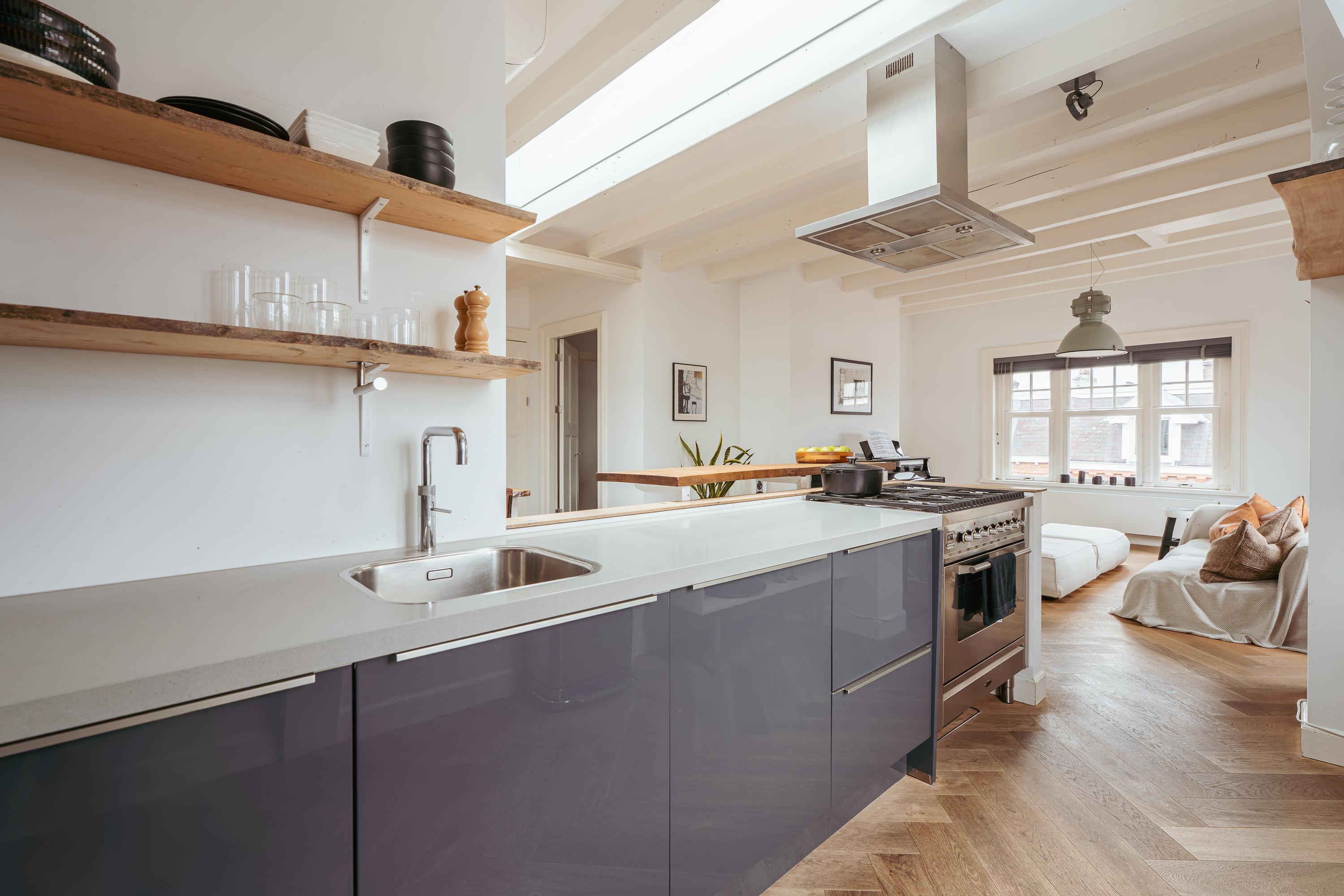 The open kitchen is centrally located and equipped with various built-in appliances, including an extractor hood, microwave, fridge-freezer, Quooker, sink, and dishwasher. A unique detail is that the bar, dining table, and wooden shelf behind the stove are all made from the same piece of oak (a rare feature nowadays, as trees of such large diameter are hardly found anymore). The table can be taken over free of charge, creating a harmonious and cohesive look throughout the living area. The kitchen also provides plenty of storage and forms the heart of the home. The apartment features two well-proportioned bedrooms, with the primary bedroom located at the front and the second bedroom at the quieter rear side. The modern bathroom, accessible from the hallway, is fitted with a walk-in shower, bathtub, toilet, and washbasin with vanity unit. From the same hallway, there is access to the spacious south-facing rooftop terrace of approximately 32 m², a peaceful spot to enjoy the sun and the view over the city. Additional built-in cupboards on the landing and in the living room offer extra storage space.