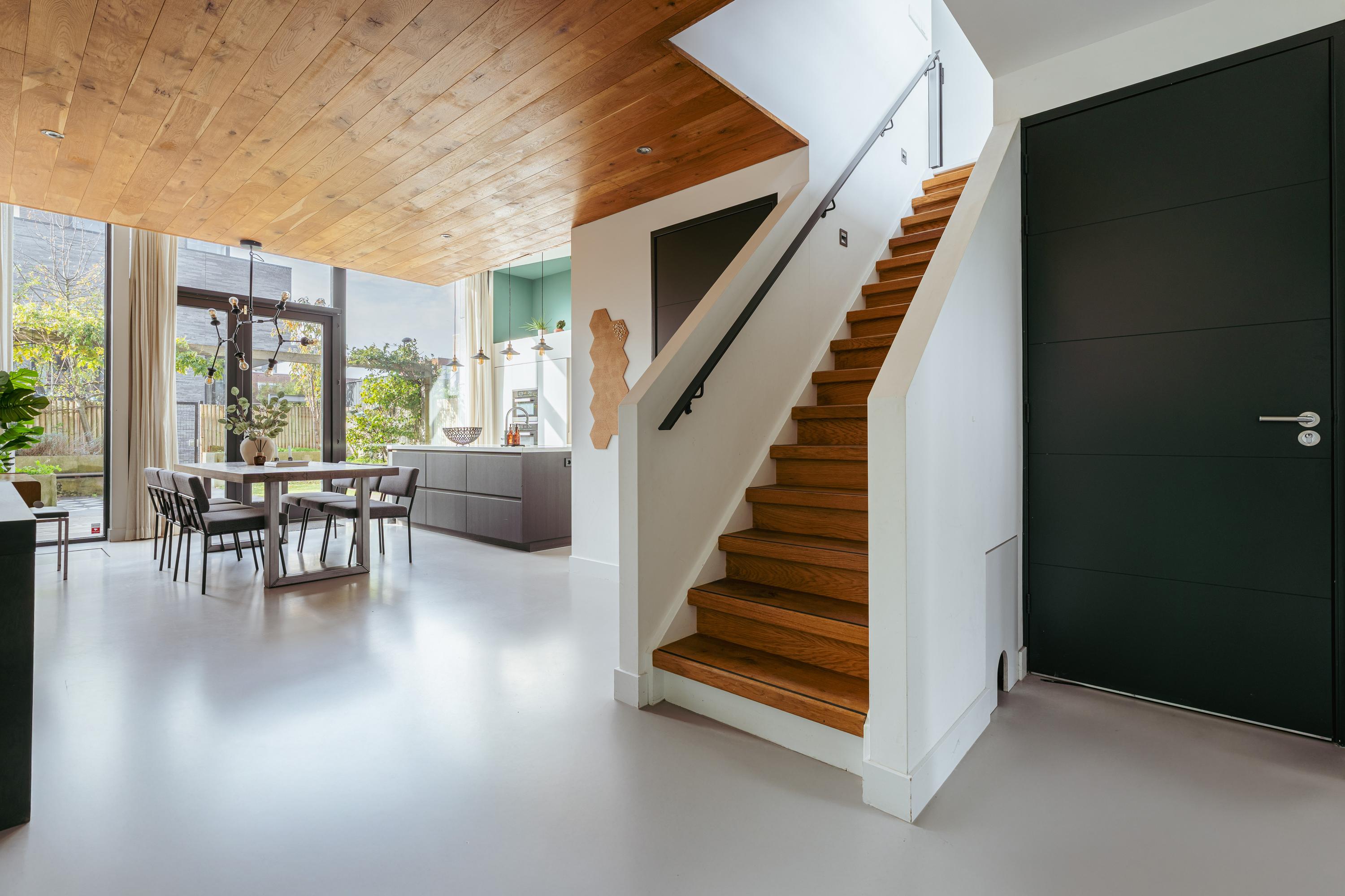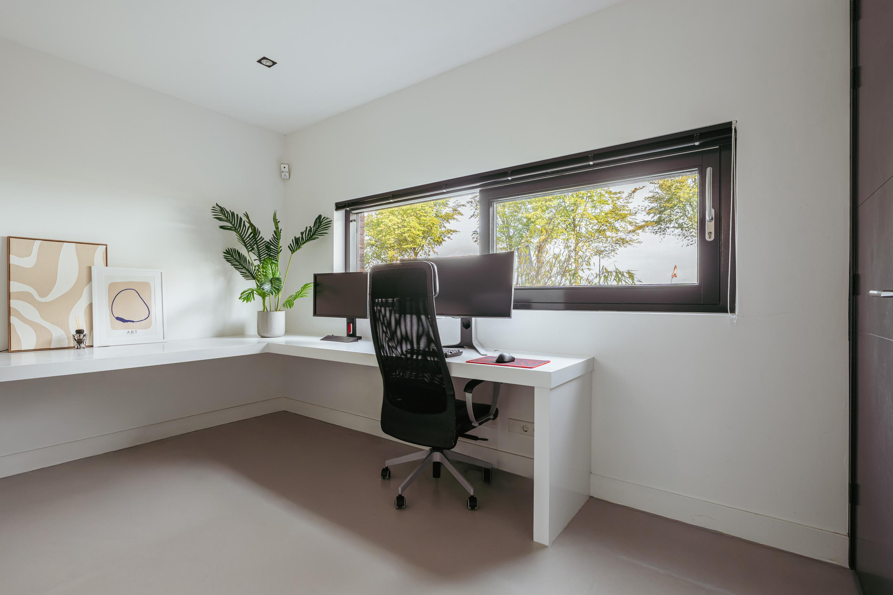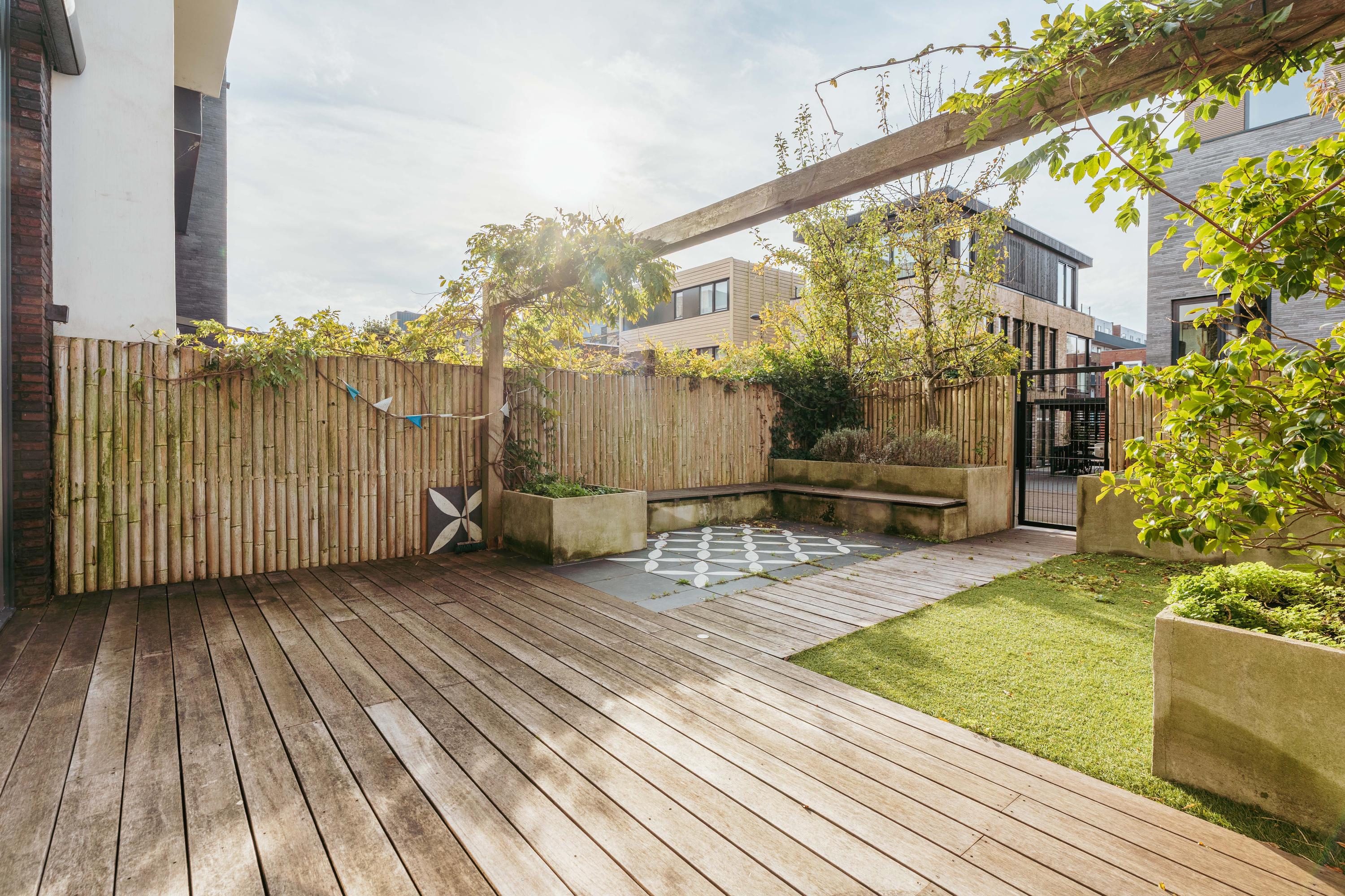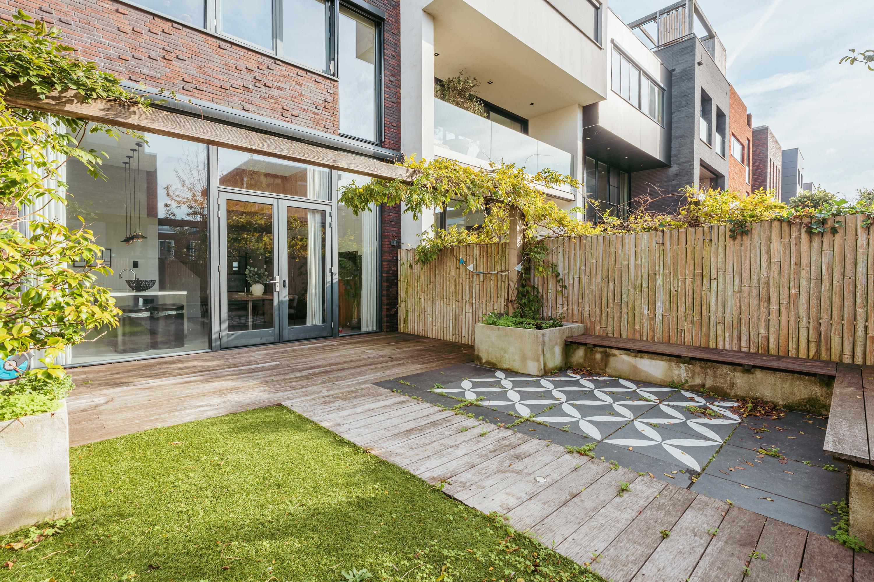 The home features five bedrooms and two bathrooms, complemented by a sauna, a private soundproof cinema, and several flexible rooms. The south-facing garden, approximately 54 m², connects seamlessly to the living kitchen through French doors, promoting both relaxation and sociability. Underfloor heating runs throughout, paired with energy-efficient HR++ glazing, district heating, and 17 solar panels for a gas-free, A-rated energy class environment. Two onsite parking spaces and an electric charging station complete this offering.