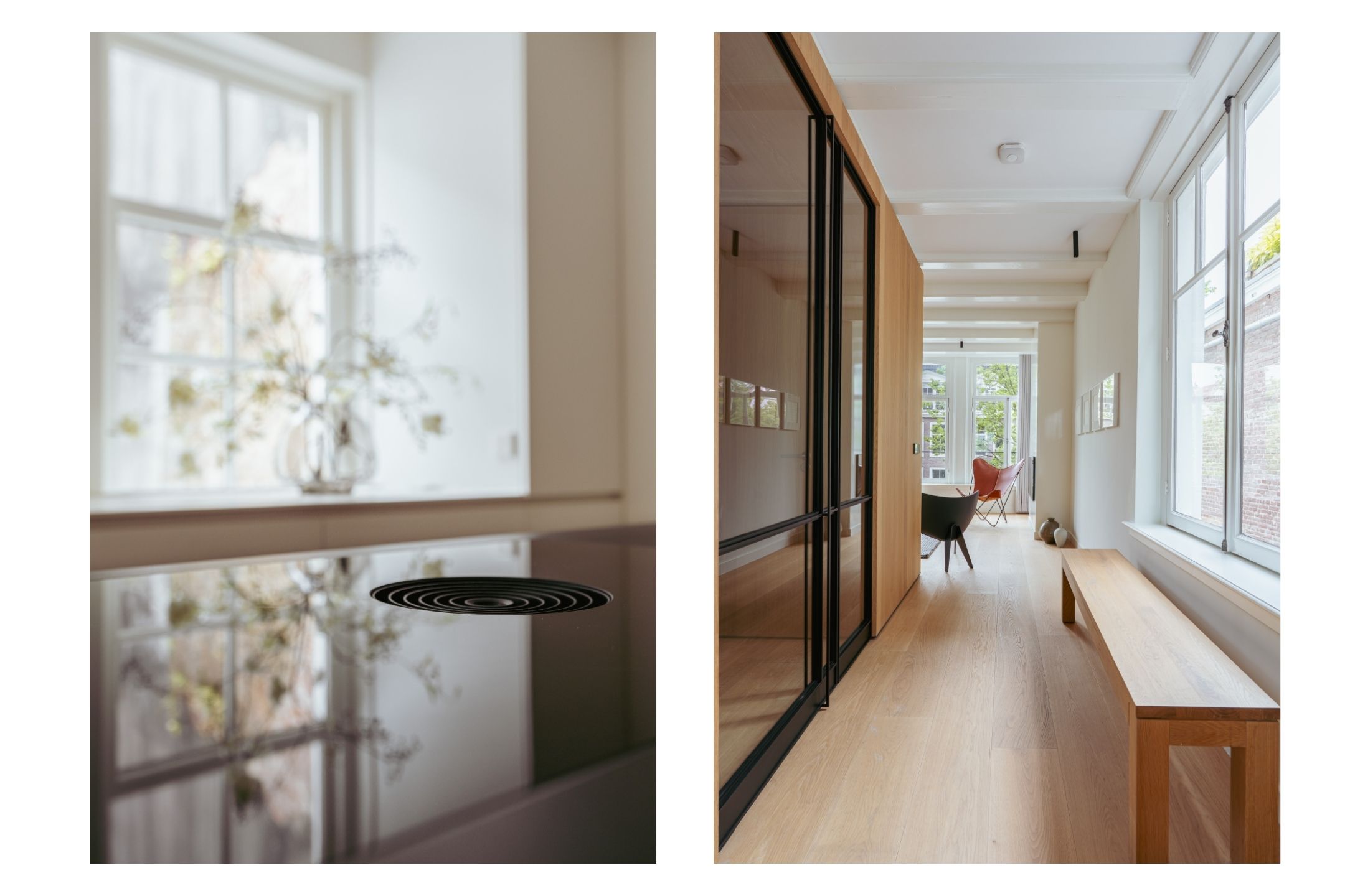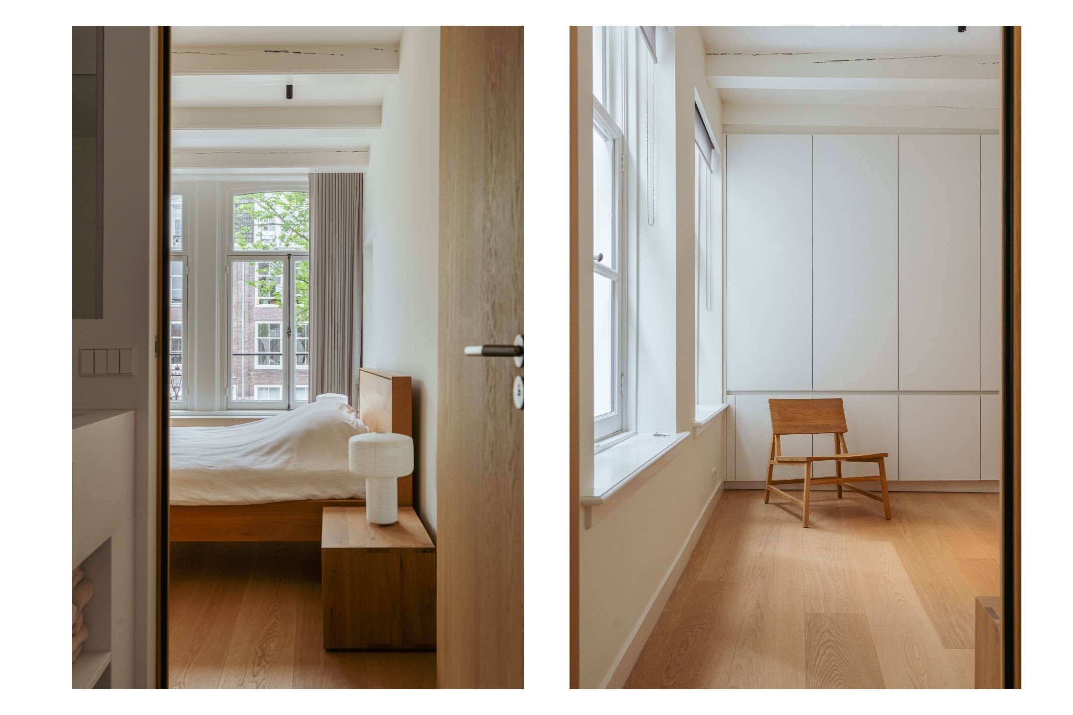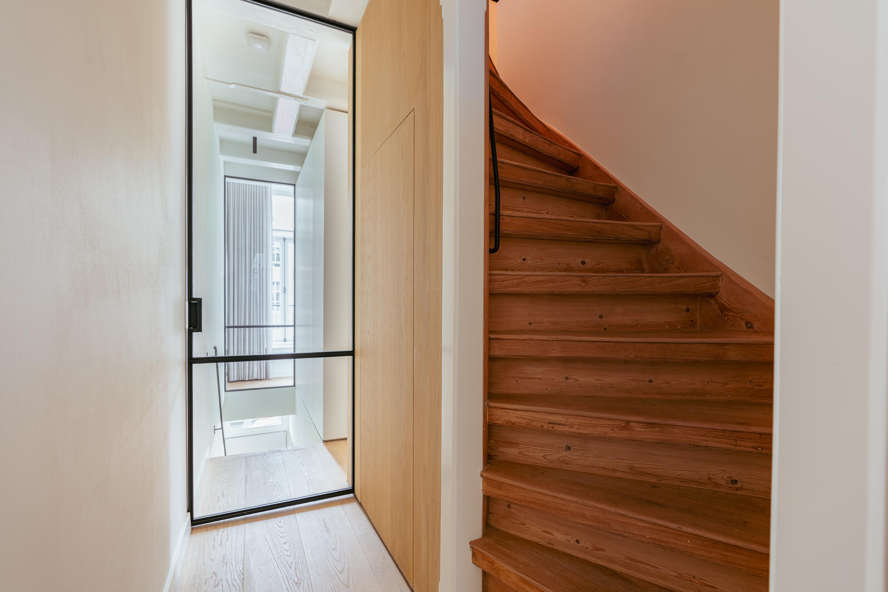 A tidy landing with built-in storage leads to two bedrooms. This floor features a beautiful wooden floor and premium finishes. At the front is a spacious bedroom with a custom-made built-in wardrobe that seamlessly integrates into the design. Large windows flood the space with natural light and offer a stunning view of the canal and historic facades. The second bedroom at the rear also includes built-in wardrobes. Centrally located on this floor is the modern bathroom, complete with a walk-in shower, sleek vanity, and stylish toilet — all finished to a high and timeless standard. Elegant steel-framed doors close off the bedrooms, combining functionality and design in harmony with the home’s aesthetic.
