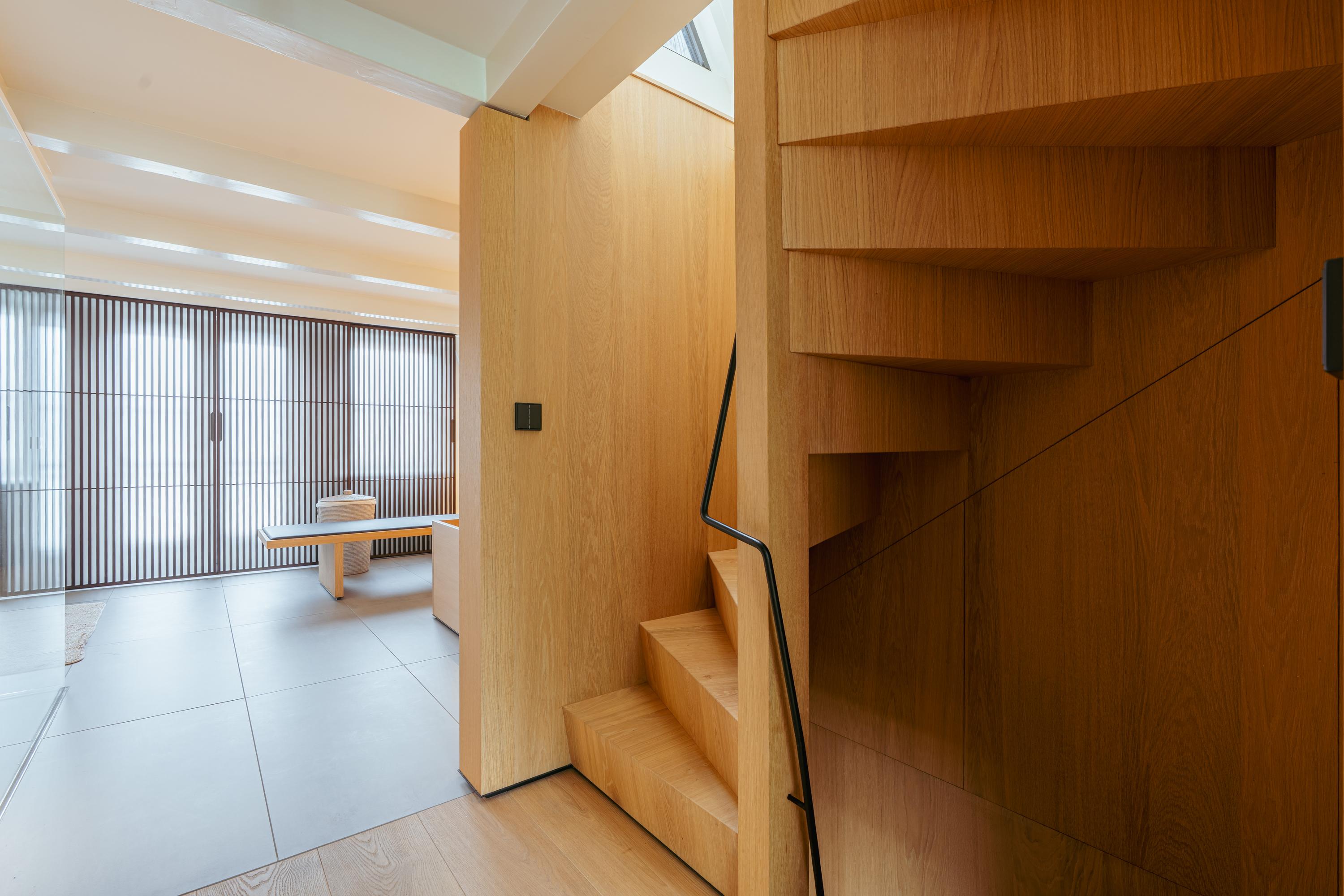 This upper floor is dedicated to a luxurious master suite — a private sanctuary of peace, space, and comfort. A central walk-in closet features custom cabinetry that is both functional and stylish. At the front is the cozy bedroom, where original ceiling beams and impressive ceiling height immediately draw the eye. Tall windows extending into the gable enhance the sense of openness and bring in wonderful natural light. Built-in wardrobes contribute to the clean, elegant look. At the rear lies the spectacular bathroom — a true wellness retreat at home. Here you’ll find a striking freestanding Agape Spoon Woodline bathtub, a double vanity with stylish cabinetry, a spacious walk-in shower, a steam cabin, and a built-in recliner for ultimate relaxation. The space is finished with warm materials and thoughtful design elements, including integrated lighting for a hotel-like atmosphere. Beautiful wooden sliding panels provide both shading and aesthetic appeal, offering privacy without blocking light. The toilet is separate from the bathroom.