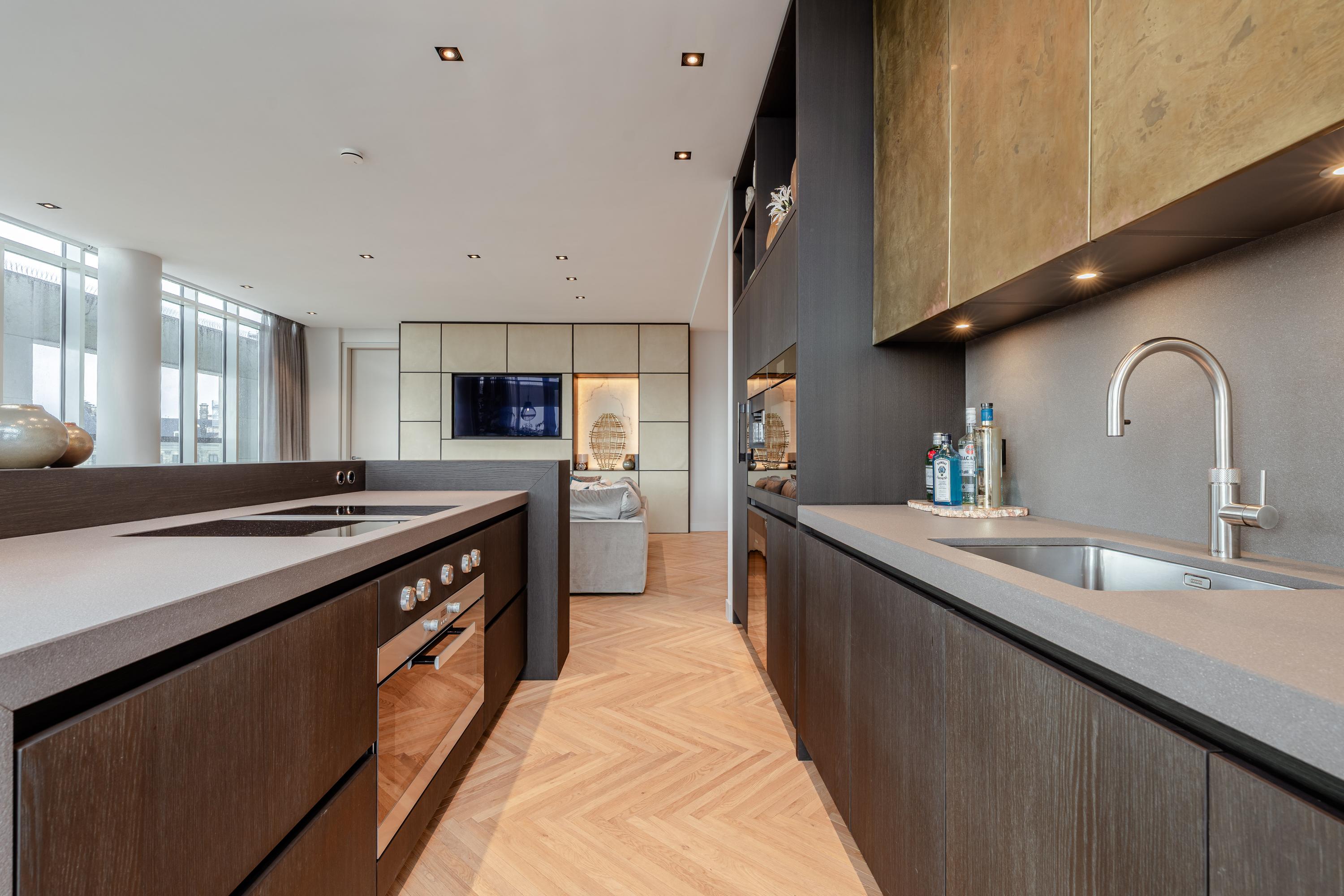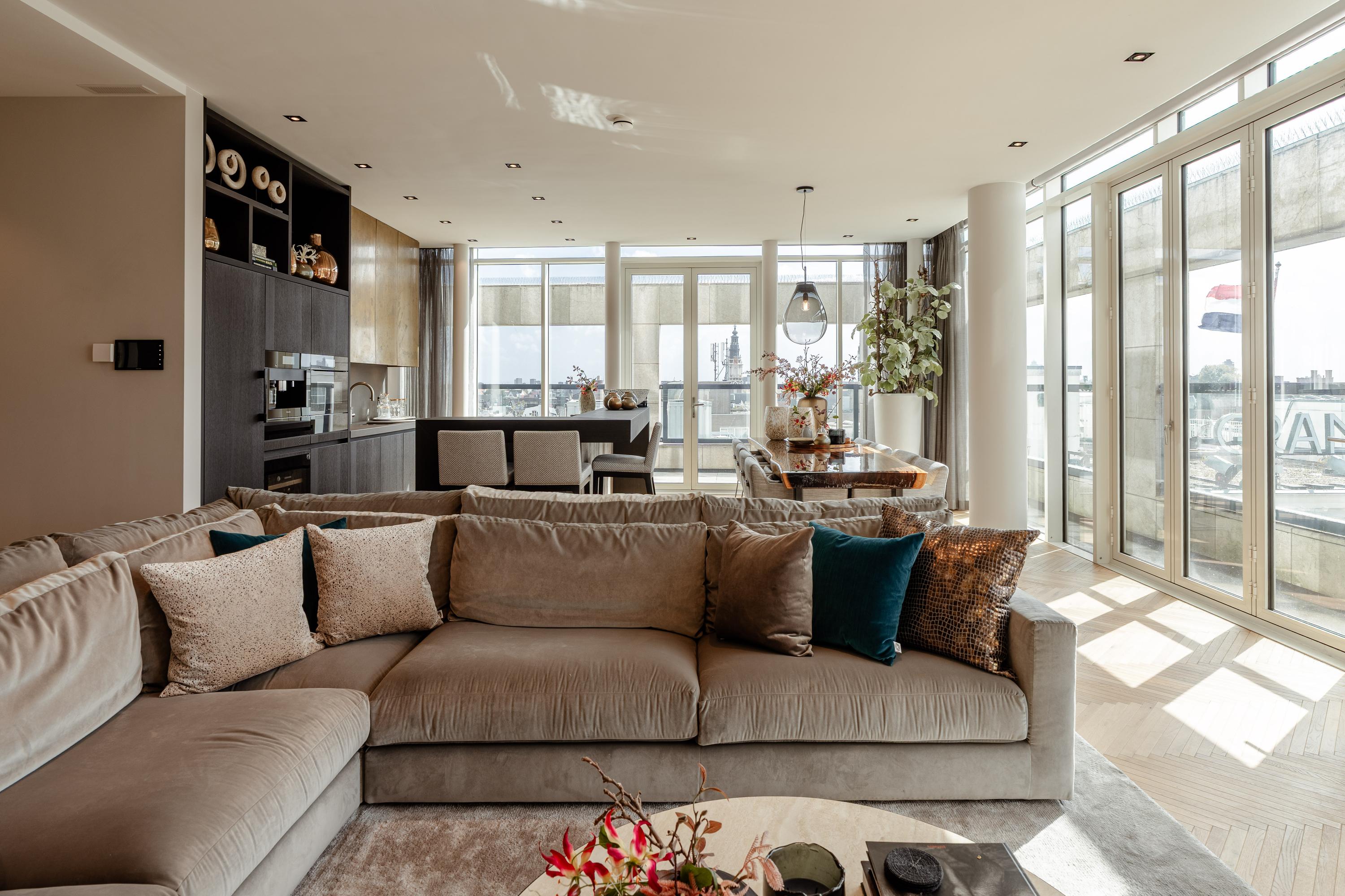 The open-plan kitchen with cooking island forms the heart of the home. Fully equipped with premium Miele appliances, including a wine cooler, steam oven, and coffee machine, it flows into the dining area and the large terrace, where you can enjoy a truly unique view over Dam Square.