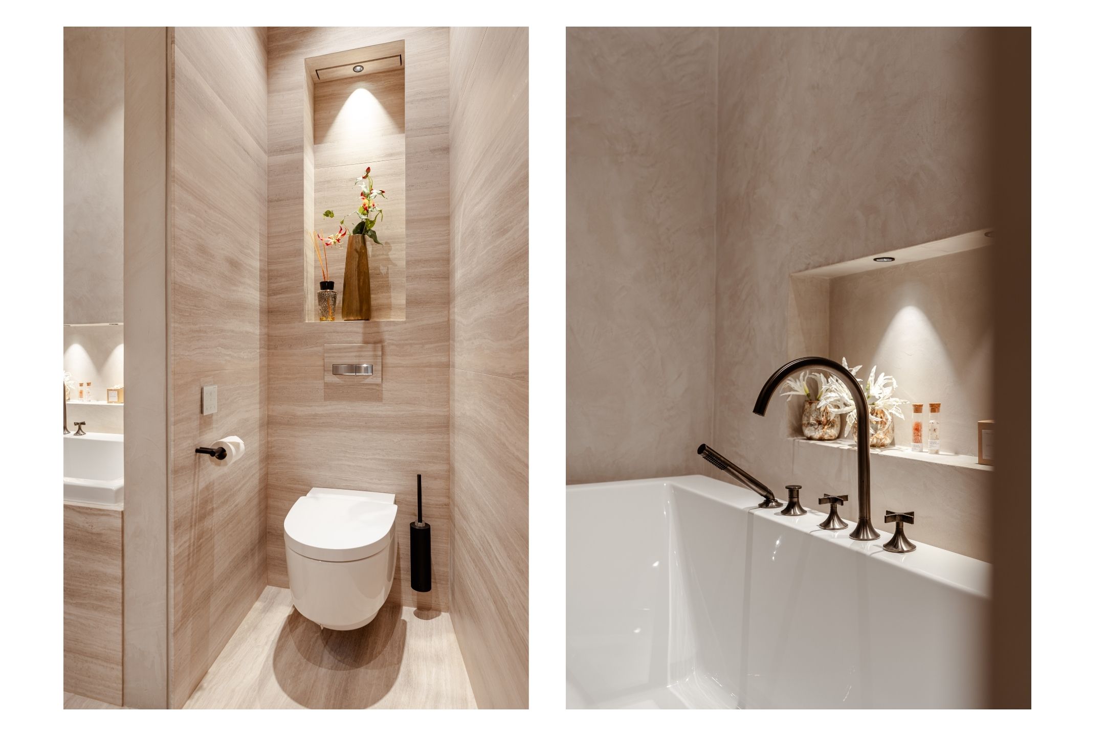 The apartment offers three bedrooms, each furnished with luxury Hästens beds. The master suite includes a private walk-in closet and a luxurious bathroom finished in marble and mosaic, featuring a bathtub, double washbasin, walk-in shower, and separate toilet. The second bathroom, designed in warm earthy tones, is also fully equipped and smartly laid out. Throughout the apartment lies a beautiful wooden floor, combined with underfloor and ceiling heating and cooling, recessed lighting, and electric sun blinds. A private storage room, as well as a technical and laundry room, are also included.