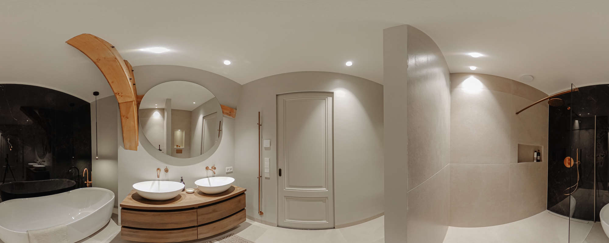 The front door to the apartment opens into a landing that gives access to storage space, a separate guest toilet and all the apartment’s other rooms. There is a large, bright living room (approx. 53 m2) and an open-plan kitchen of Italian design with a cooking island at the front of this floor. The luxury kitchen is equipped with a comprehensive range of built-in appliances and balances style and functionality perfectly. The sophisticated combination of white units with marble worktops and large units with the warm shade of walnut give the space a beautiful, atmospheric feel. A number of double doors open out onto the apartment’s sunny roof terrace.