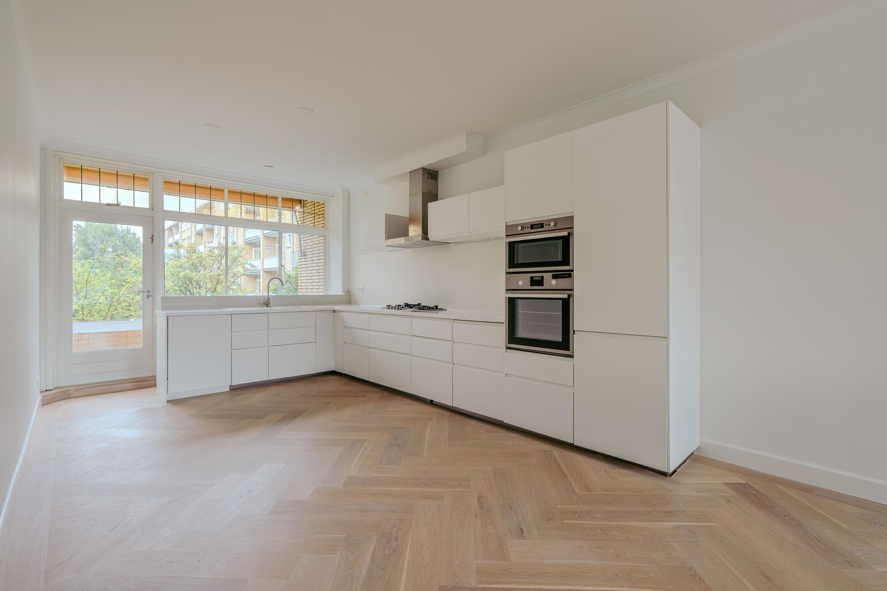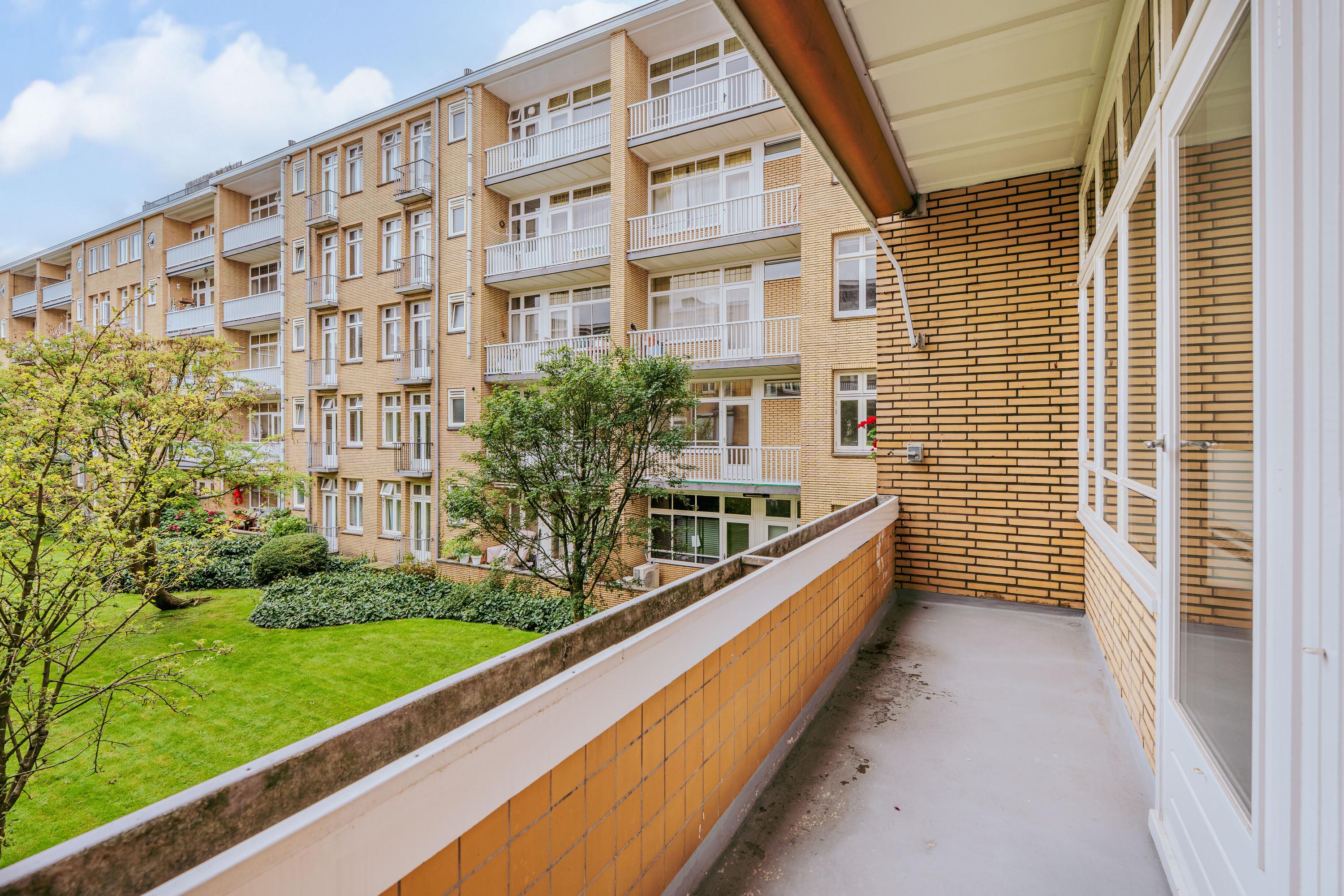 Via the well-maintained communal entrance with staircase and lift, you reach the apartment on the first floor. You enter into a spacious hallway from which all rooms are accessible. The living room is laid out in an L-shape and is particularly bright thanks to the many windows overlooking the beautiful Minervaplein. At the rear is the open kitchen, fitted with all necessary built-in appliances. The balcony is accessible from the kitchen and overlooks the beautifully landscaped garden of the Muzenhof.