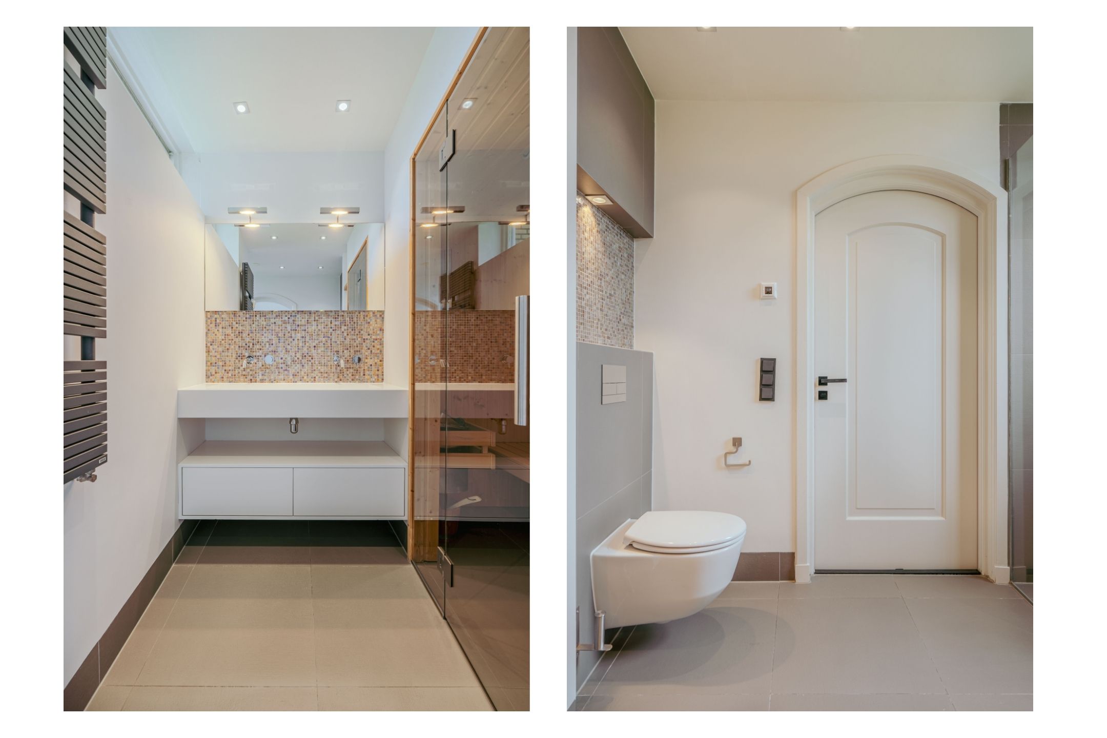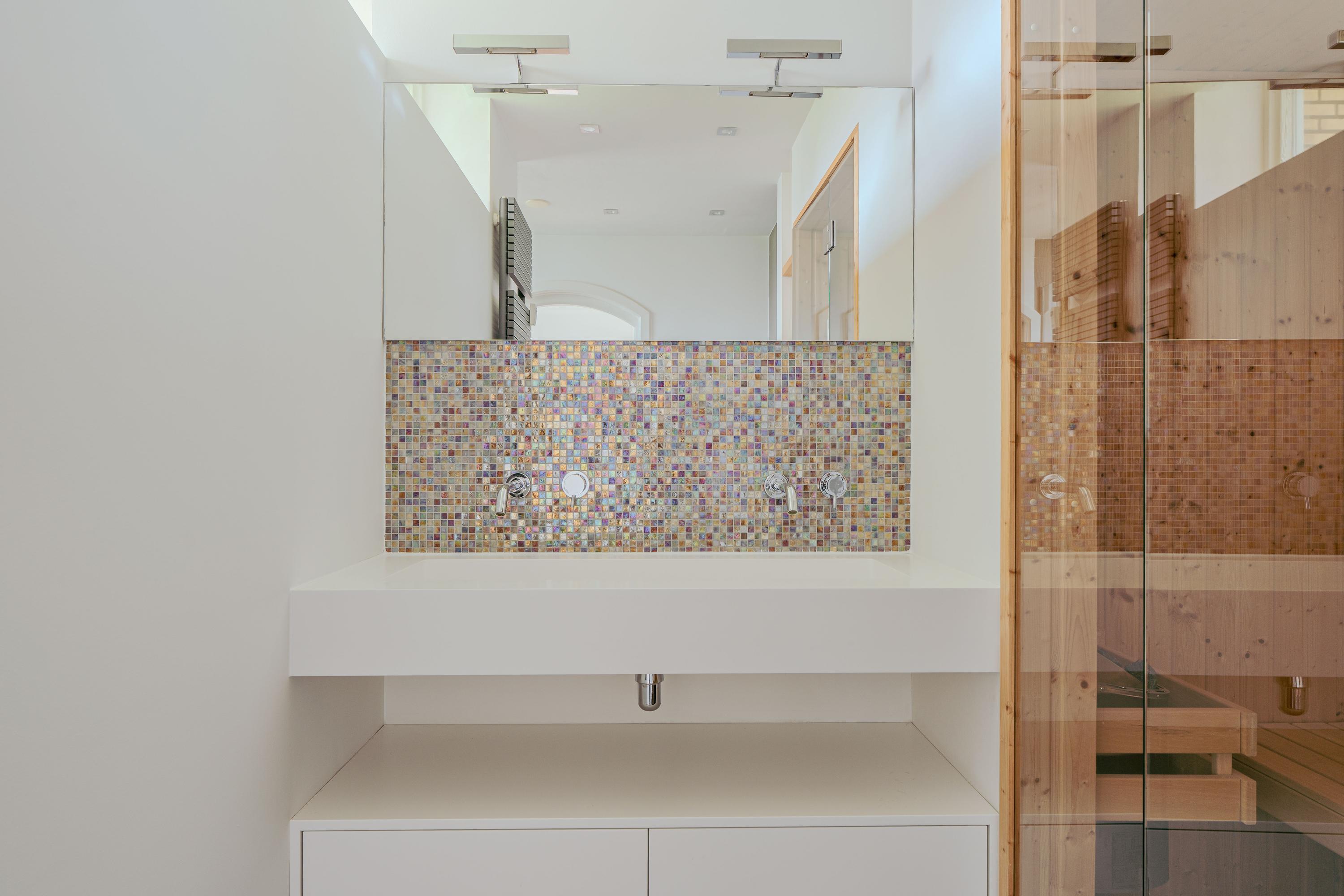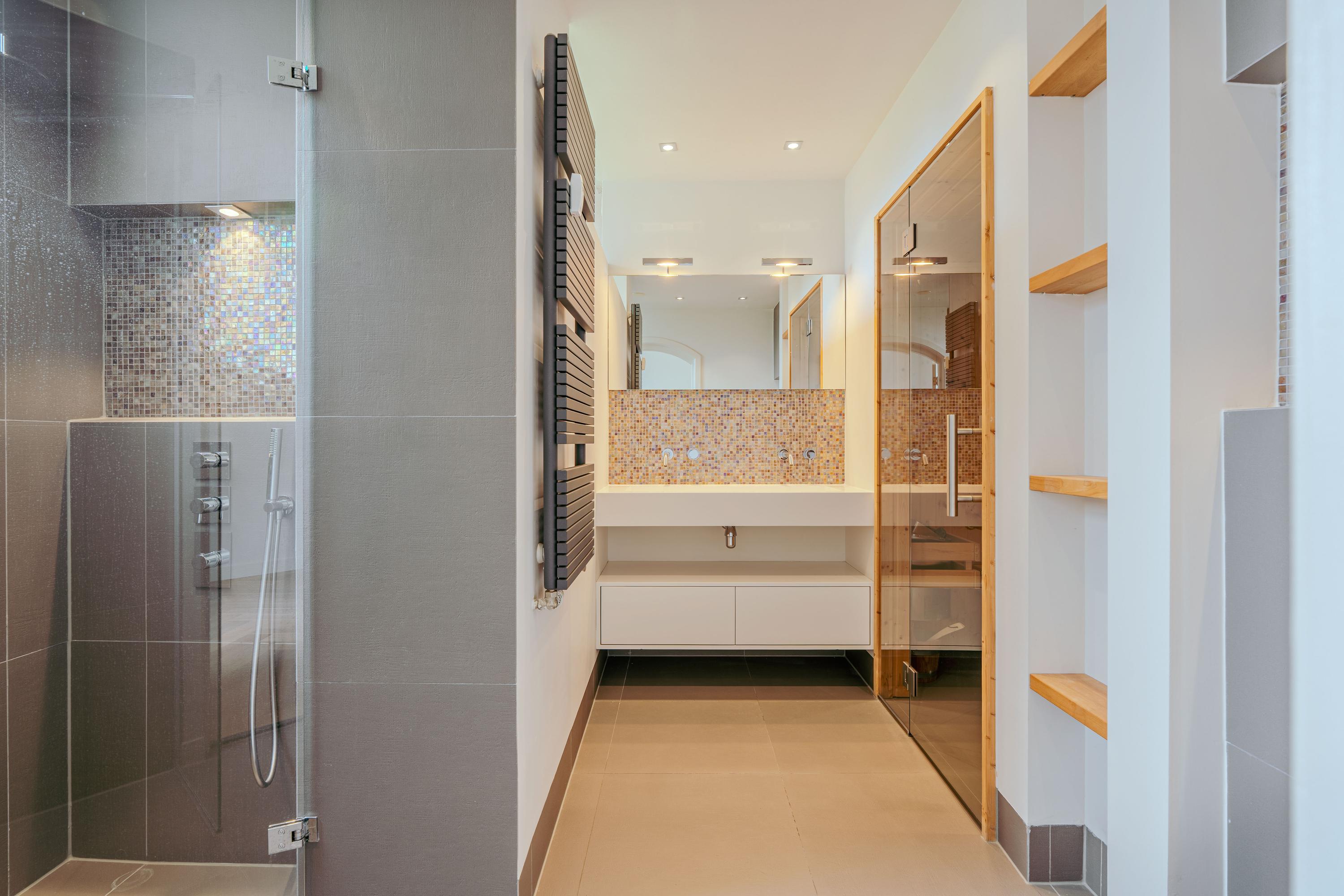 The master bedroom is located at the rear and has access to the spacious en-suite bathroom with walk-in shower, double washbasin, toilet and sauna. The second large bedroom is located at the front, and this too has its own bathroom with shower and washbasin. In the basement of the complex, the apartment also has a practical private storage unit of approx. 6 m².