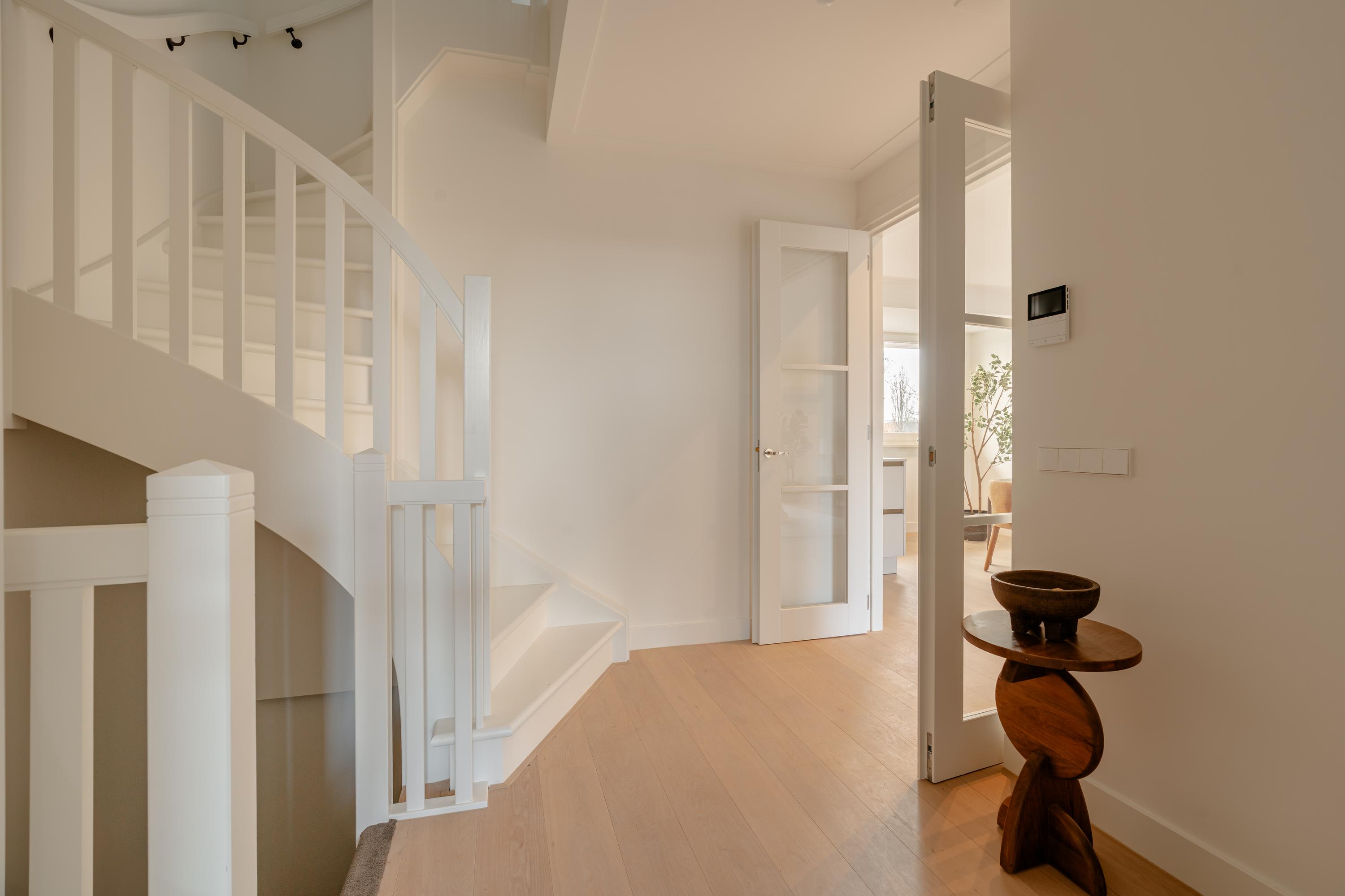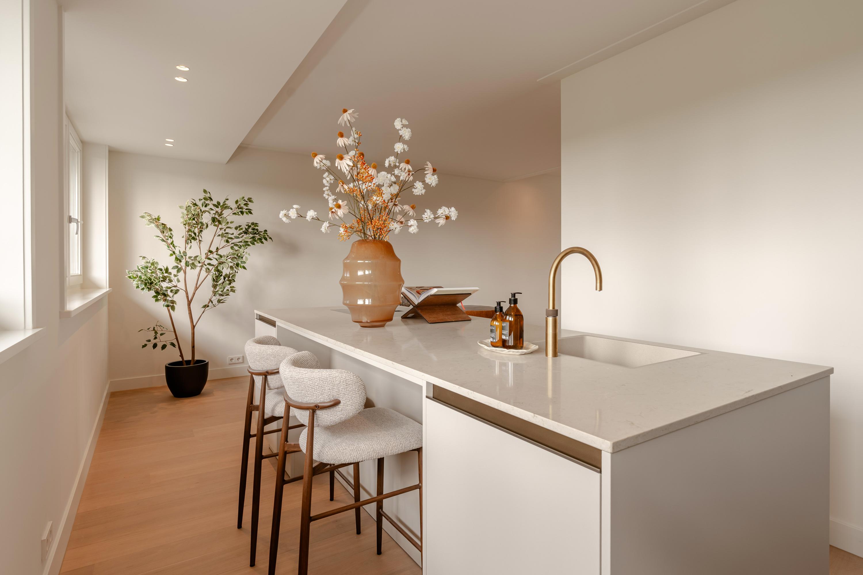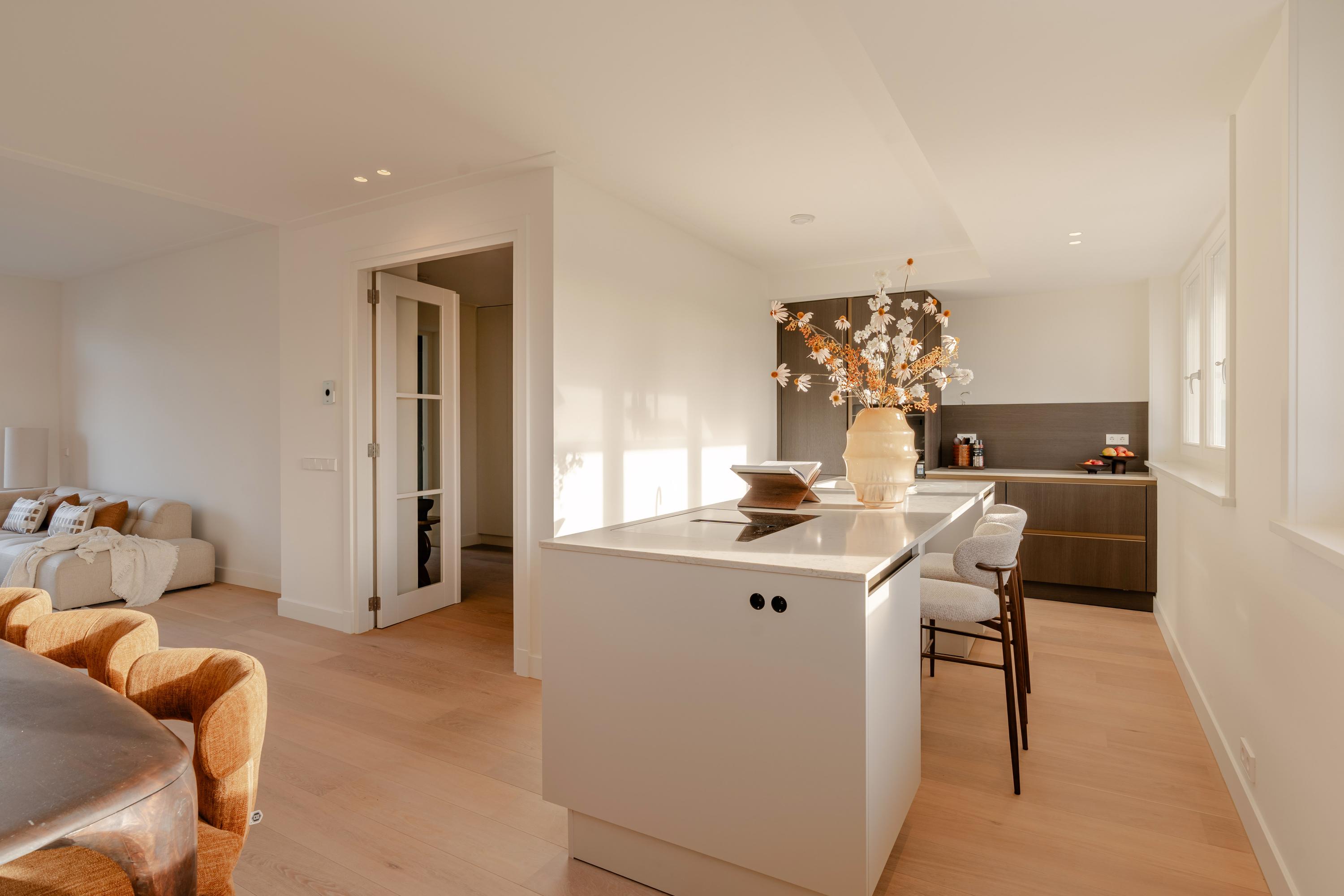 The open-plan kitchen is a true eye-catcher, fitted with high-quality built-in appliances: an induction hob with integrated extractor, dishwasher, combi-oven and Quooker tap. The combination of sleek handleless cabinetry and warm wooden accents gives this floor a modern yet inviting feel. From the living room you have access to a sunny southeast-facing balcony, perfect for a morning coffee or an afternoon drink in the sun.