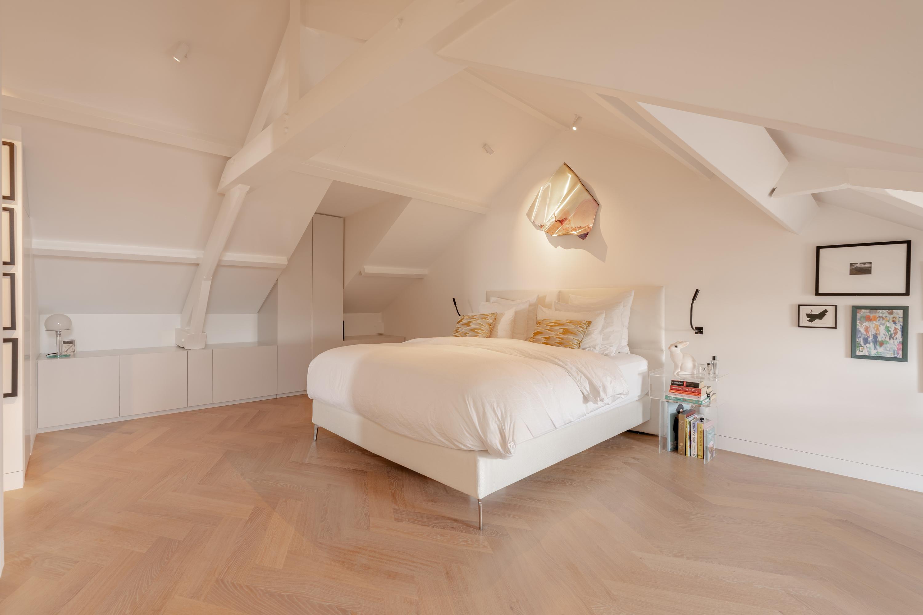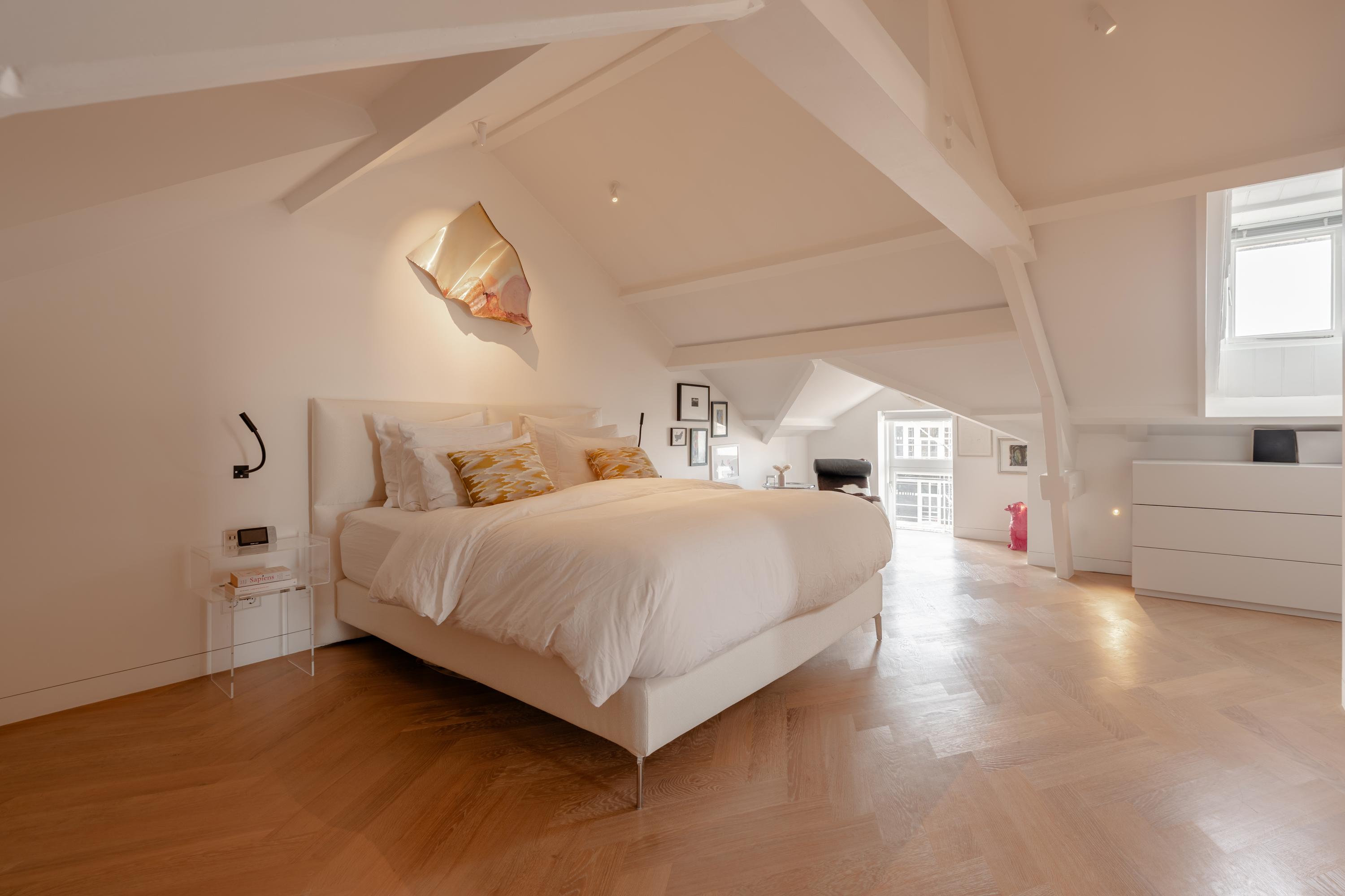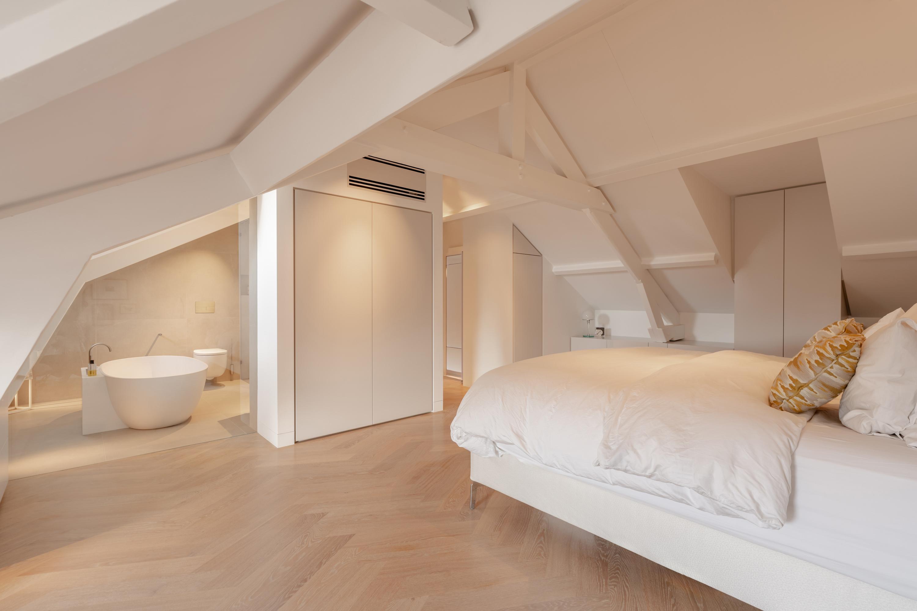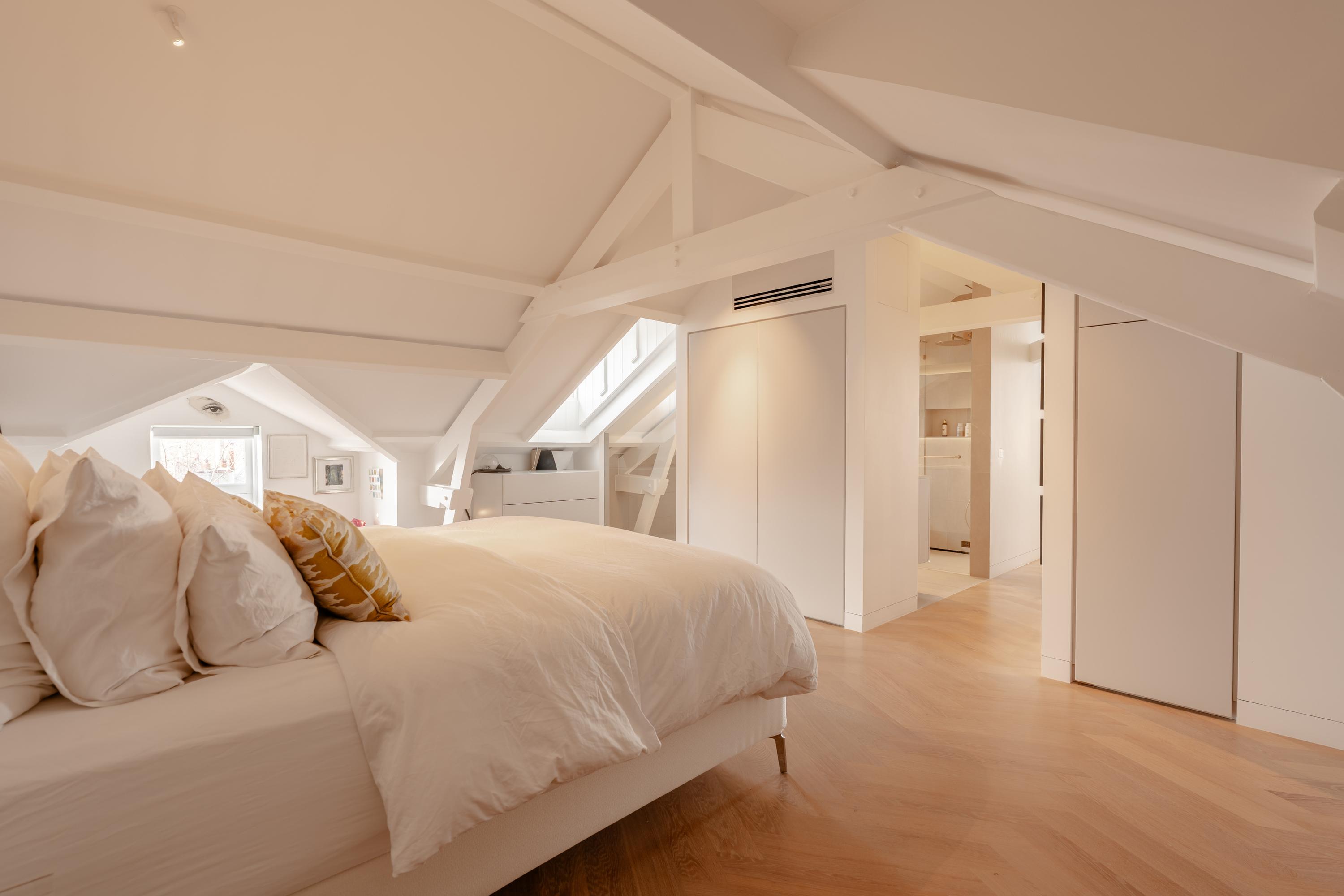 The spacious master bedroom, accessible from the living room, exudes calm and luxury. Exposed beams add character, while smart built-in storage solutions under the sloped ceilings ensure optimal use of space. Air conditioning is also installed here for maximum comfort. The adjoining en-suite bathroom is generously sized and finished to a high standard, featuring a double vanity, freestanding bathtub, walk-in rain shower, and toilet.