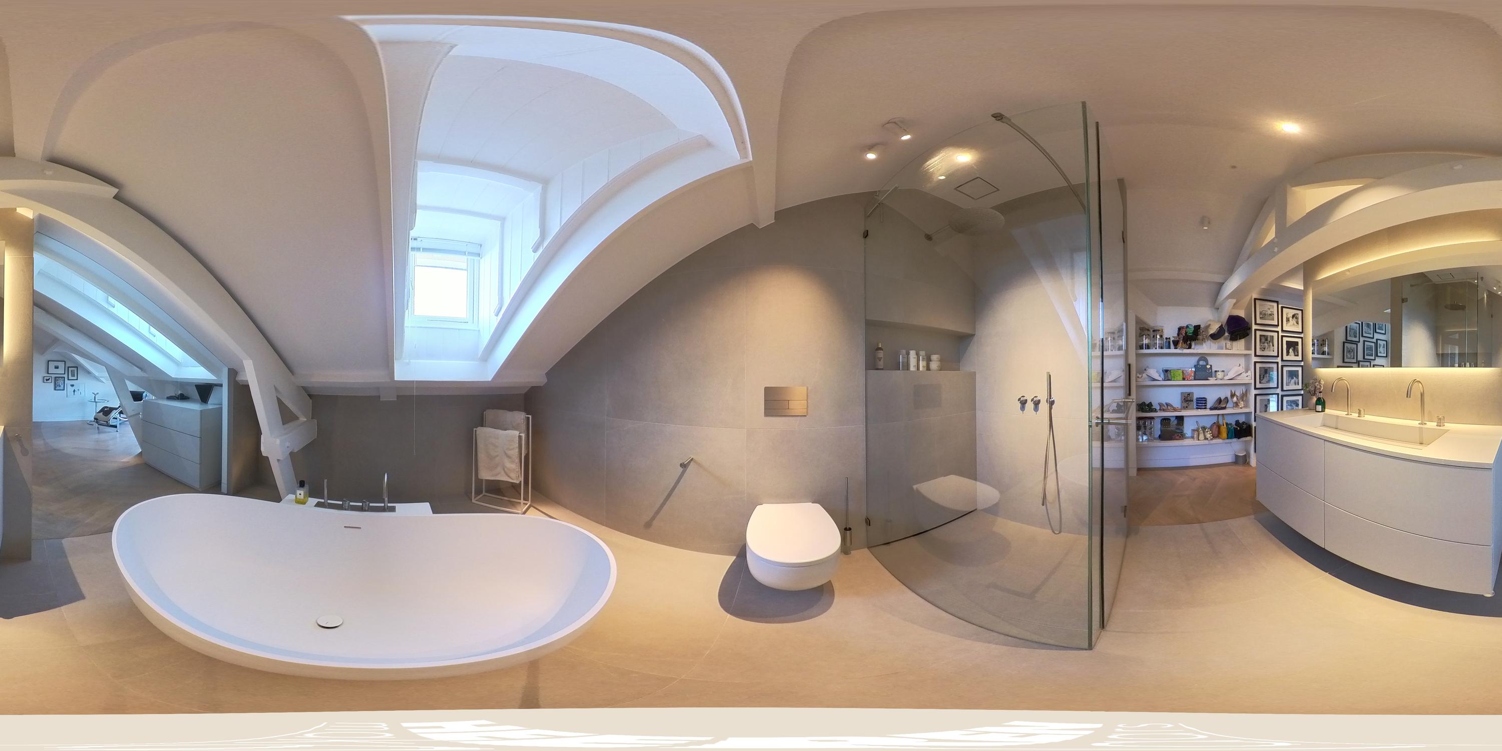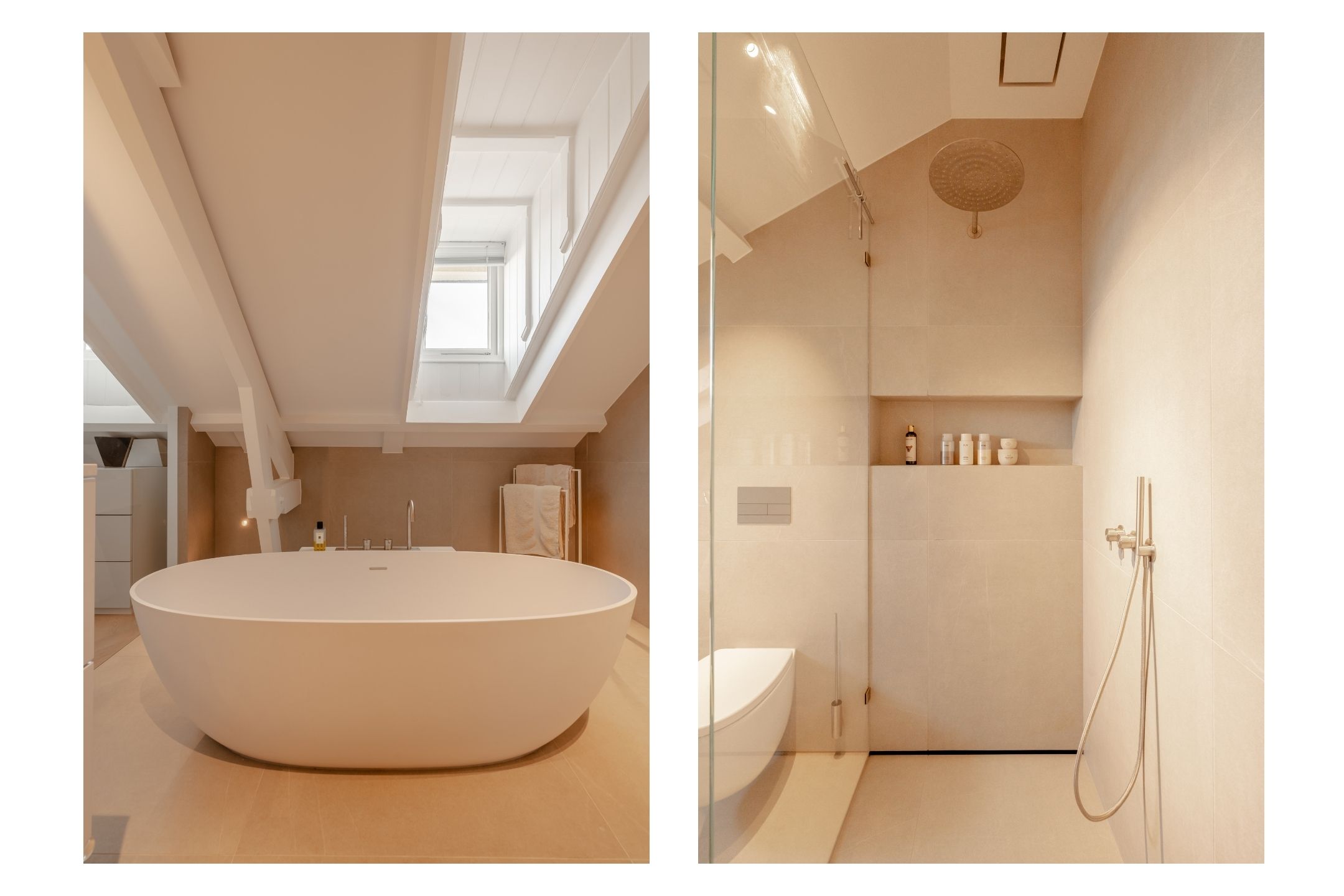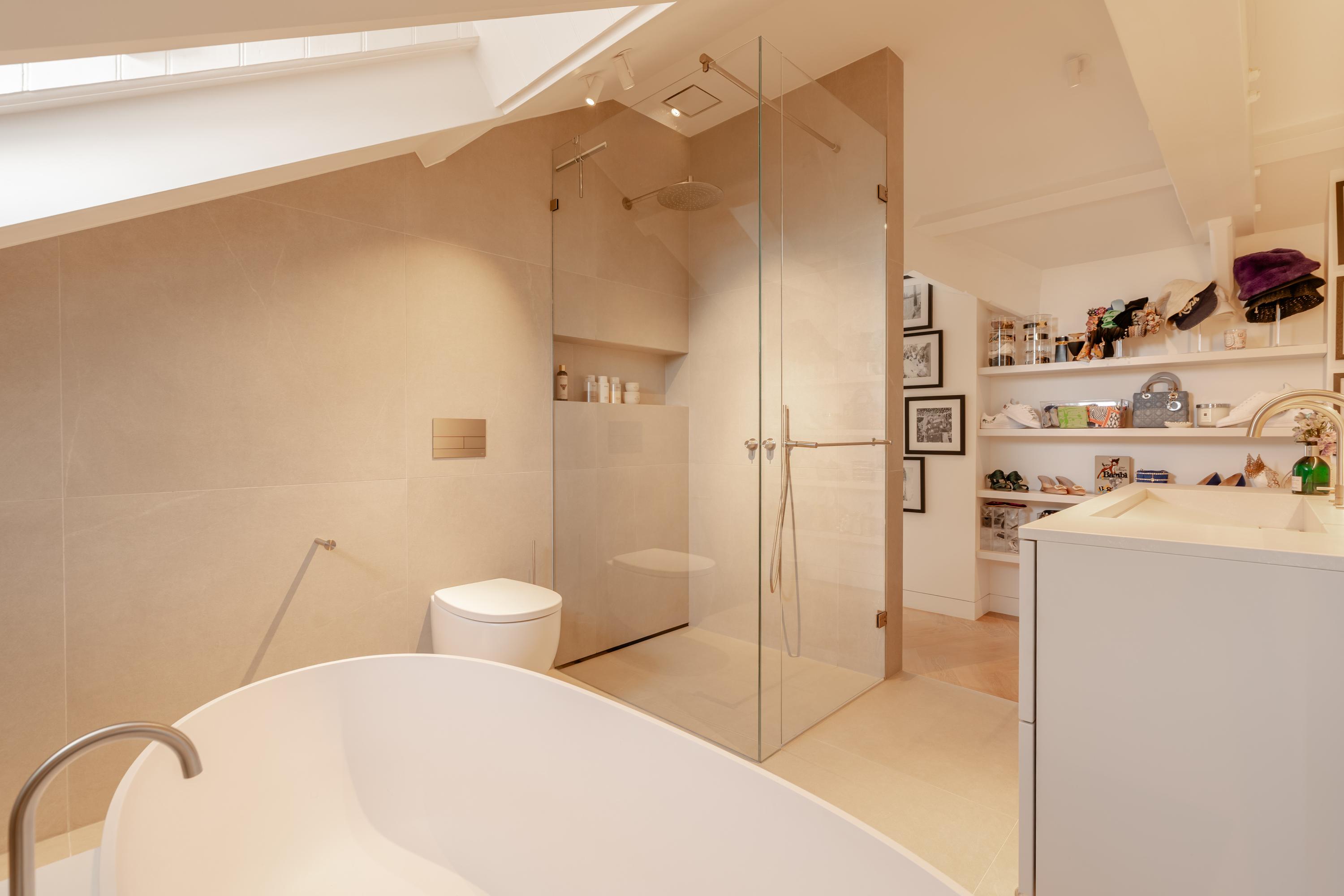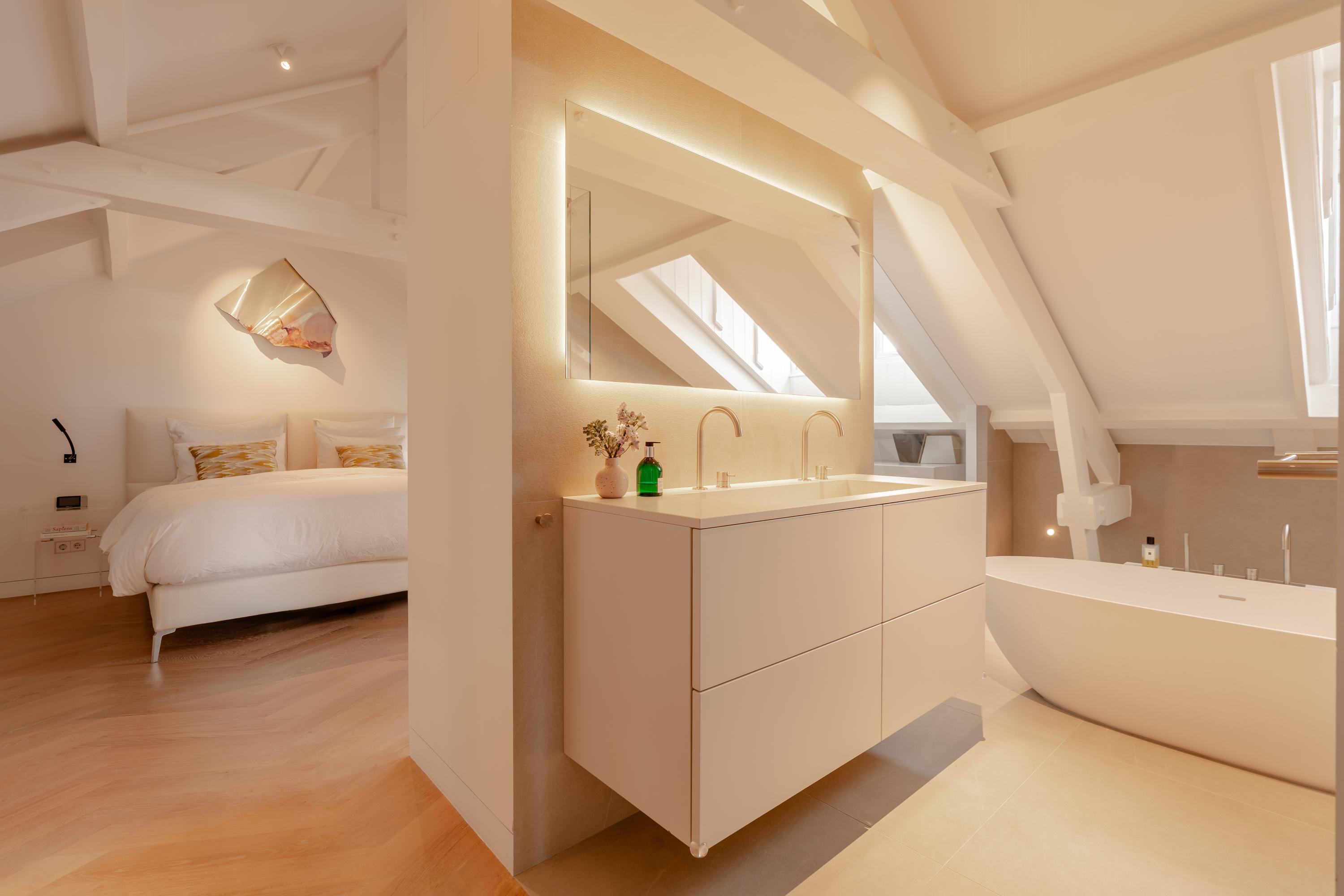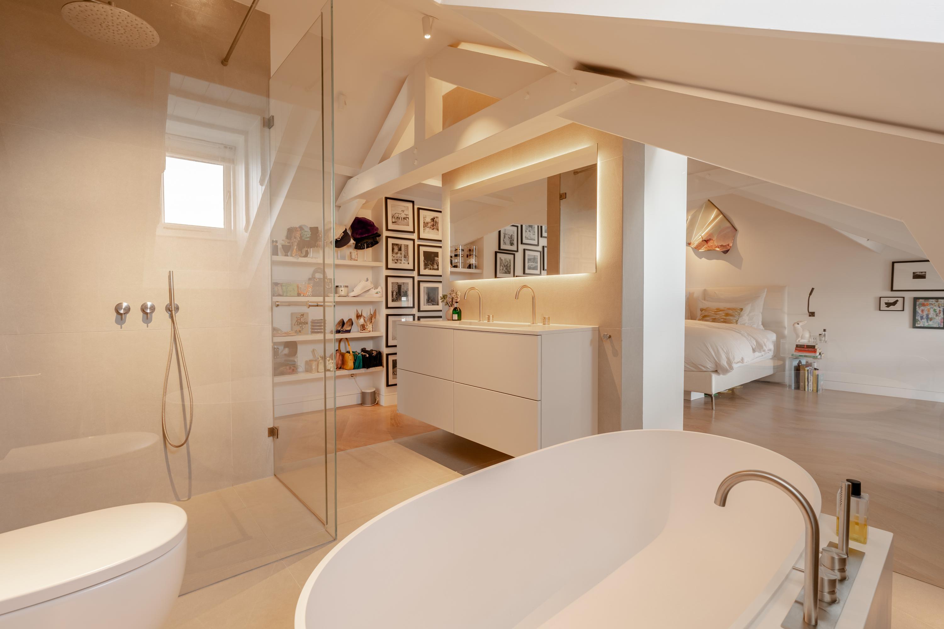 The spacious master bedroom, accessible from the living room, exudes calm and luxury. Exposed beams add character, while smart built-in storage solutions under the sloped ceilings ensure optimal use of space. Air conditioning is also installed here for maximum comfort. The adjoining en-suite bathroom is generously sized and finished to a high standard, featuring a double vanity, freestanding bathtub, walk-in rain shower, and toilet.